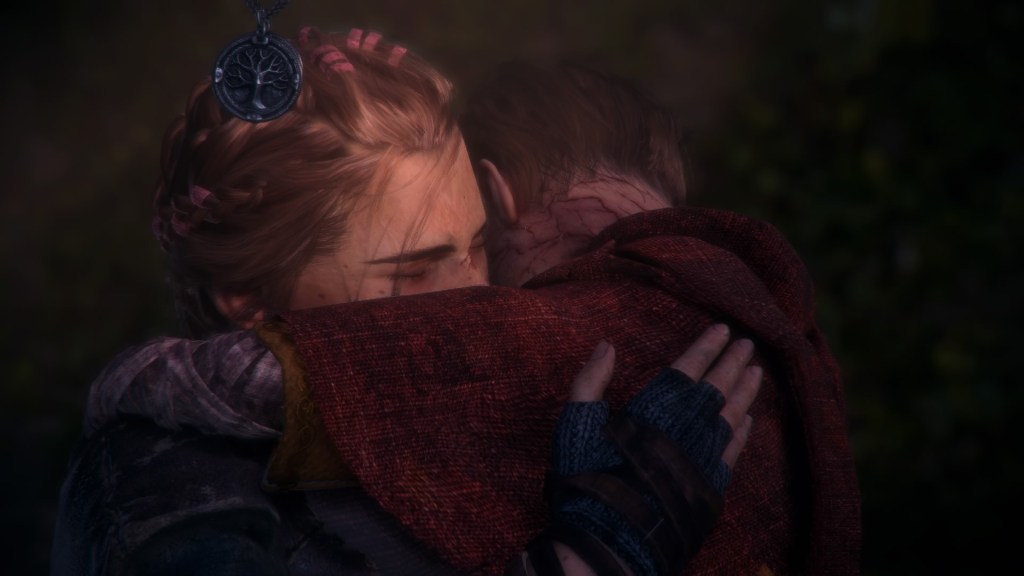 Notice how Hugo’s face is obscured in shadows here while Amicia’s isn’t. I believe this lighting choice shows the mismatch of their feelings in this scene. Amicia’s optimistic about the future and Hugo feels further from her than ever. I guess that’s a plus side of having it be a movie-like game. You get some dope movie-like lighting sometimes.