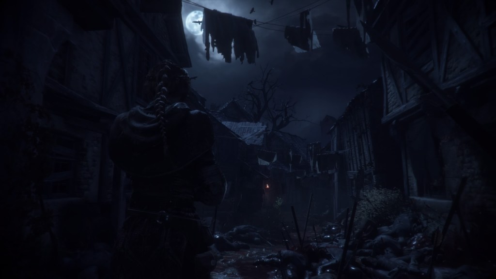 Amicia stands in front of a path to a house with piles of dead cows on either side. There's also a horse and some torches in the background.
