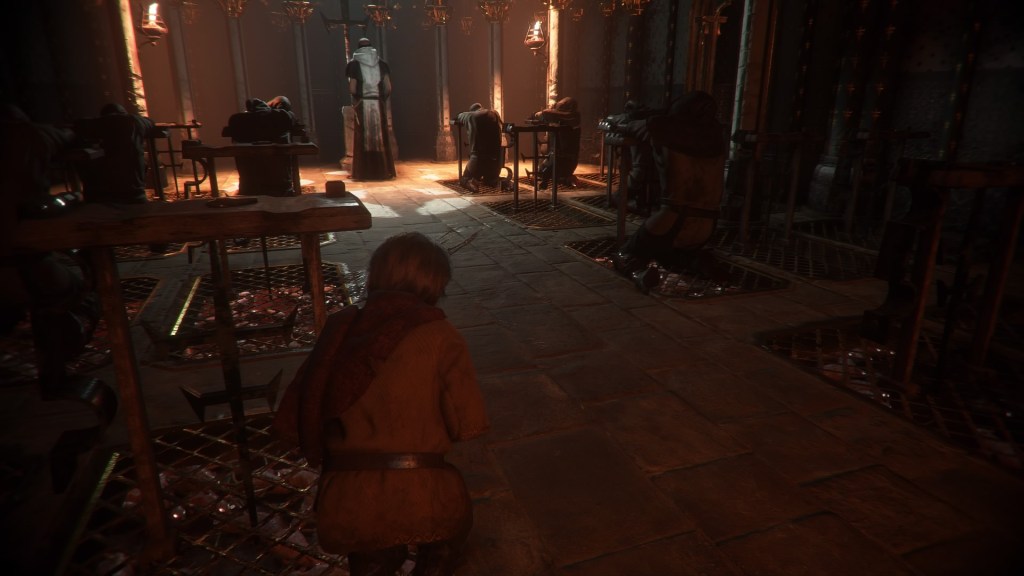 Eventually they get saved by a random grandma, and she gives the kids a brief respite. They got to rest a bit, get some clothes that stand out less, and upgrade Amicia’s sling. The kind elderly woman shows that not everyone in the town is caught in mass hysteria turning them into terrible people, it’s just that most of them are! Honestly, the psychological breakdown of communities during plagues is an interesting subject to me. There’s a lot of potential there, but ultimately this story is not about them. We only get a general idea of how the plague is affecting them, and the most important thing to know is that these conditions make the town inhospitable to the protagonists. So their next step is to go to a church that may or may not be completely abandoned. But hey, if it’s not abandoned there’s someone that could theoretically help out. So that’s where they go next.