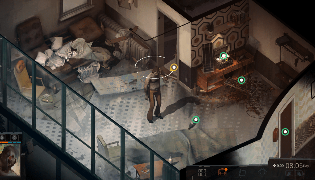 Yeah… Not our character’s finest moments. Scattered around the room you can collect a tie, a green blazer, a undershirt, pants (which you need to pick up) and a shoe (the other one is out on the balcony). And this is one of the game’s main features: your clothes. Throughout the game you’re able to come across numerous articles of clothing that you’re able to wear to provide slight boosts to some of your stats. Some increase stats more than others at the cost of lowering others, or simply raise one or two different stats. Rarely, you’ll come across items locked behind a sidequest, and they’ll likely be what give you the most boosts depending how hard you work for them. But more on that in gameplay. Searching your pockets you find your room key and you stumble out of the room and down the stairs