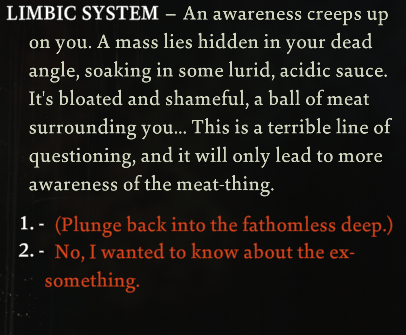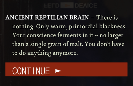You start by having a conversation with… an Ancient Reptillian Brain and your limbic system, and I’m of course told right off the bat this is going to be one of those weird games. Said aforementioned friend has a lot of wildcards up his sleeve for these trades (to be fair, so do I) and this appears to be one of them. This will likely be a very bizarre experience, but as long as it isn’t a FromSoft game (read: terrible, overcomplicated trash) I’ll take it.