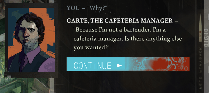 Yeah, you start at the midpoint of Harry Dubois’s stay in Revachol, and have no recollection of what you did on your first few days in town. But that’s okay, we’ve got Garte here to fill in the gaps.
