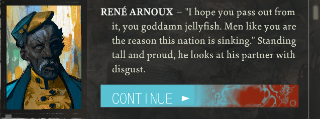 Rene Arnoux is another character that I can respect. As an old war veteran he voices his disgust towards those who let revachol fall to ruin, and wears his army uniform constantly, arguing with his neighbor about the state of the world and will rope anyone into the conversation just to vent his aggression towards. He also gets in a good line, though I’ve gotta deduct points for him calling a sea jelly a “jellyfish”. Get with the times grandpa, since 2007 they’ve been classified as jellies as they don’t have any bones!