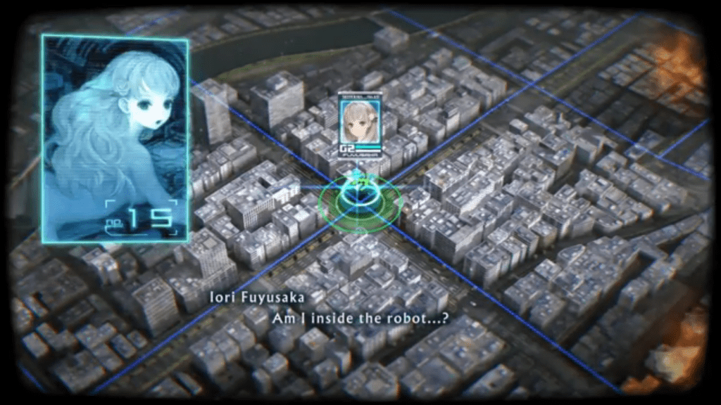 Our story begins in the thick of it in 1980s era Japan, where a large unidentified object made impact in Ashitaba. It begins to wreak havoc, destroying everything in its path while the populace run in fear of it believing it to be the end of the world. One girl in particular however, doesn’t run from the titan but towards it, standing beneath a crossway over a once busy street. This is one of 13 protagonists, Iori Fuyusaka who without hesitation, lifts up the hem of her skirt above her right leg and swipes over her calf with her left arm, “initiating” a blue light to emit from the area. Electricity crackles behind her as a colossal mech forms in the space, standing in position as glass windows shatter and dust is kicked up from it’s impact. A blue light envelops Fuyusaka and she warps inside of the mech, prepared to battle the monster and save Japan.