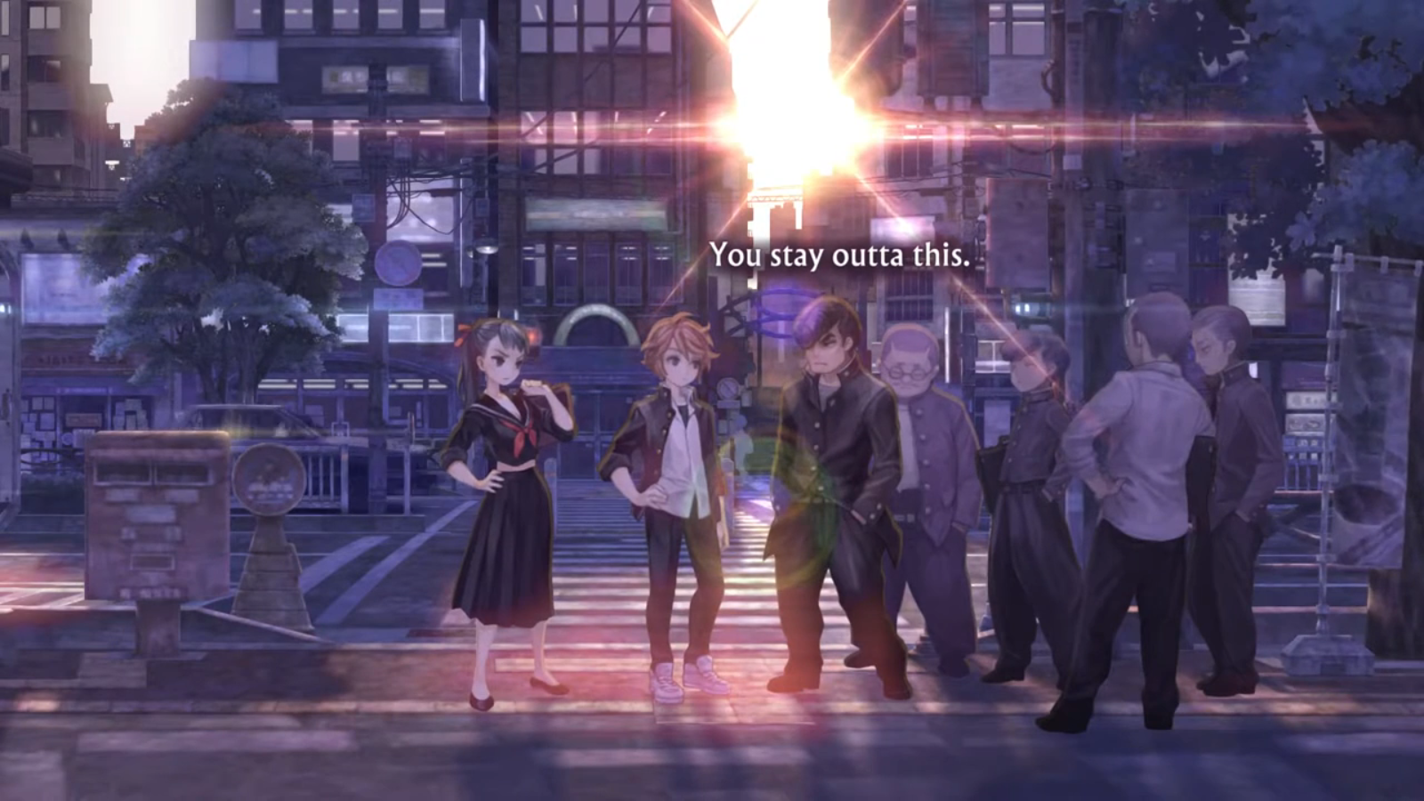 Nenji is understandably not pleased at the girl’s ridiculing of his hairstyle, so Gouto steps in to diffuse the tense situation. Once Ogata leaves, Gouto reprimands Tomi for her recklessness, and reminds her that Shikishima industries is responsible for bringing them there, and that they should respect the environment, not so subtly suggesting that they could send her back if she were to cause problems. Despite that, Tomi goes on to research as much as she can to get leverage on Shikishima, all the while befriending Miwako Sawatari and Iori Fuyusaka and trying to not spoil things from the future (because this is the 1980s, the internet didn’t exist and Miwako doesn’t know what that is). Her story comes to a head during another heated scuffle between her and Ogata, with Miwako trying to act as a peacekeeper when a bright light engulfs them, teleporting them to a ruined city.