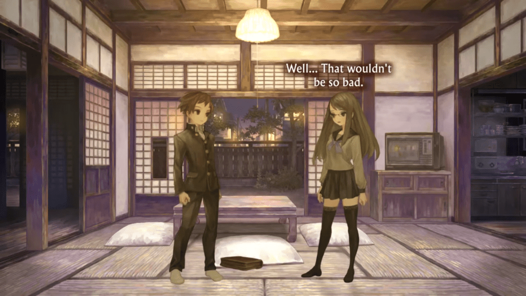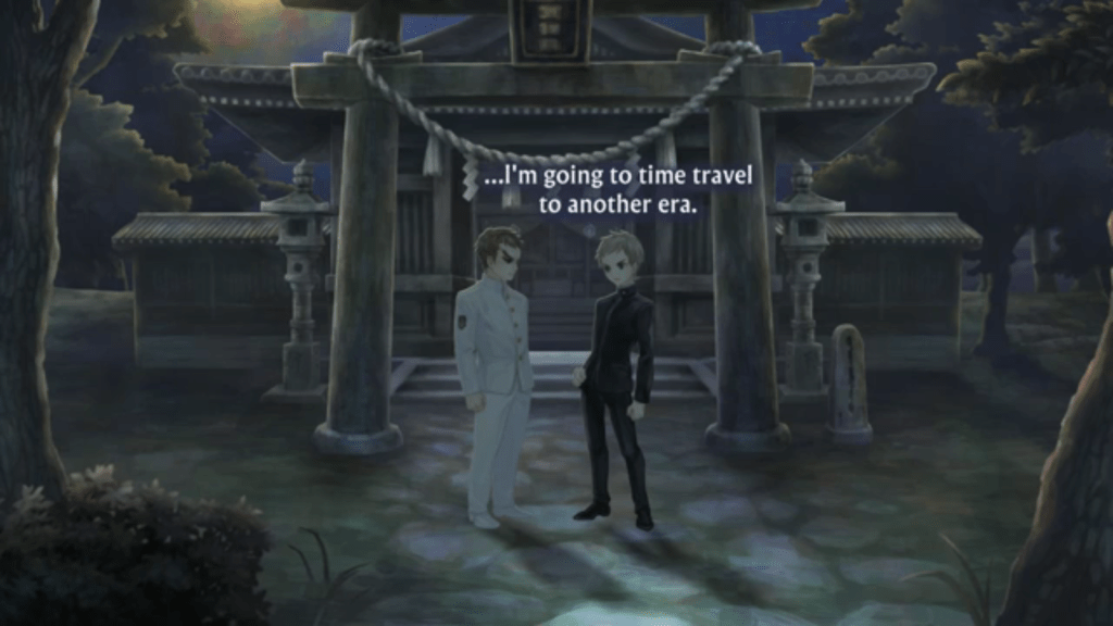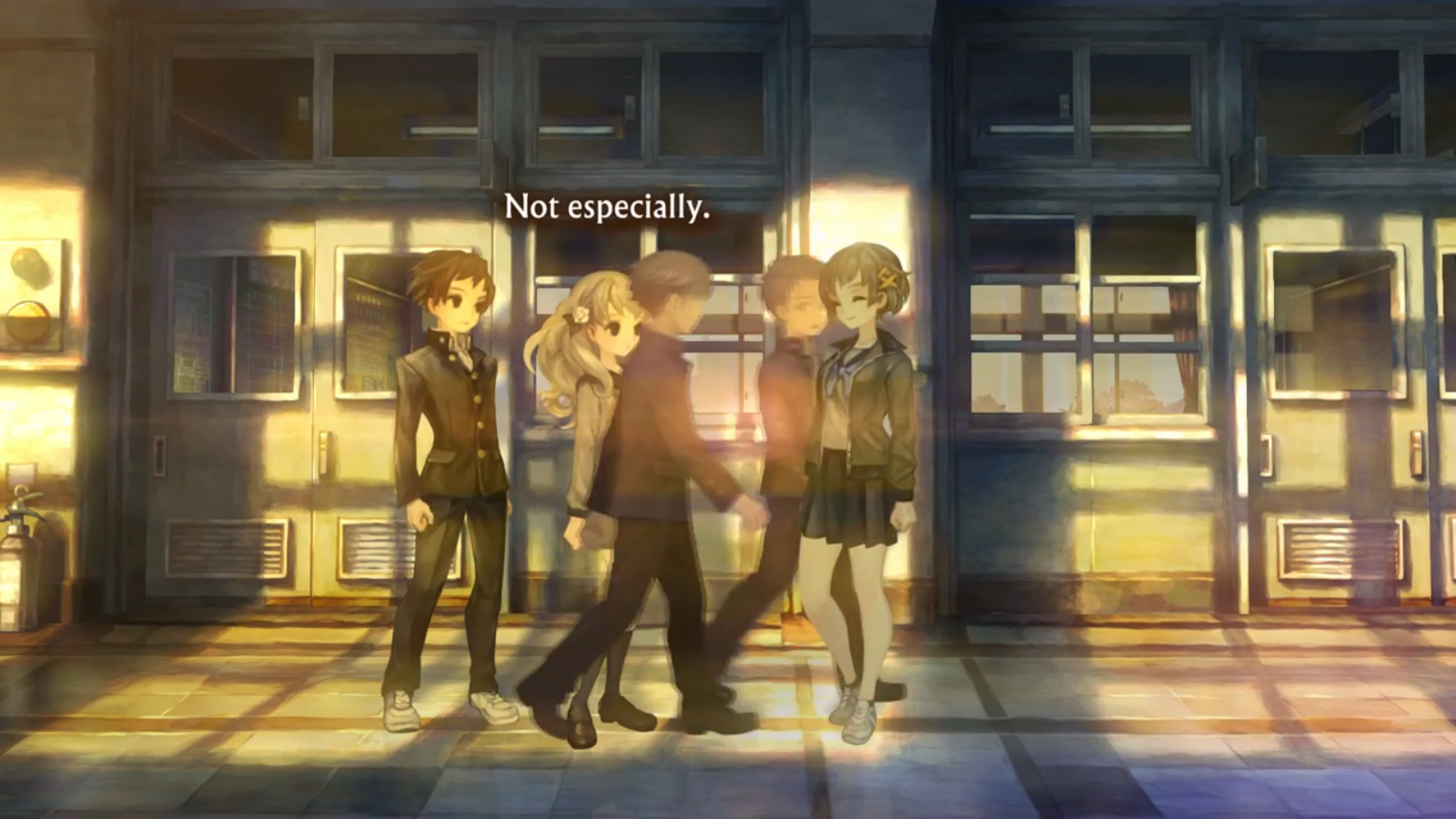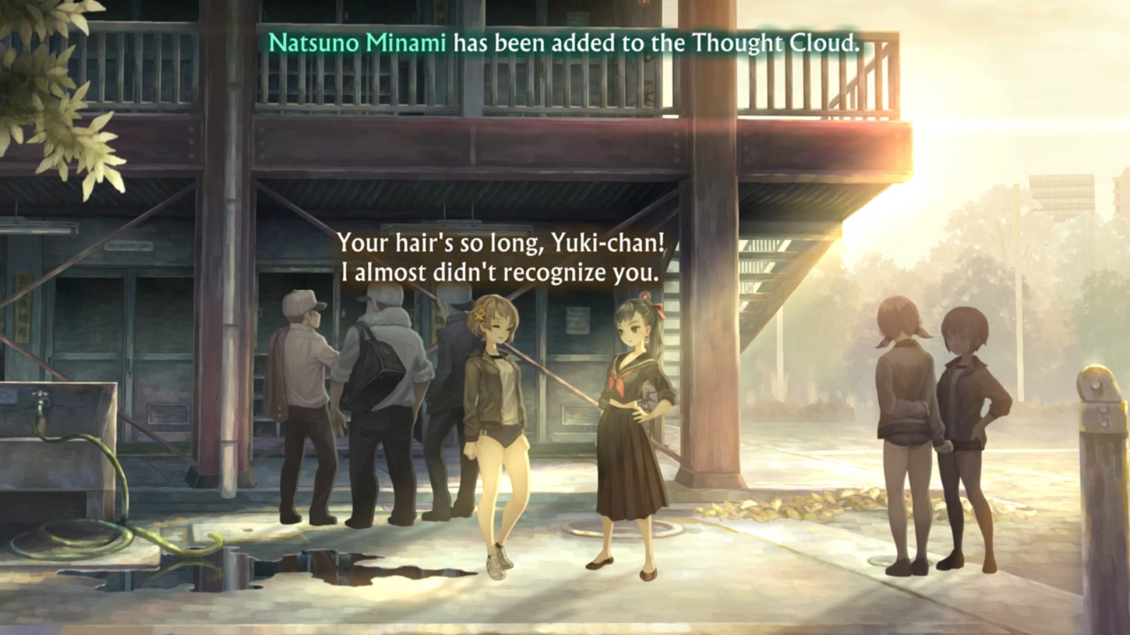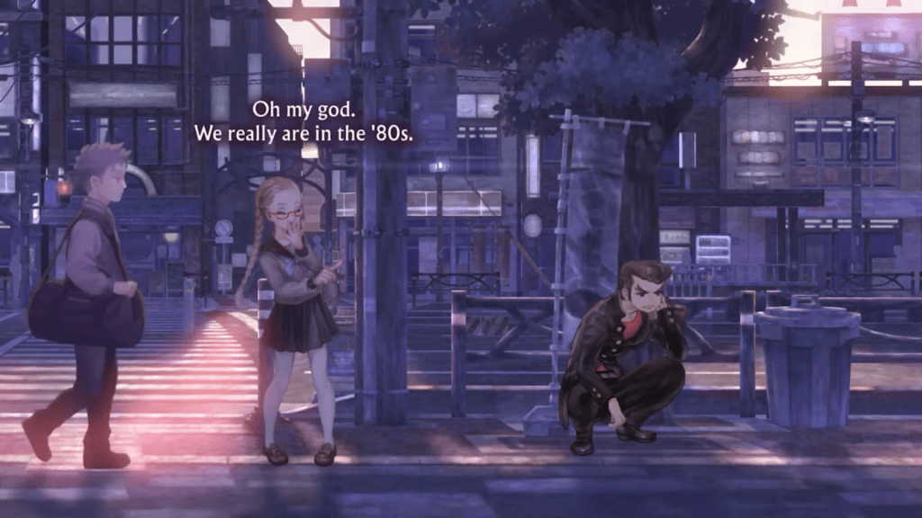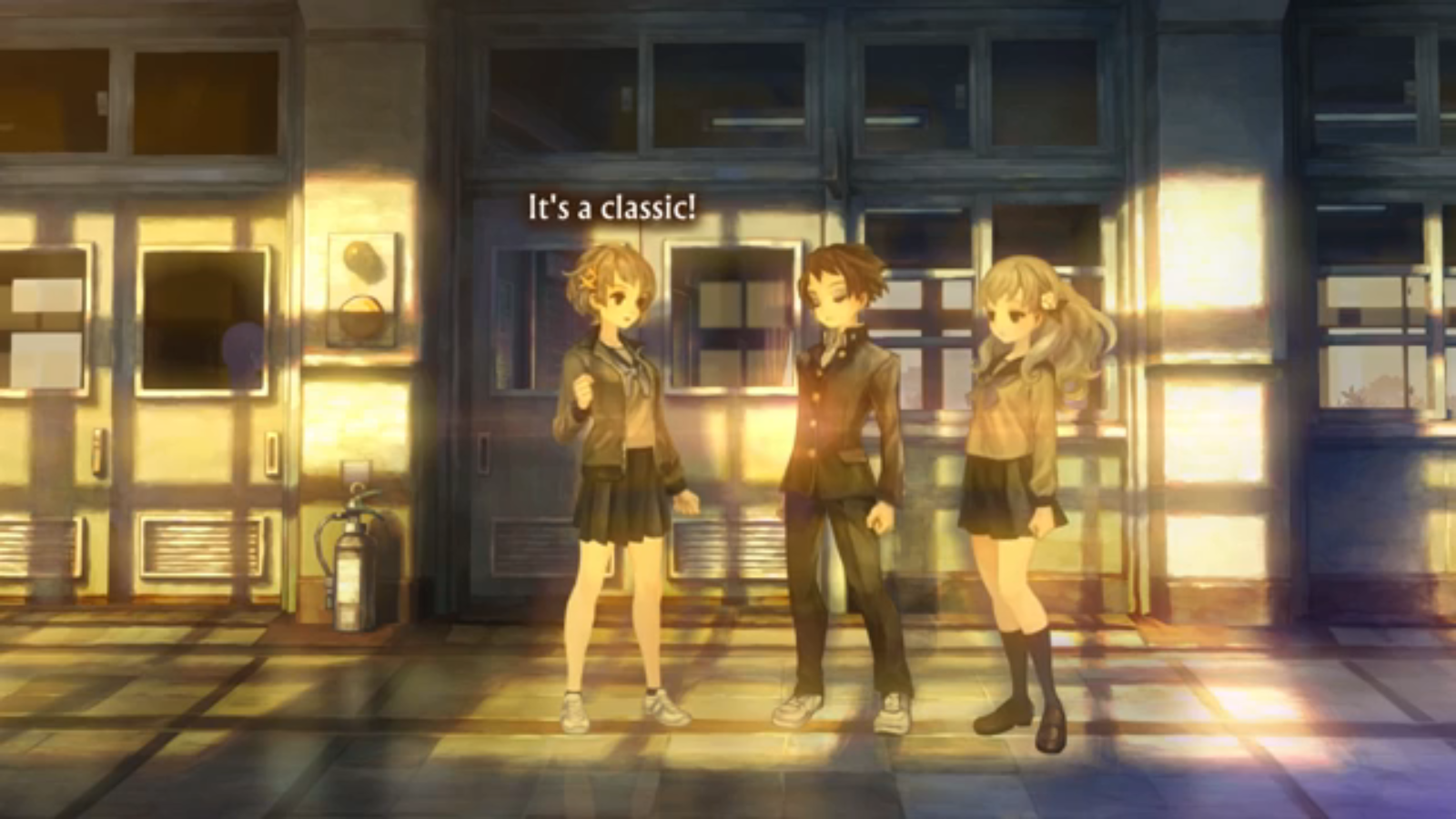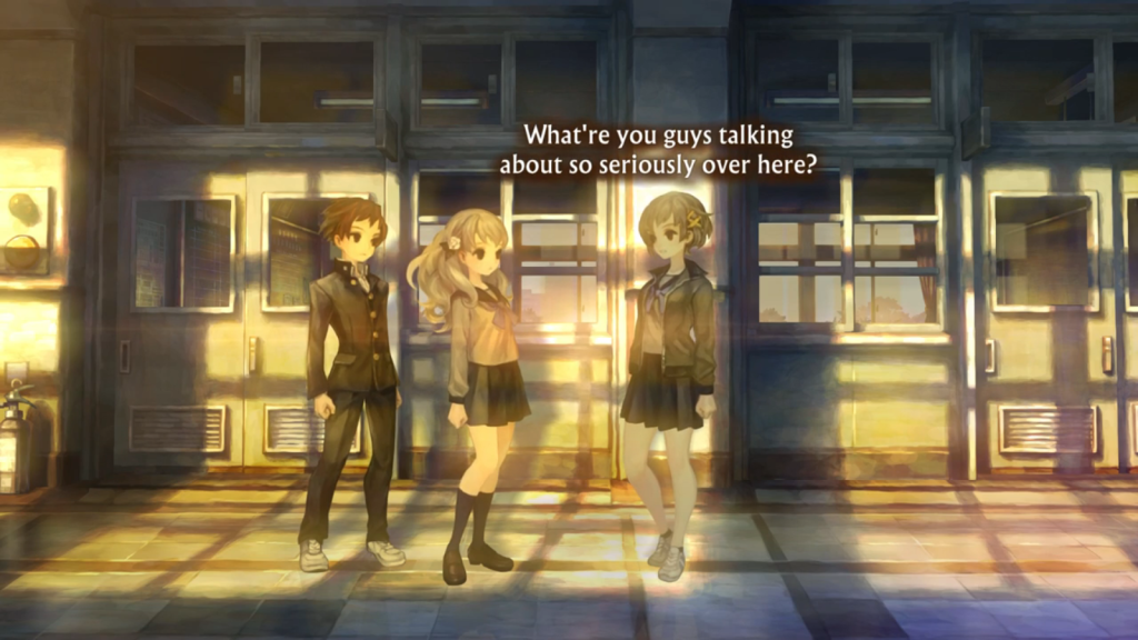 Natsuno’s route begins in the evening at the high school in 1985. As she wanders the halls, she encounters Juro and Iori having a pleasant conversation about their dreams.