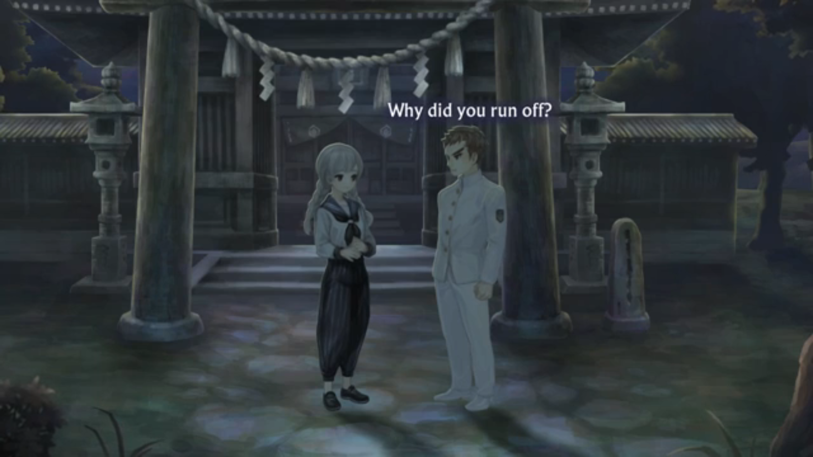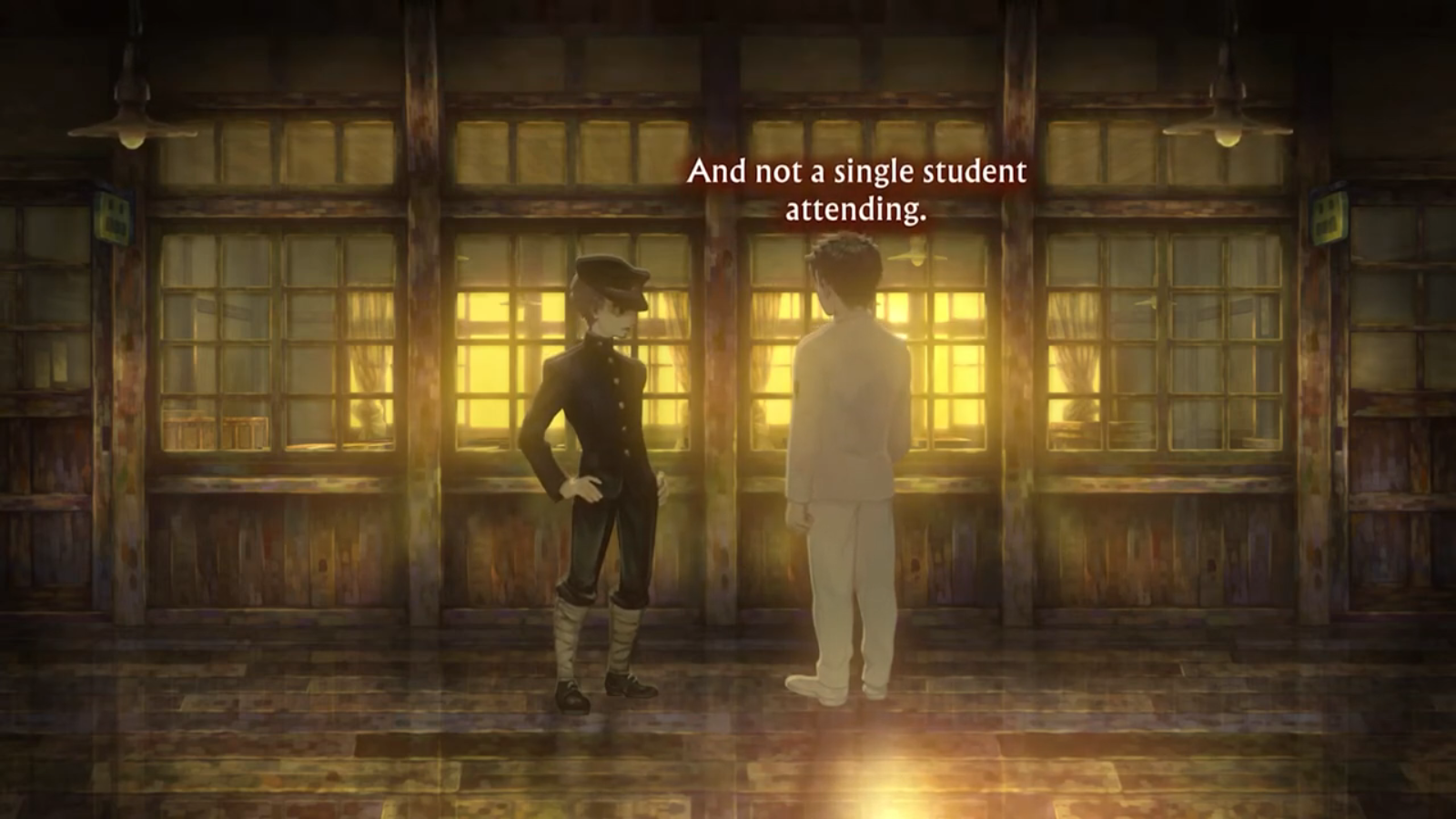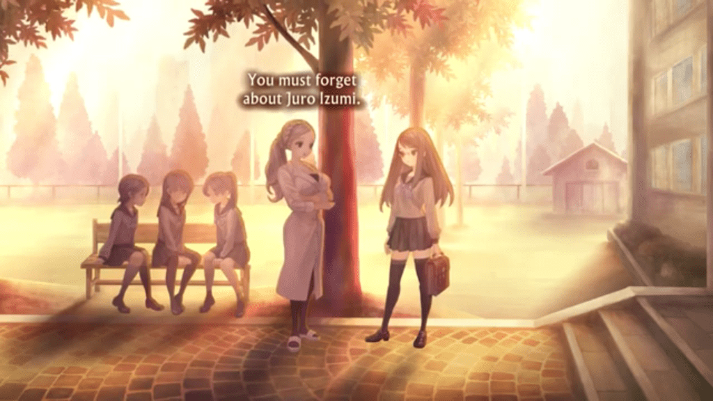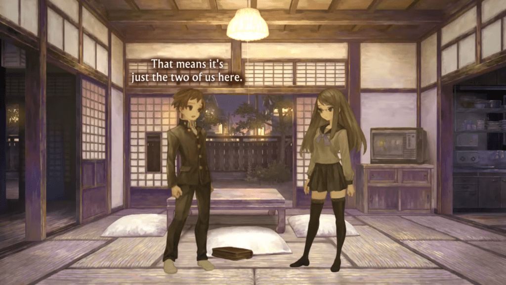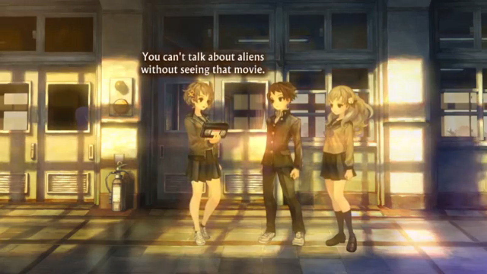 Natsuno’s route begins in the evening at the high school in 1985. As she wanders the halls, she encounters Juro and Iori having a pleasant conversation about their dreams.