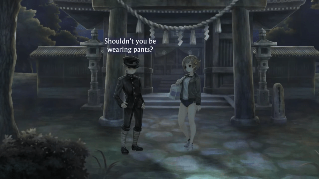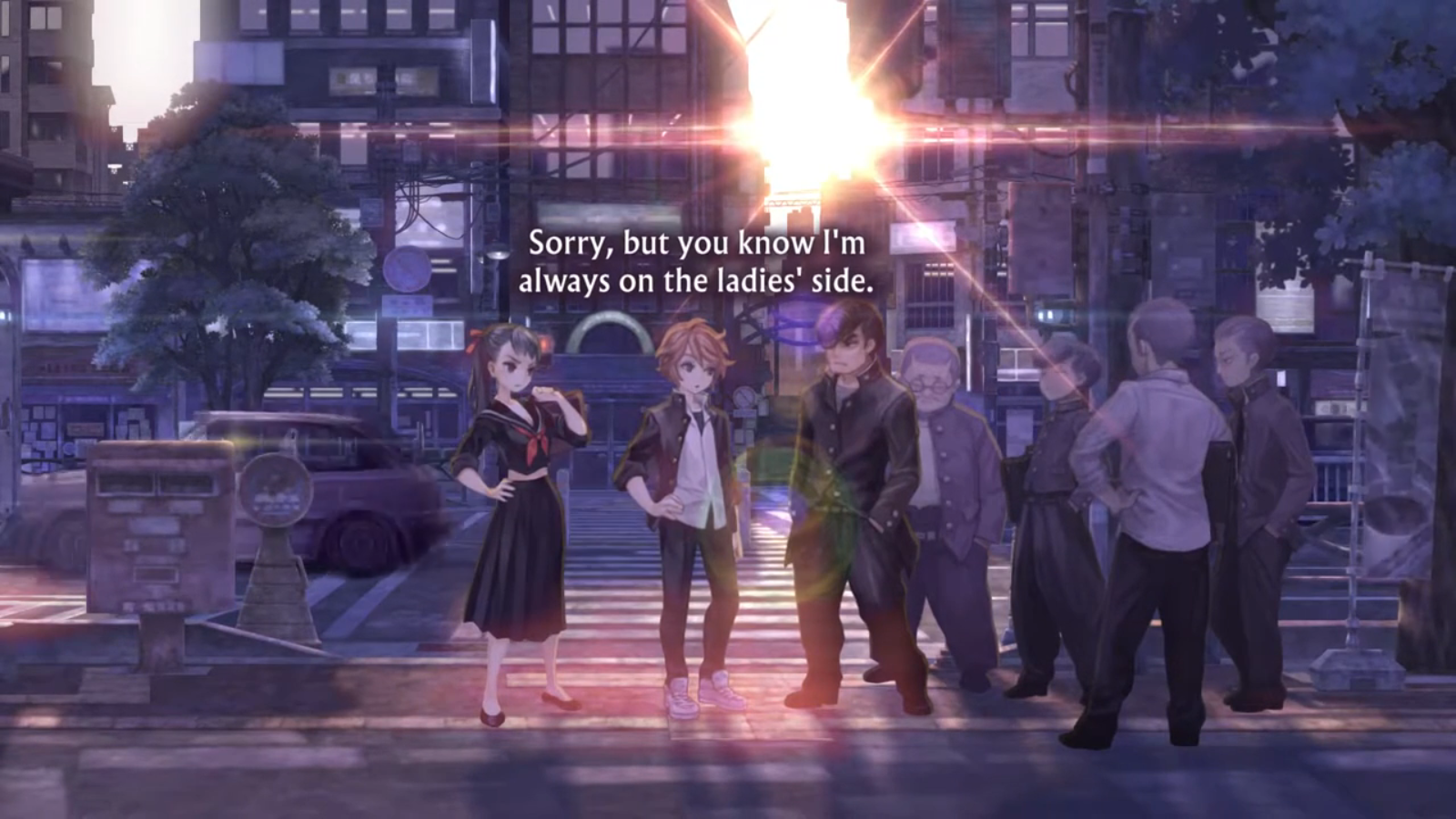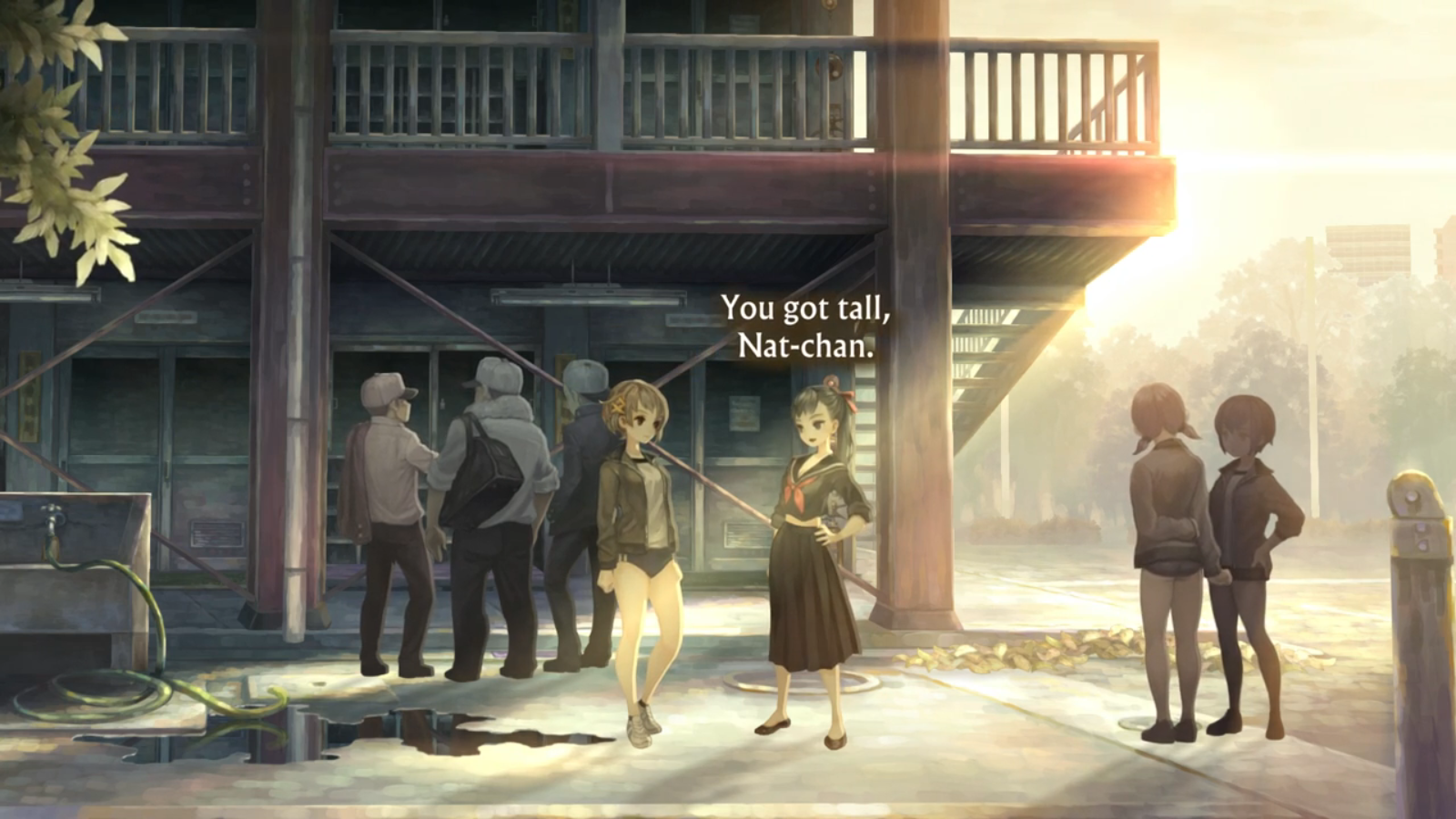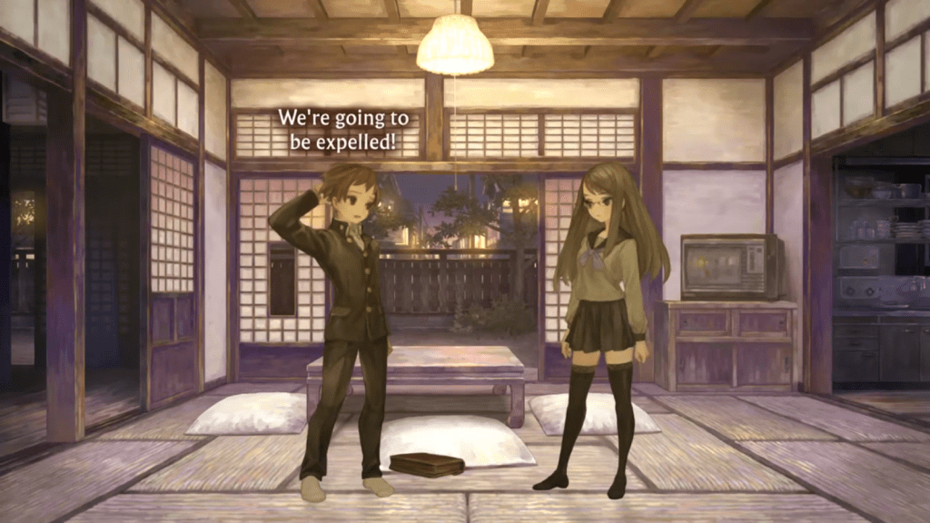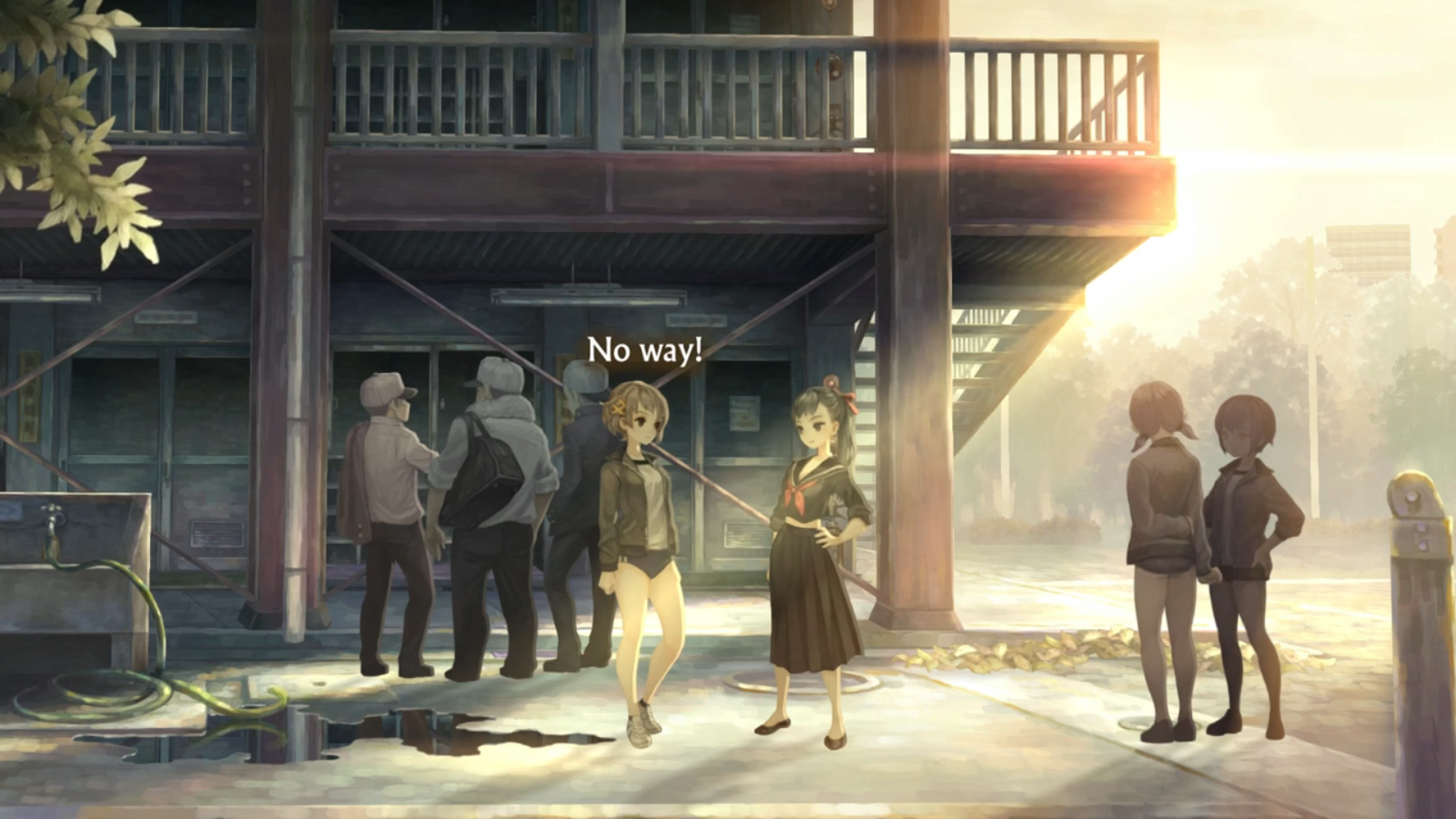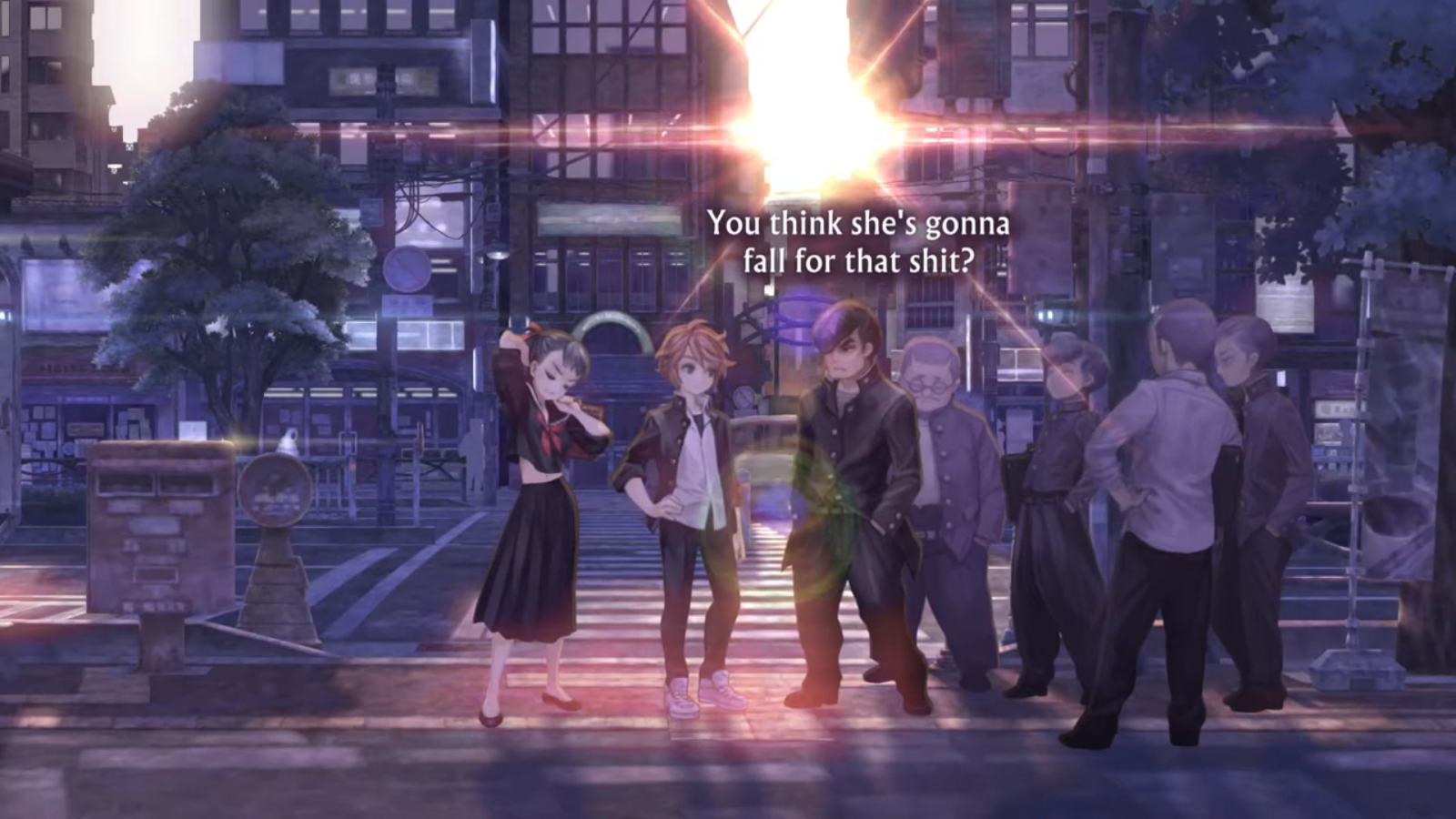 Natsuno’s route begins in the evening at the high school in 1985. As she wanders the halls, she encounters Juro and Iori having a pleasant conversation about their dreams.