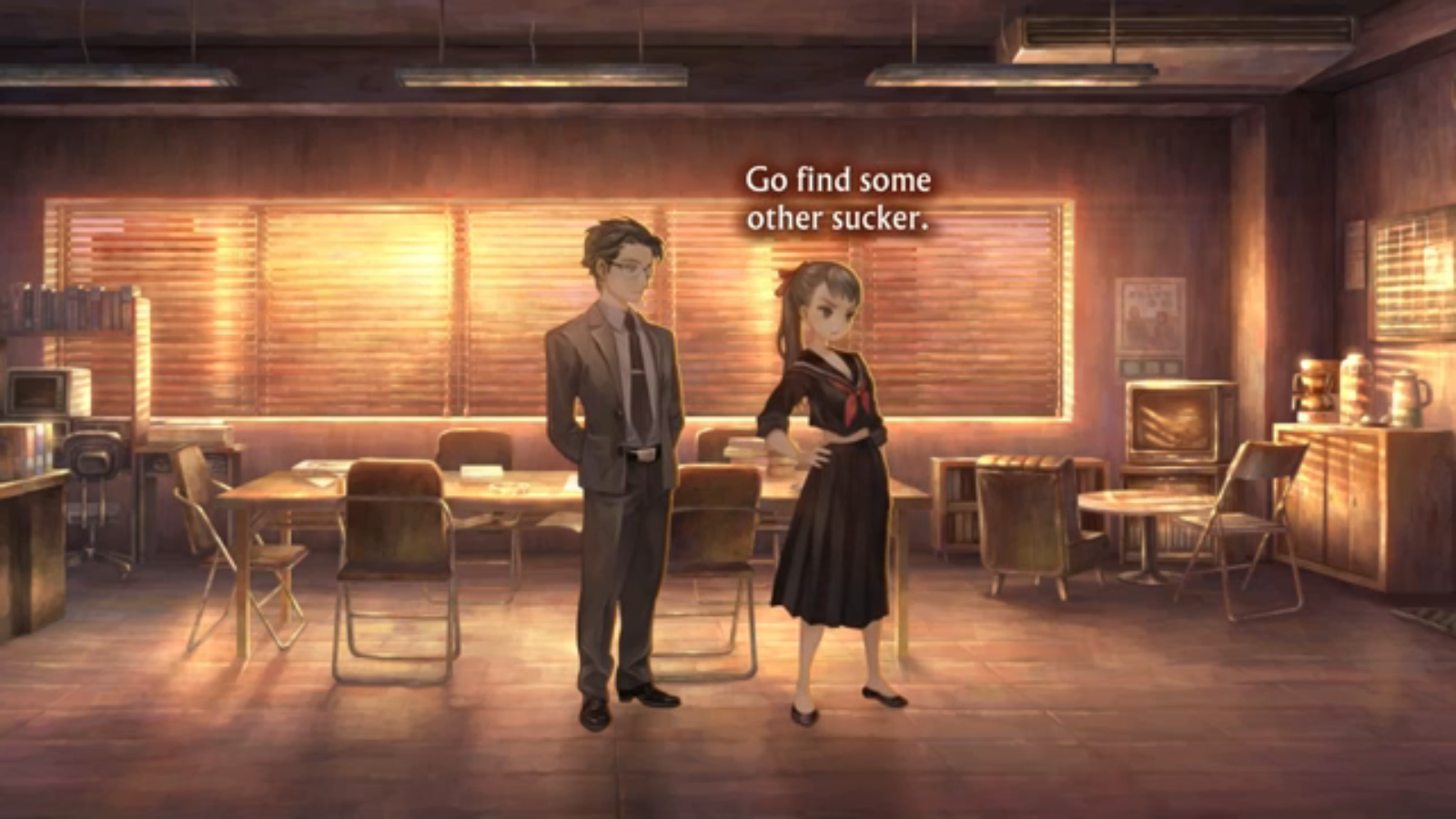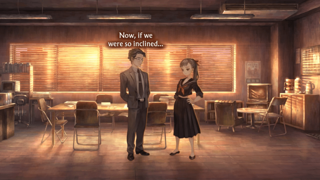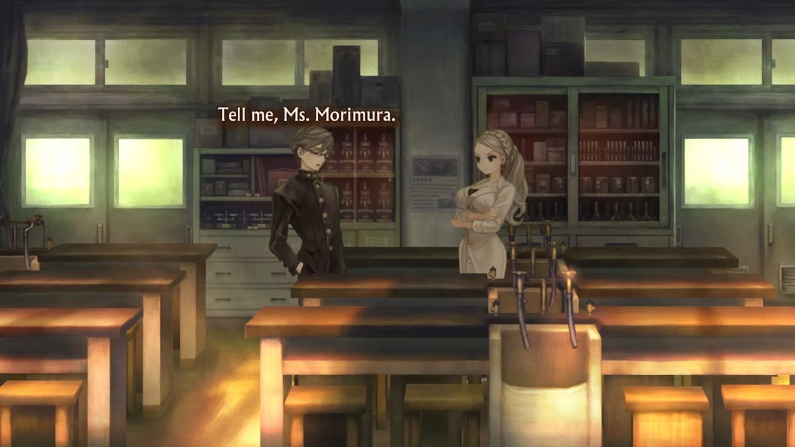 Alright, I’m putting him a slot above Amiguchi for pettiness, but let it be known I REALLY don’t like this guy. His cold, calculating persona and unflappable presentation irritate me, and his route isn’t any better. To finish his route you need to have at least 11 stories completed, meaning his route is the most spoiler heavy and reliant on tying everything together. His story begins in 1985, in the school’s science room, where Chihiro Morimura finds and reprimands him. He responds accordingly