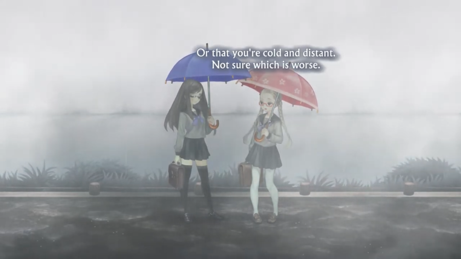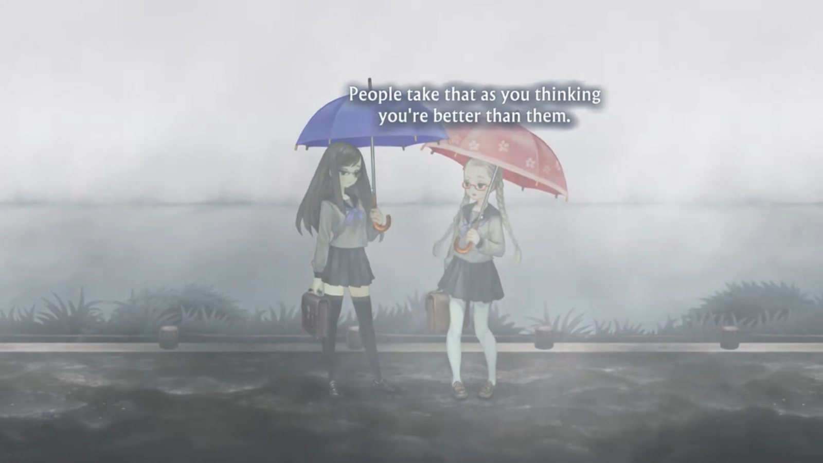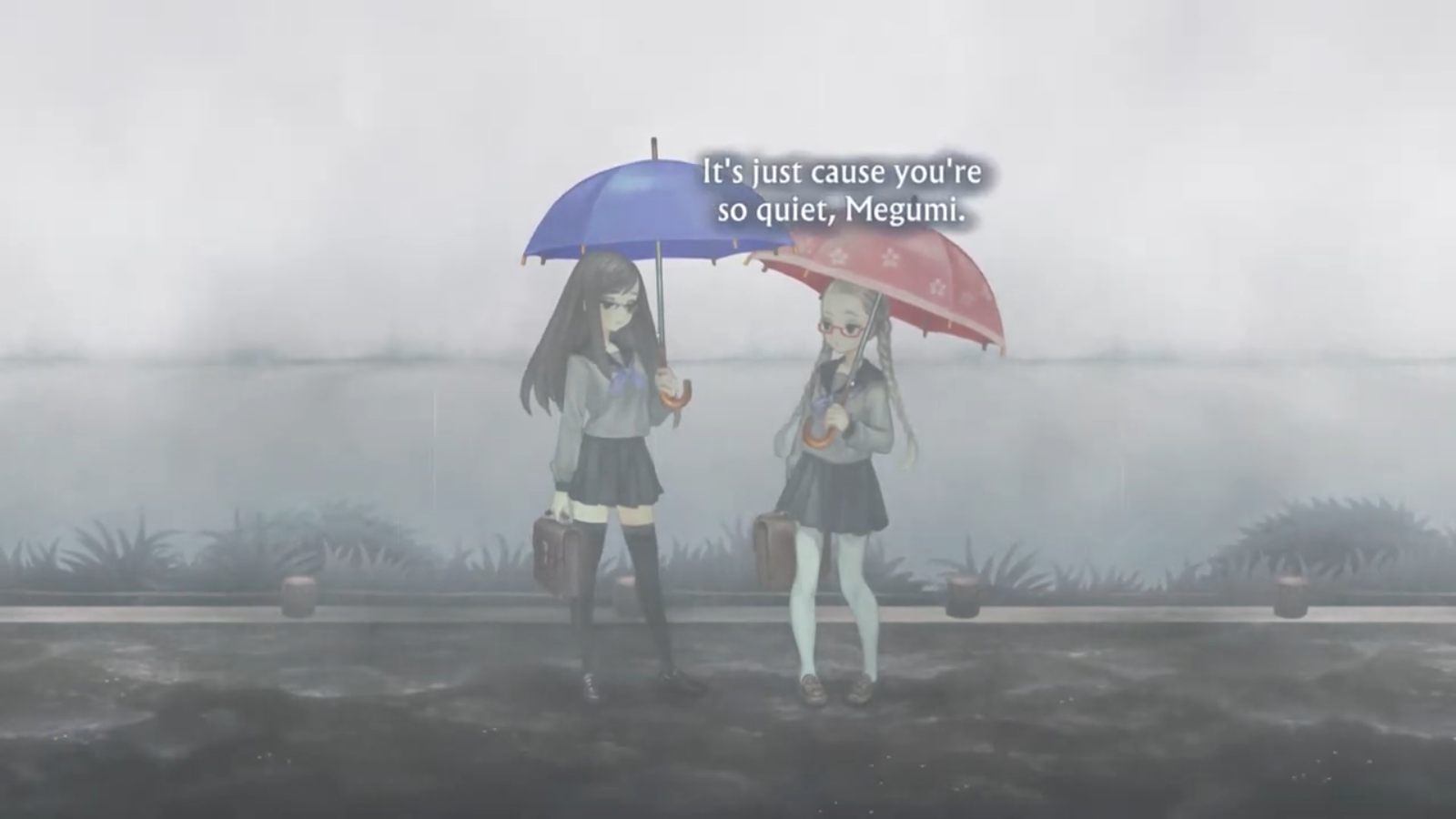 Megumi’s route begins with her and Tomi Kisaragi walking past Satsuki Pond Park on a rainy, foggy day. Tomi can tell that Megumi is bummed and asks what’s wrong,