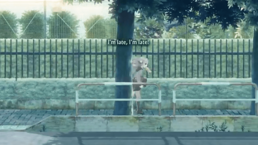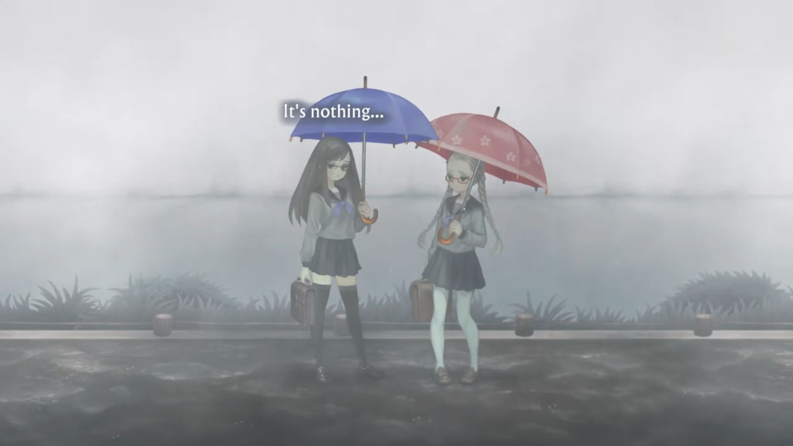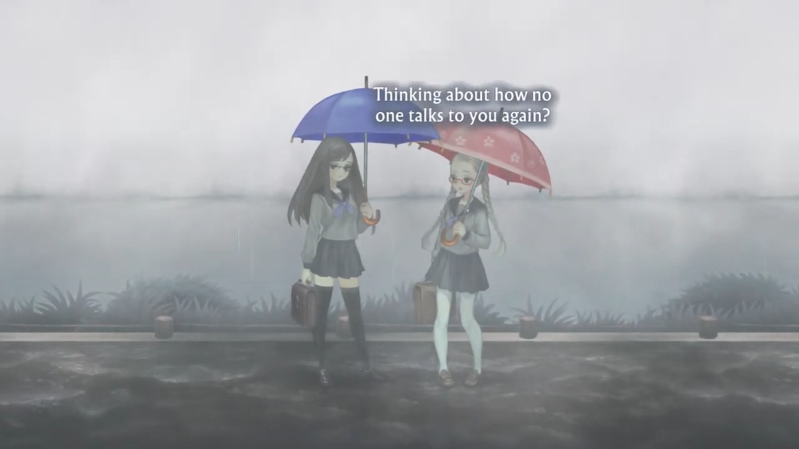 Megumi’s route begins with her and Tomi Kisaragi walking past Satsuki Pond Park on a rainy, foggy day. Tomi can tell that Megumi is bummed and asks what’s wrong,