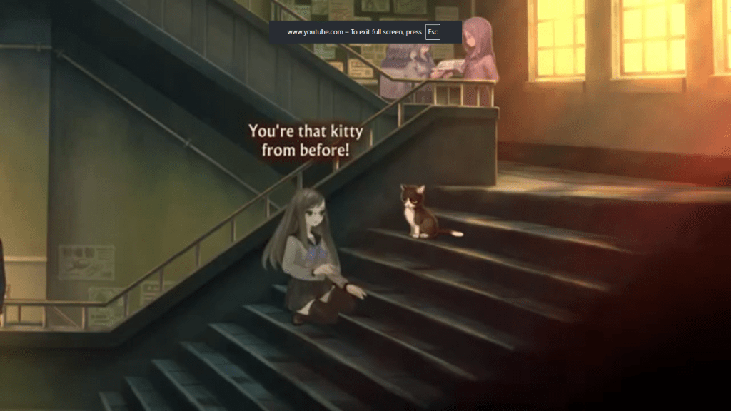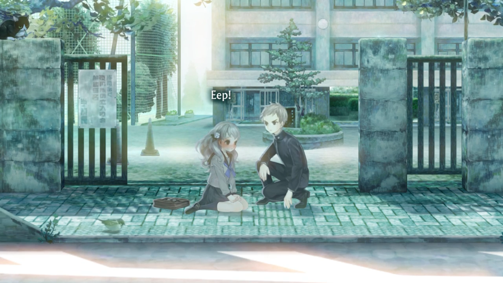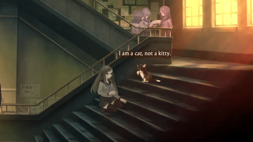 The two look on to see Juro (Kurabe, as he is now) being shown around the school by a young girl, who reminds him to take his medicine. Despite Megumi’s pleas, Morimura is adamant that this is for his own good, and that Juro Izumi would want this. A few months after this exchange, Juro ascends some stairs while Megumi slowly trails behind him until she encounters the cat from before. She calls him a kitty, to which it surprises her by correcting her.