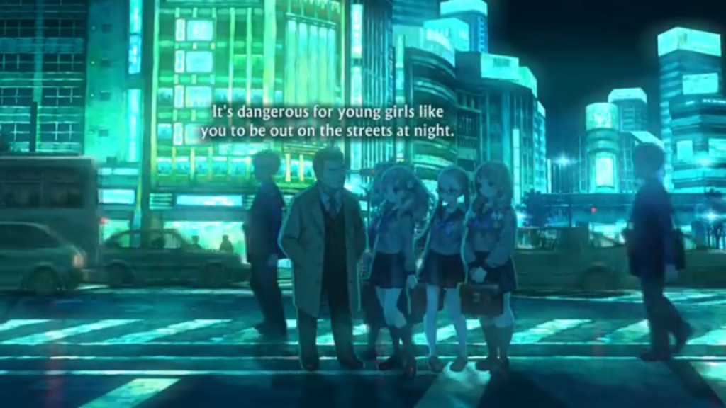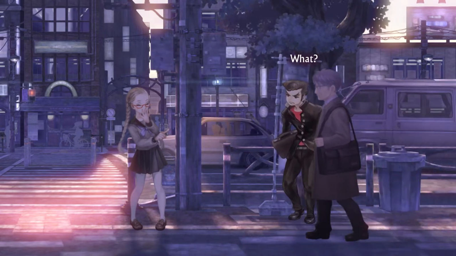 Later down the route, the trio of girls end up at Tsutsuji Station after the sun has gone down, as Miwako was busy trying to get a record, checking three stores in the span of 3 hours only to come up empty. After Iori calls her father, they try to leave stage right but encounter Wajima, who they know will harass them. Not wanting a confrontation, they head left right into the sights of detective Heizo Onishi, who accosts the young ladies for being out so late. He lets them off with a warning this time, but cautions: