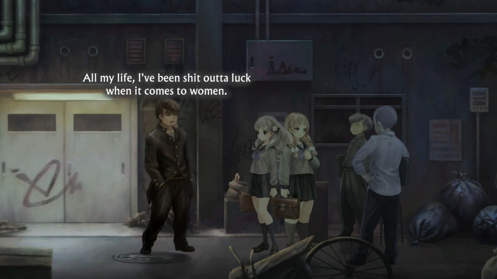 Near the end of his route I began to feel bad for him. Juro’s roommate, school nurse and even grandmother gaslight him into thinking he’s someone he isn’t, and the only person who tries to convince him otherwise isn’t even a person, and any conversation they have together makes Juro look nuts.