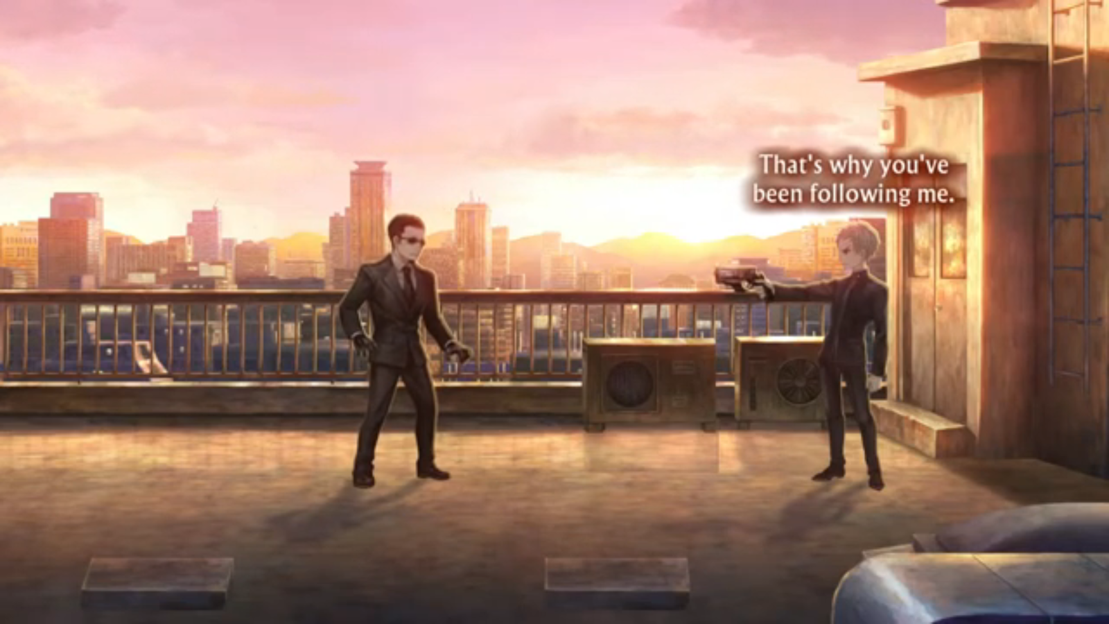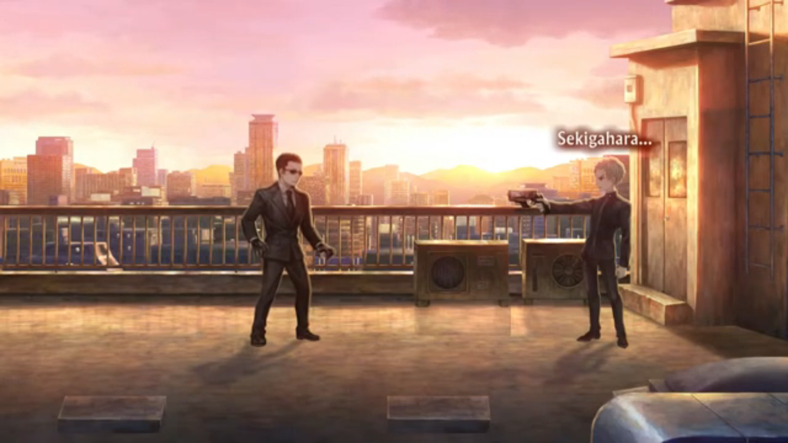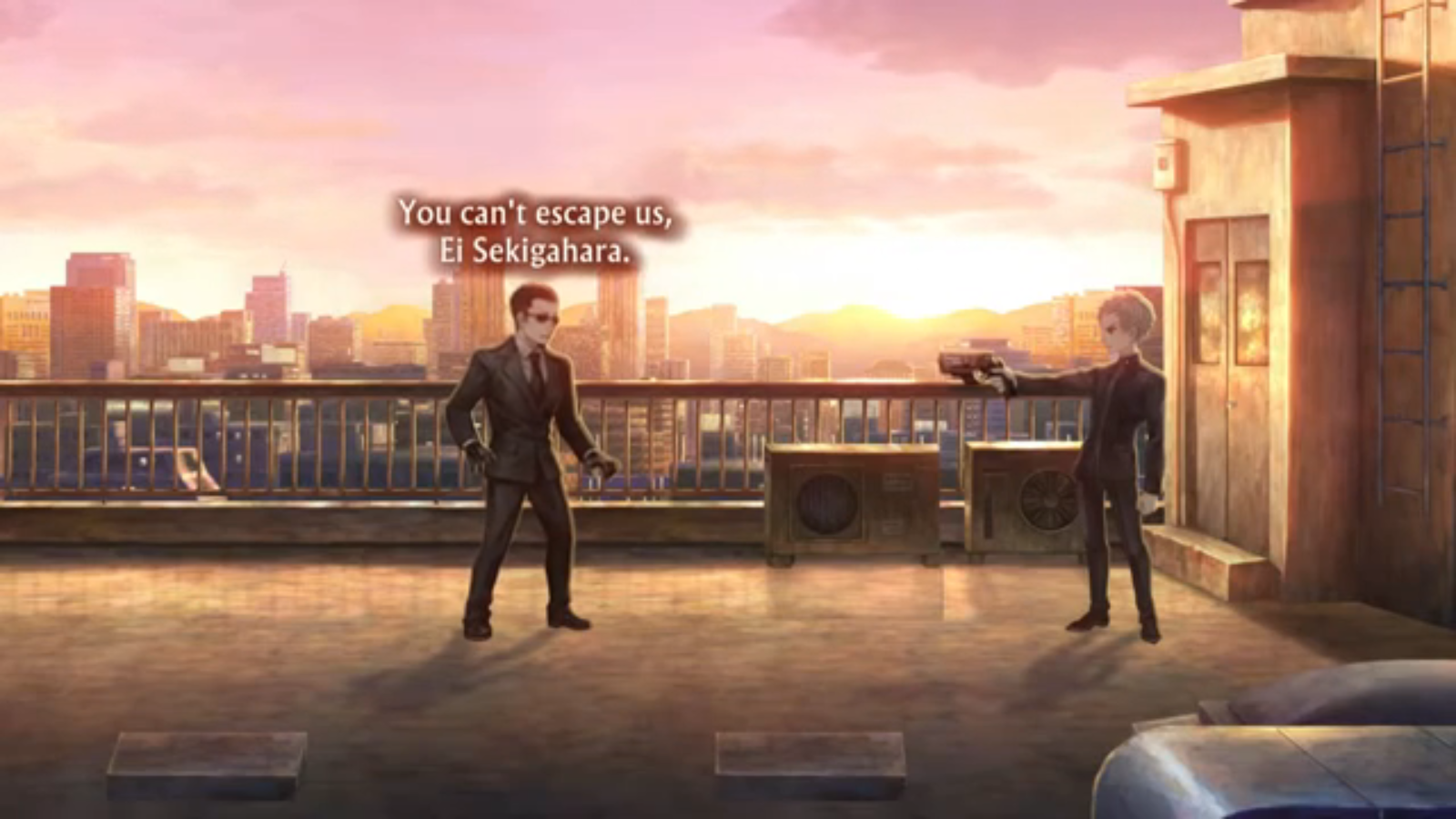 Sekigahara’s prologue begins in 1985, where he’s on the run from men in black suits, who corner him atop a building. Lucky for Ei though, he gets the jump on them by hiding behind the entrance and pulling out a gun.