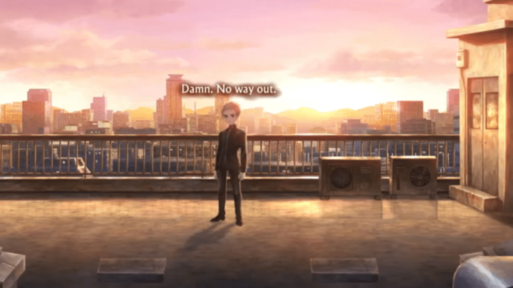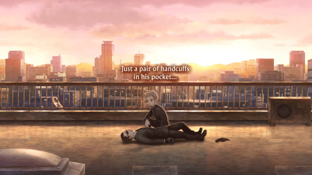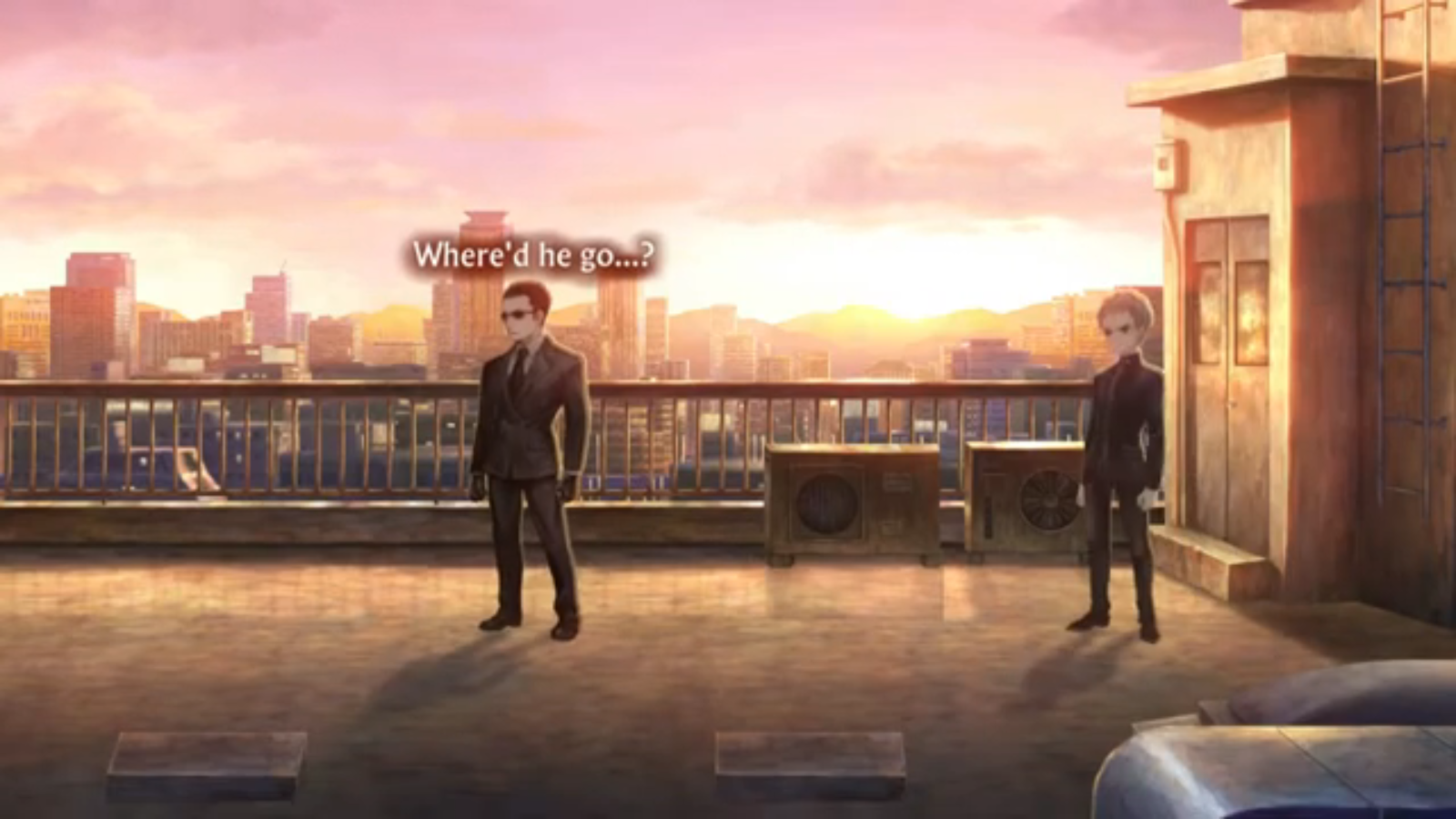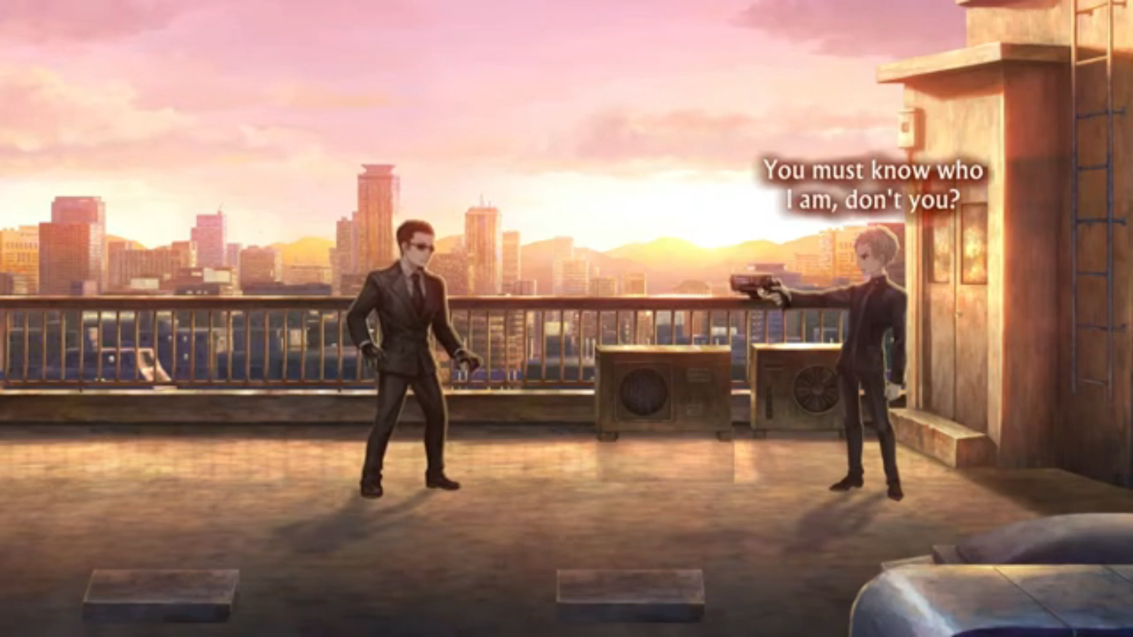 Sekigahara’s prologue begins in 1985, where he’s on the run from men in black suits, who corner him atop a building. Lucky for Ei though, he gets the jump on them by hiding behind the entrance and pulling out a gun.