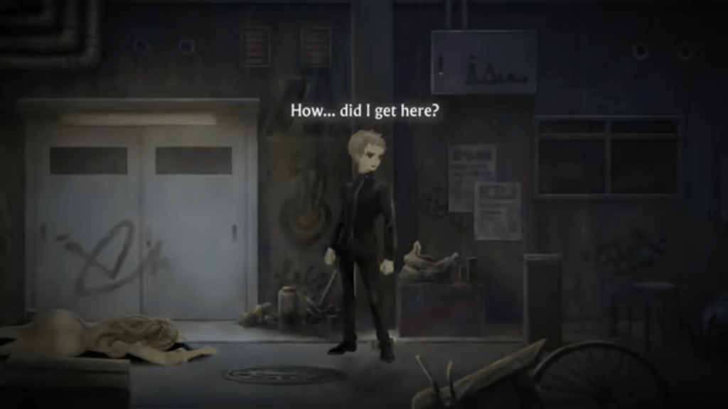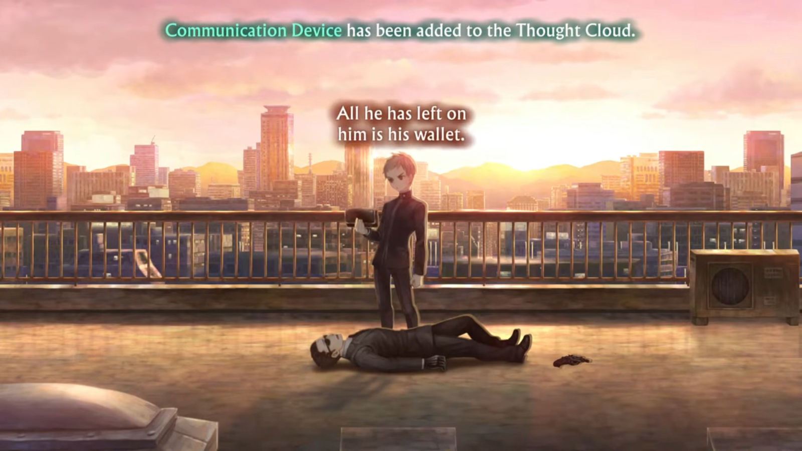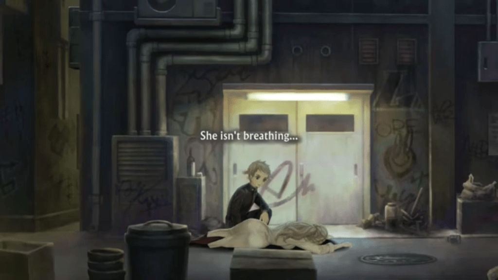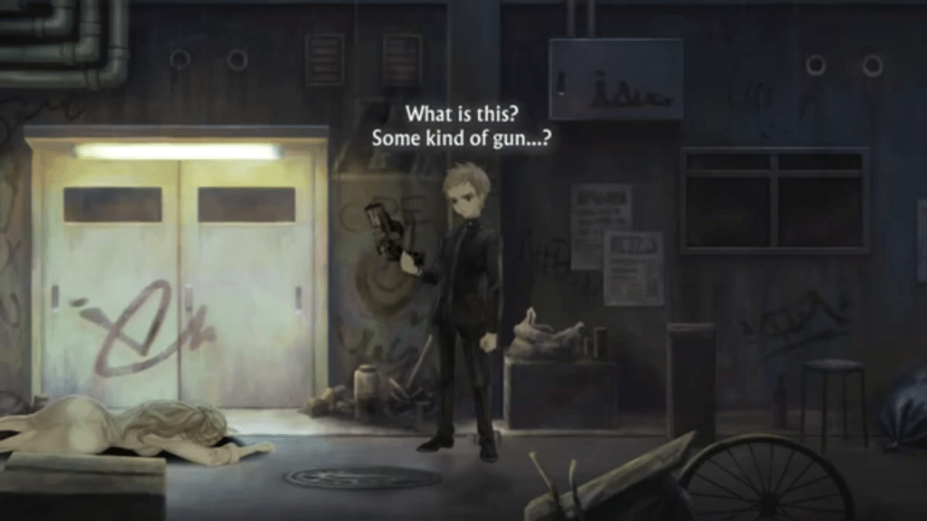 Ei wakes up in a dirty alleyway not knowing where he is, who he is, and more importantly (because time travel is involved) when he is. All he has in his vicinity is a gun in his hands and the dead body of Chihiro Morimura in front of him, which I’m 90% sure the boys of Sakura high school would be ecstatic to see (well, the necrophiles anyways). After rummaging through his pockets and her pockets, Ei gets what he needs and gets the hell out of dodge as the men in black approach the alleyway he’s hiding in.