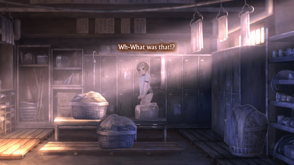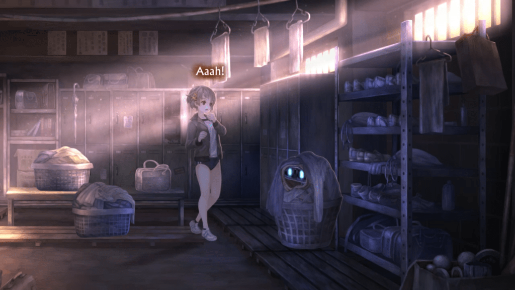 What does the X in “E.X.T” stand for anyways? Xenophobic? Anyways, Natsuno fangirls over the idea of extraterrestrial life to them, which tires out the narcoleptic Iori. Adamant that they’re out there, Natsuno vows that one day she’ll work for NASA, which even without going into spoilers, is simply not going to happen especially in their time period. One of the basic requirements to work there is a U.S citizenship, and I doubt they’re going to hand out jobs to just any space nut out there. After practice and encountering a man in a black suit with shades, she cleans up outside the track area and heads into the ladies room, where despite her exhaustion and reluctance, she elects to change. But the game devs likely realized that they’d land in hot water for adding an undressing scene as she’s quickly interrupted by a shaking laundry basket. But thankfully, it’s not a pervert lying in the hamper, but a robot named BJ