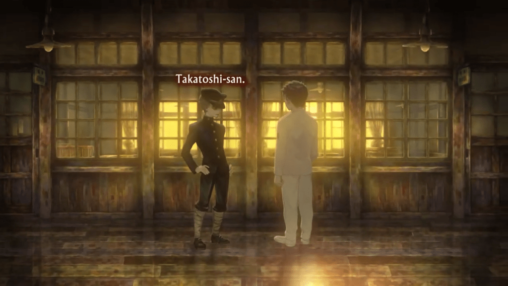 Miura’s route initially starts with the future adult Miura conversing with adult Natsuno, musing about conflicts of extraterrestrial wars and living during the pacific war. His route really begins when he arrives at the Sakura National School Wooden Building (the same one that is still present in 1985, actually) when it was brand new, where he meets with Takatoshi, who laments the state of the building.