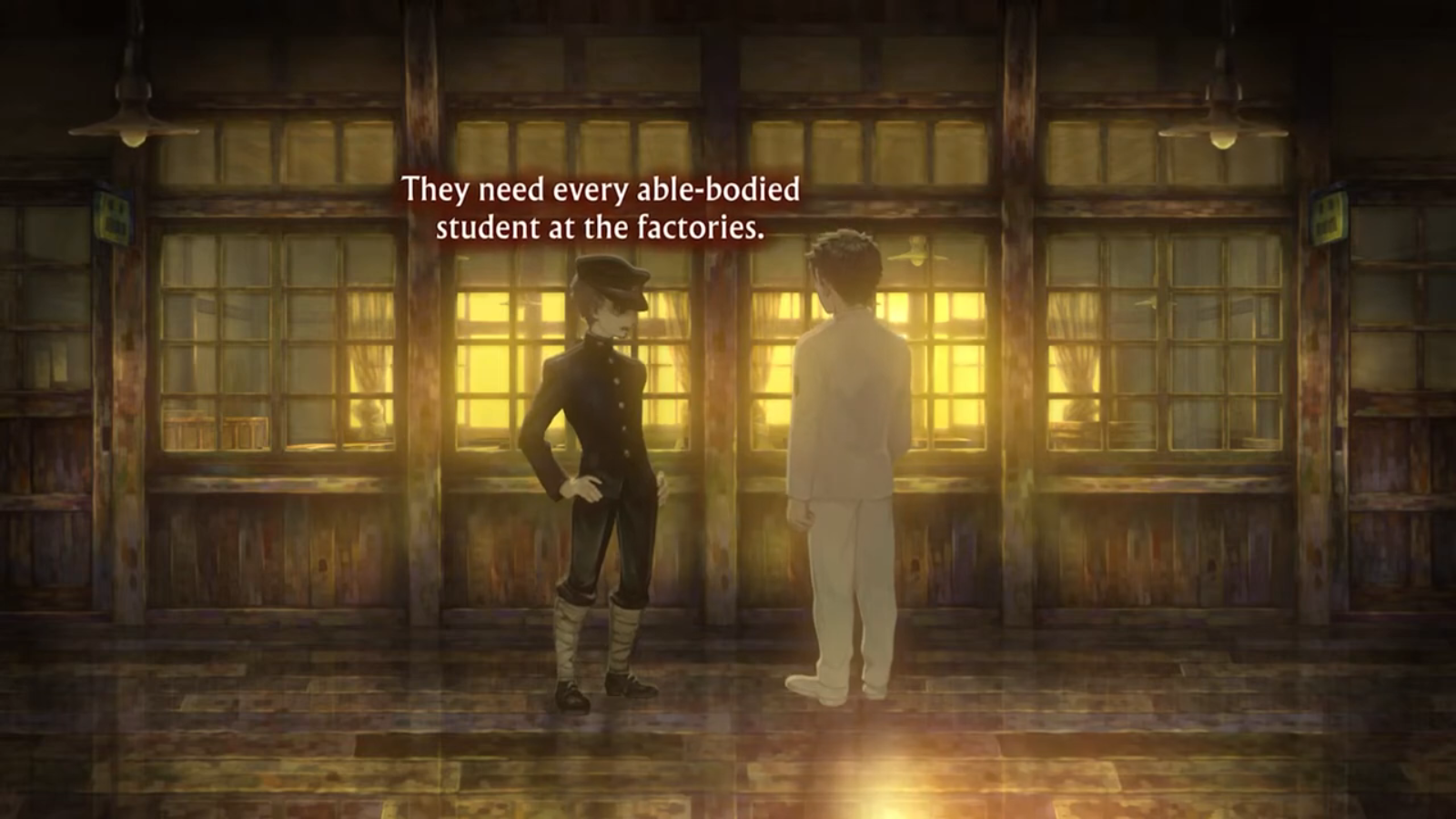 And that triggers an internal dialogue within Miura, who reveals that Japan is losing the battle against the U.S, and there aren’t any warships left (implying that this takes place around October 1944, when the battle of Leyte Gulf happened and the imperial Japanese Navy lost most of their fleet and control of the southeastern Pacific Ocean, severely hampering their control over strategic points). The two continue to converse, with Keitaro wondering why out of all people why he was chosen, to which Takatoshi replies that he was chosen instead of his peers for the honor and privilege of defending Japan instead of being sent to a factory. Takatoshi then reassures Miura with one chilling line: