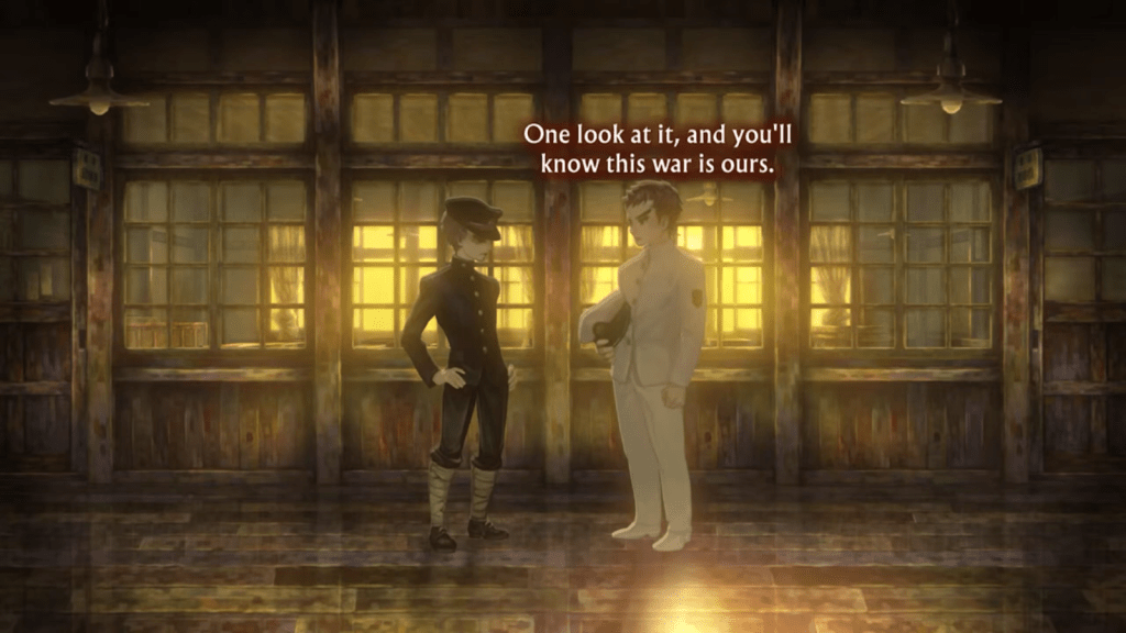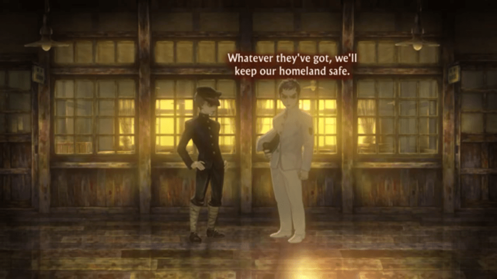 He’s obviously referring to a weapon but I think it’s funnier to imagine the “it” in question is some blackmail on Franklin D. Roosevelt that they’d send to the White House, demanding to stop helping the allies. Miura wants to know more, but Takatoshi states that it’s top secret, but does let him in on what it’s called: A Sentinel. The idea is to position them along the beaches of Japan and use it’s advanced weaponry to gun down anything that comes close to their shores, be it a warship or enemy soldier. It’s made clear to Keitaro that they’re losing, which Takatoshi confirms with the reveal that they’re losing territory in the pacific, but the Sentinel contains enough power to rival an entire army. Takatoshi ends the conversation with one final remark, showing his confidence in the plan’s success.