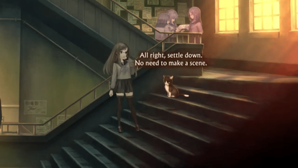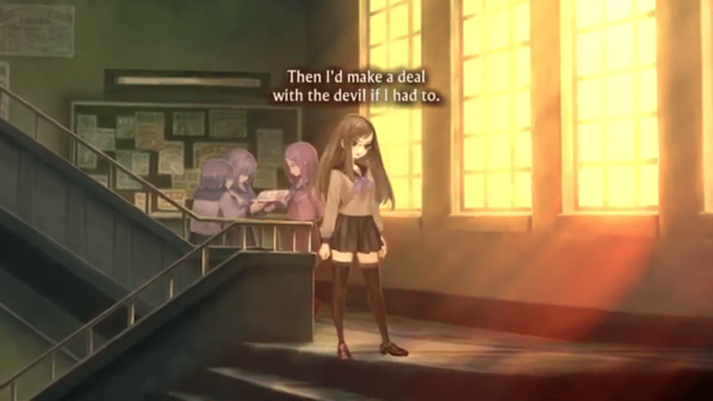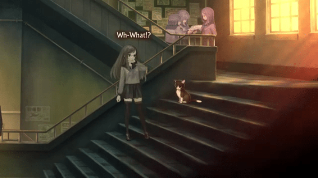 Eventually, she calms down after the cat reveals he knows who she is, and tells her that she’s the one who called for him. He then states he’s here to help her fulfill her deepest desire: Bringing Juro Izumi back. But like most cats he doesn’t do it for free, and offers a binding contract to her where she’ll help him with something to be discussed at a later date. The cat tells her that he’s from another world, and that a code destroyed it, so he’s here to stop it from destroying this one. But obviously, he can’t do it himself as he’s a cat: he lacks thumbs and those are necessary for his mission. You can decline his offer, to which he’ll be pissed off and skulk away, though states that it’s a good thing you’re skeptical, as it’s better than her believing everything she’s told. Once he’s gone, she ponders out loud (in close proximity to other students with no faces) the cat’s offer.