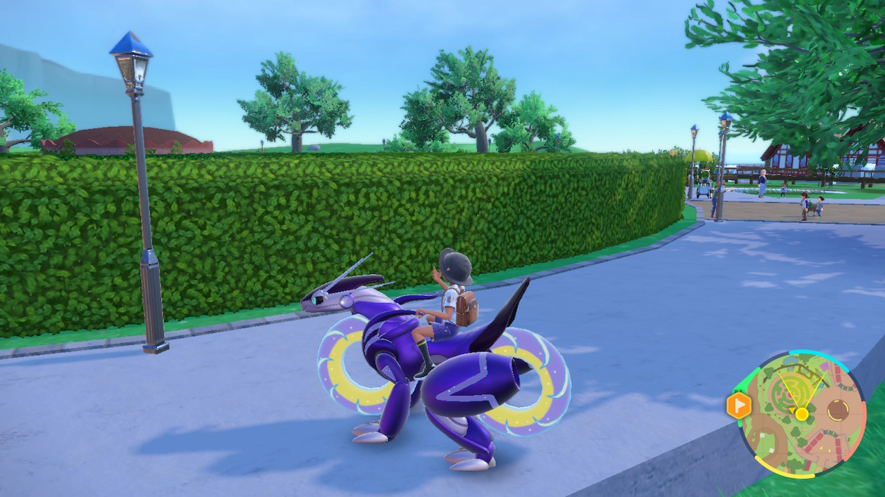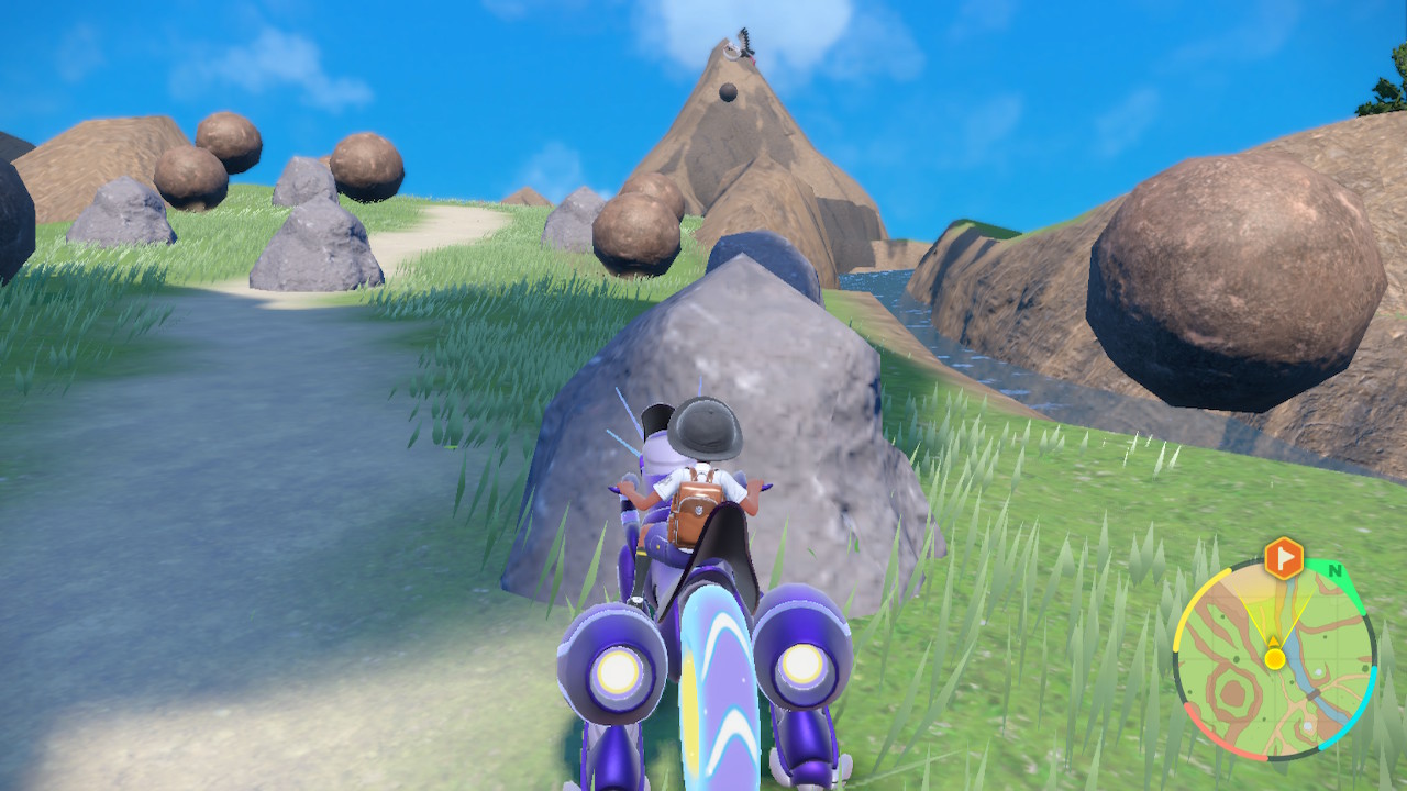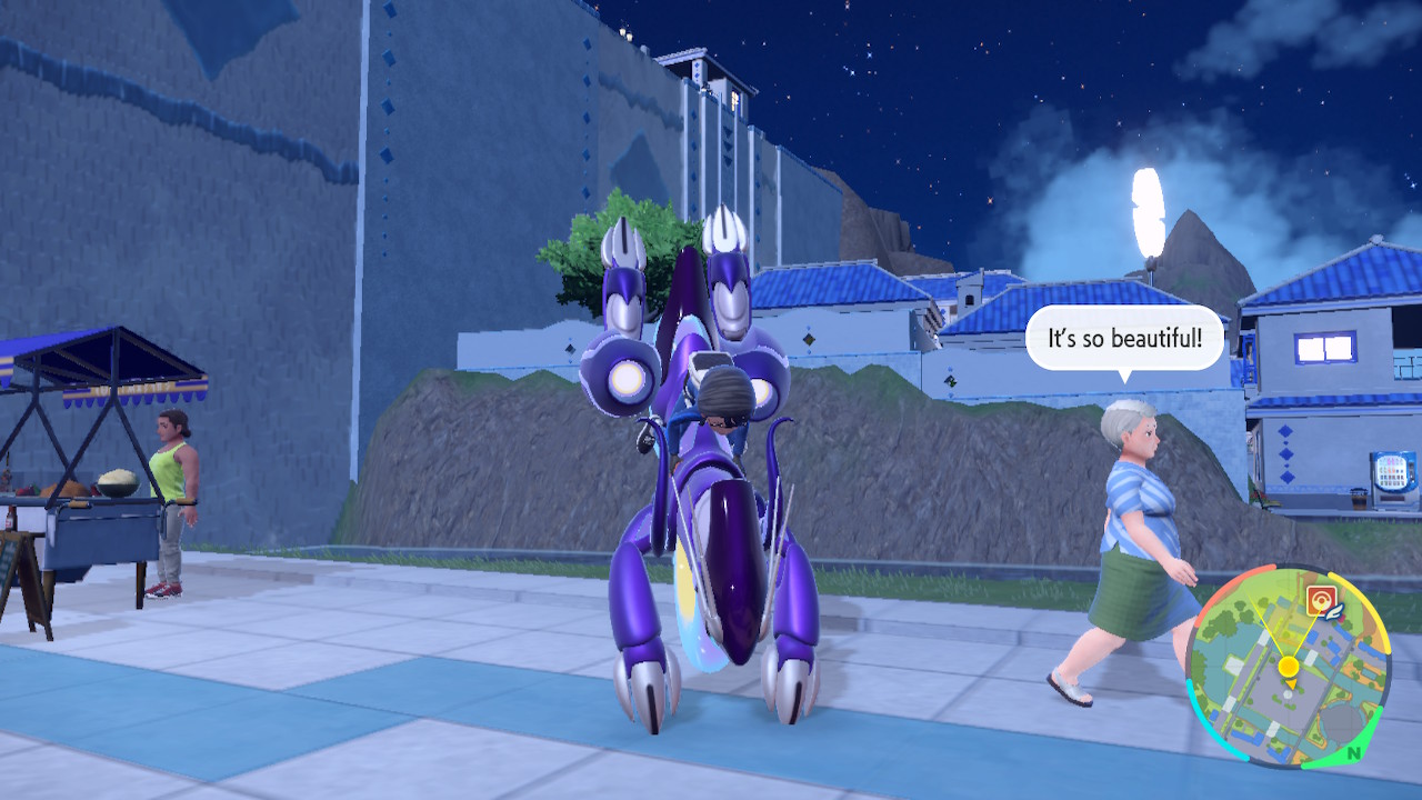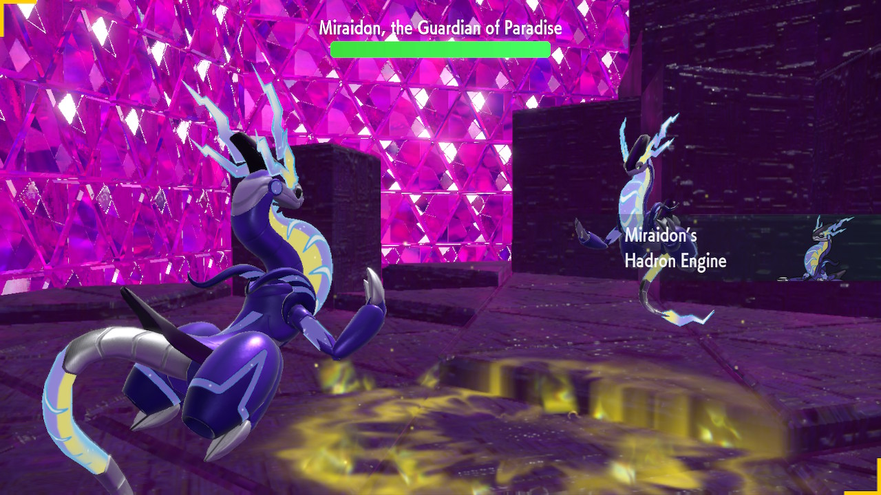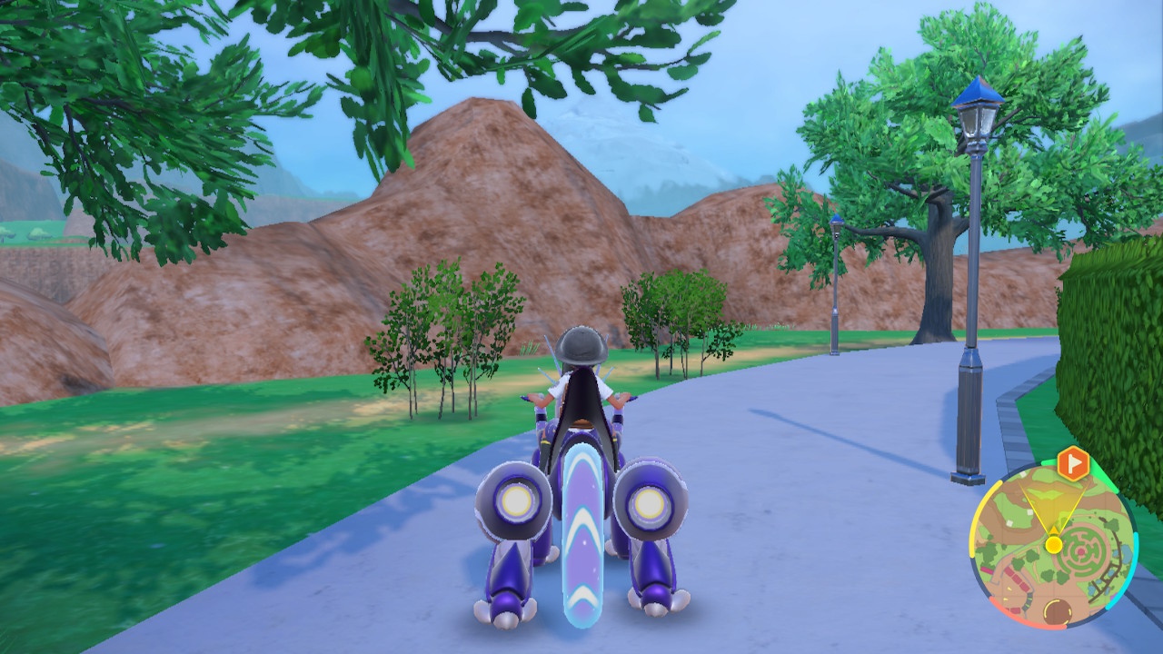 So this is a Pokemon game, that hasn’t fundamentally changed. They’ve tried mixing up the core gameplay in spinoffs and the like, but the main games have been remarkably consistent. You get your first Pokemon, which is pretty much always a fire, water, or grass type. Then you build up a team that can defeat all the gym leaders, bad guys, tough mons, and whatever else comes your way. Then you fight the elite four, then the champion, then you become the champion, and then there’s some post game stuff but you’re mostly done already. That gameplay loop hasn’t really changed much. I think it’s fair to say this game makes more changes to that structure than usual, but it doesn’t fundamentally upend the structure. We still got the gym leaders, though we have much more flexibility with the order we fight them than usual. But they have fixed levels and some of them are hard to reach without Miraidon upgrades so there’s a certain order we’re incentivized to fight them in. Roughly. Like you’re probably not going to fight Grusha before Katy the bug type lady. You might fight Grusha before Tulip, I know I did.