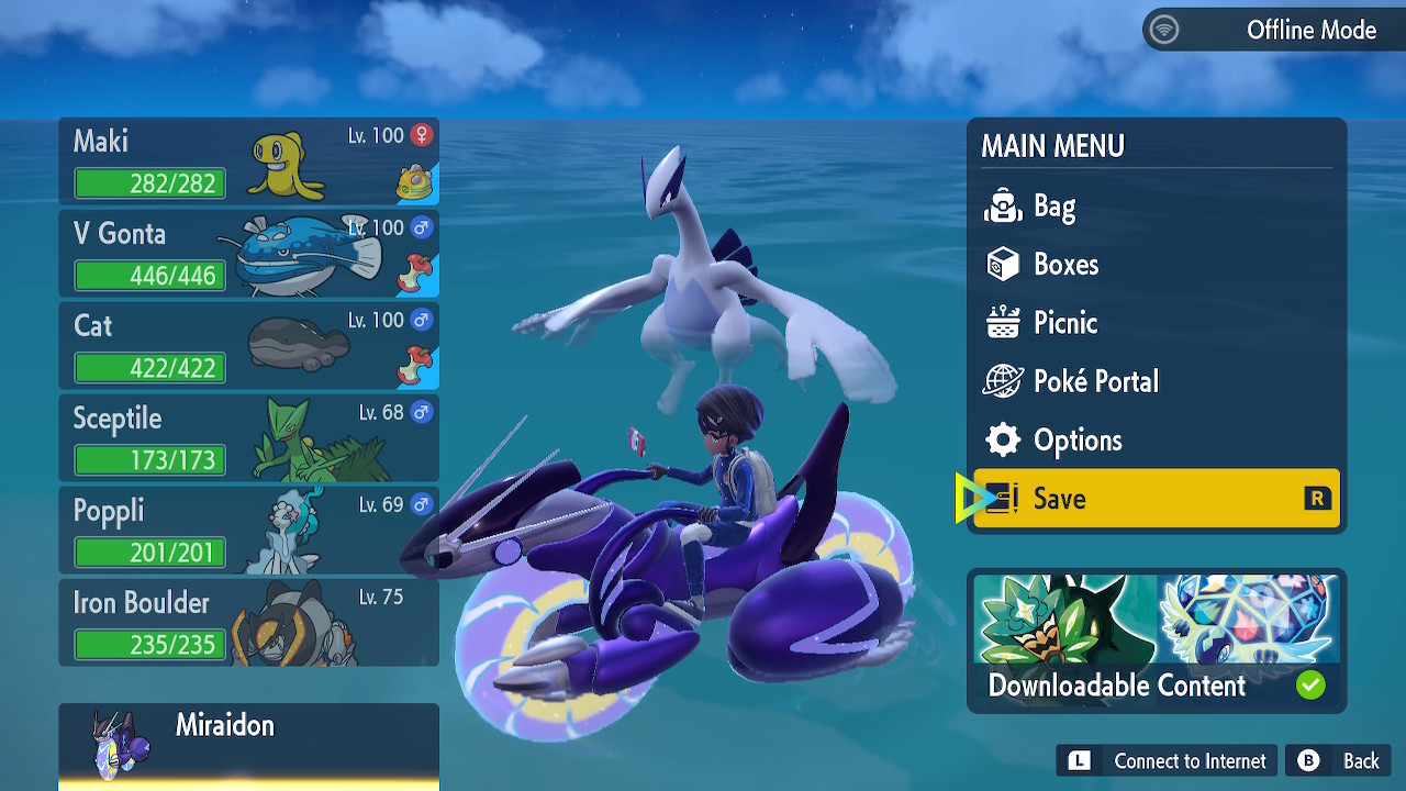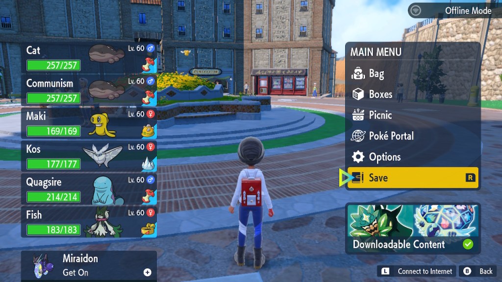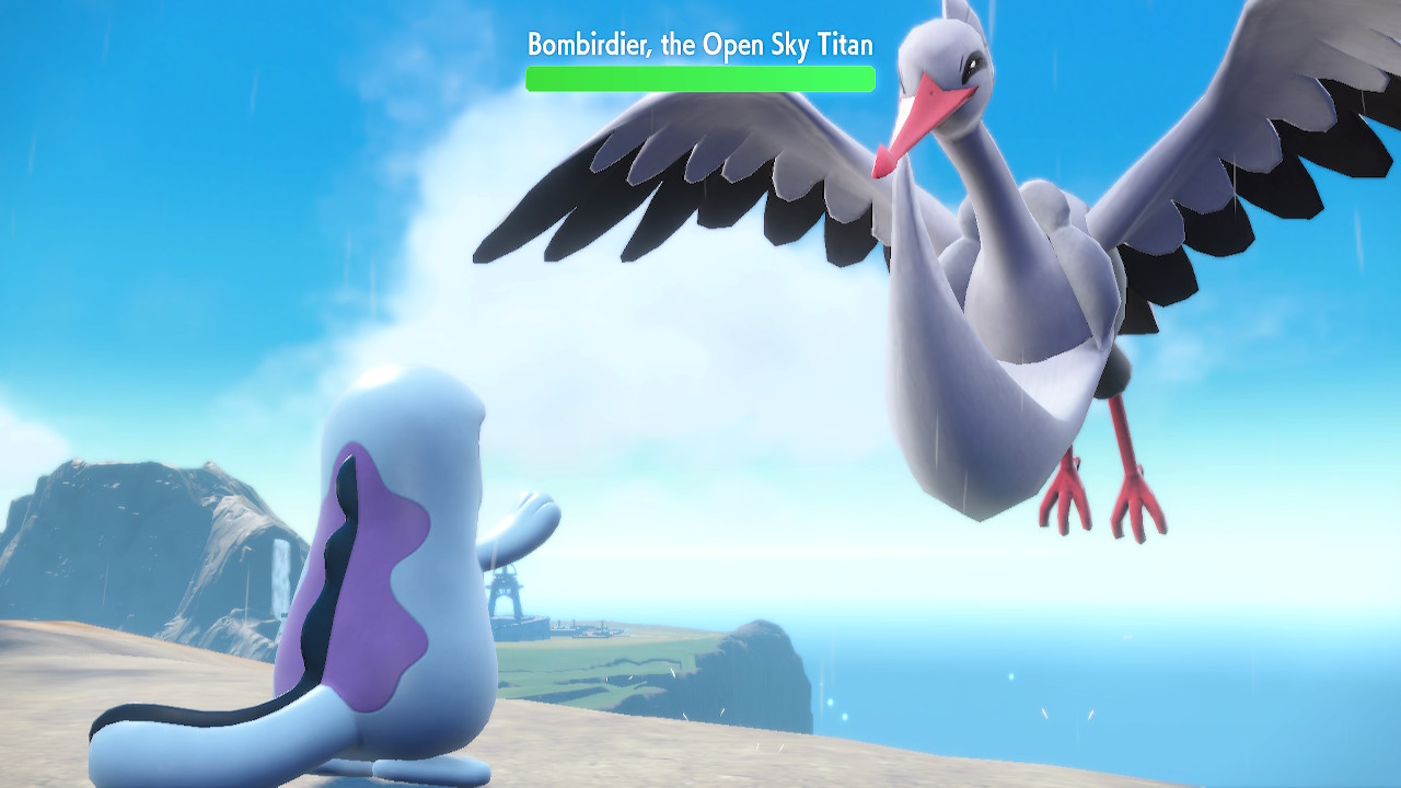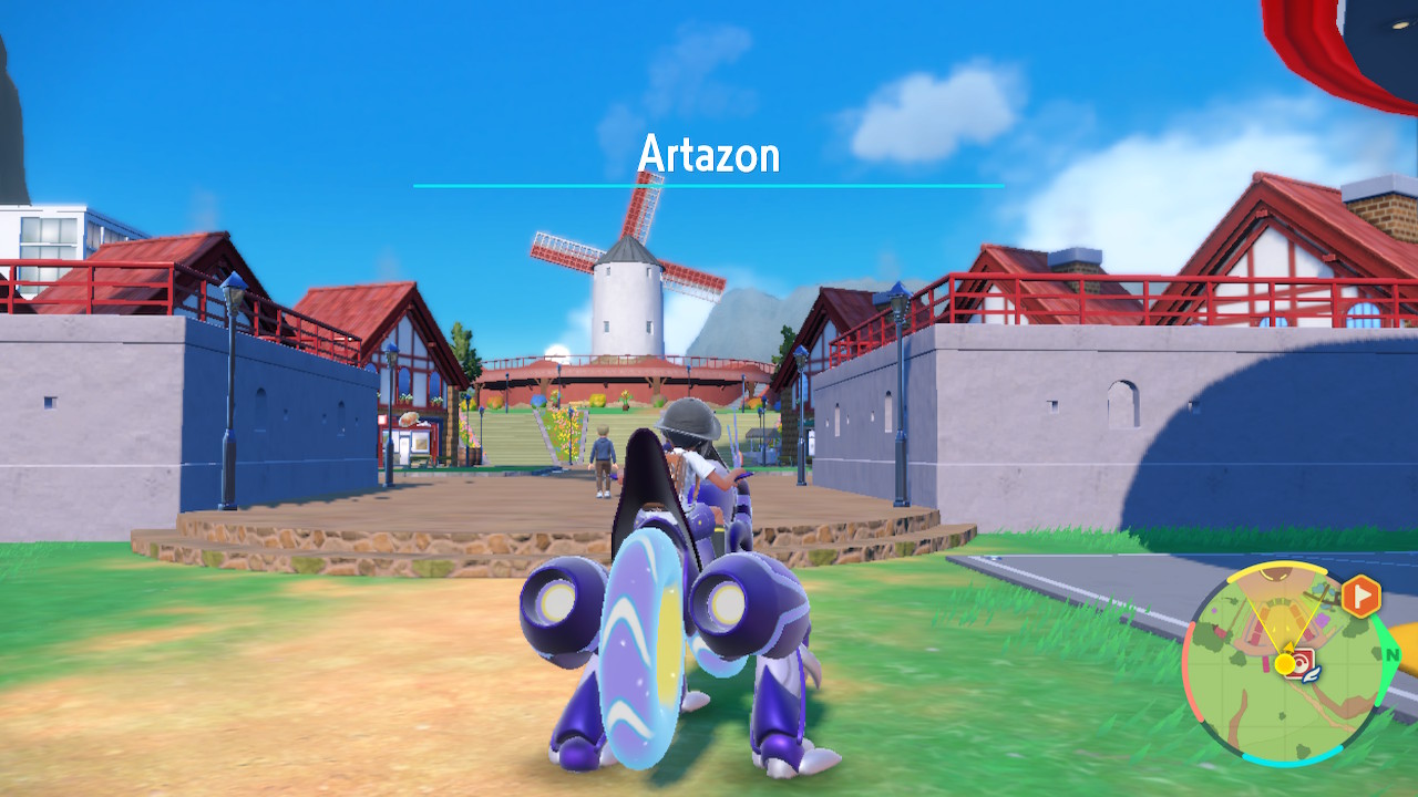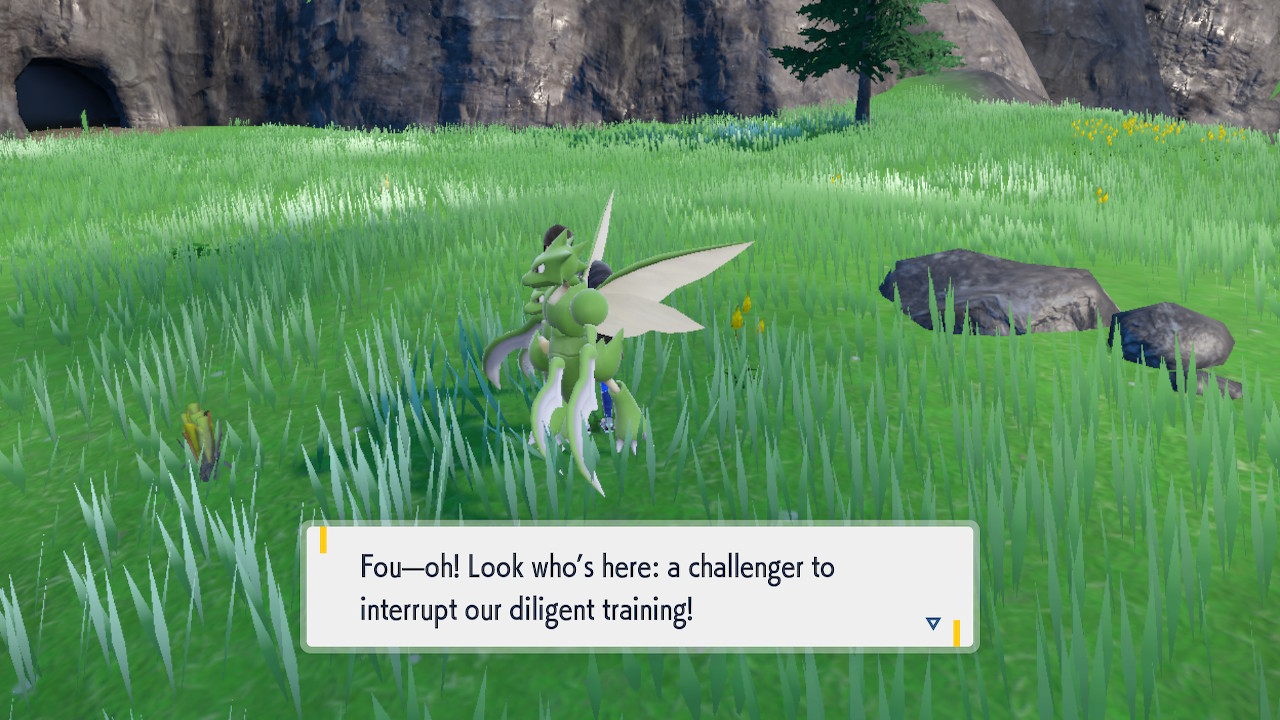 So this is a Pokemon game, that hasn’t fundamentally changed. They’ve tried mixing up the core gameplay in spinoffs and the like, but the main games have been remarkably consistent. You get your first Pokemon, which is pretty much always a fire, water, or grass type. Then you build up a team that can defeat all the gym leaders, bad guys, tough mons, and whatever else comes your way. Then you fight the elite four, then the champion, then you become the champion, and then there’s some post game stuff but you’re mostly done already. That gameplay loop hasn’t really changed much. I think it’s fair to say this game makes more changes to that structure than usual, but it doesn’t fundamentally upend the structure. We still got the gym leaders, though we have much more flexibility with the order we fight them than usual. But they have fixed levels and some of them are hard to reach without Miraidon upgrades so there’s a certain order we’re incentivized to fight them in. Roughly. Like you’re probably not going to fight Grusha before Katy the bug type lady. You might fight Grusha before Tulip, I know I did.
