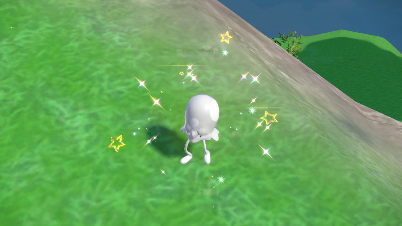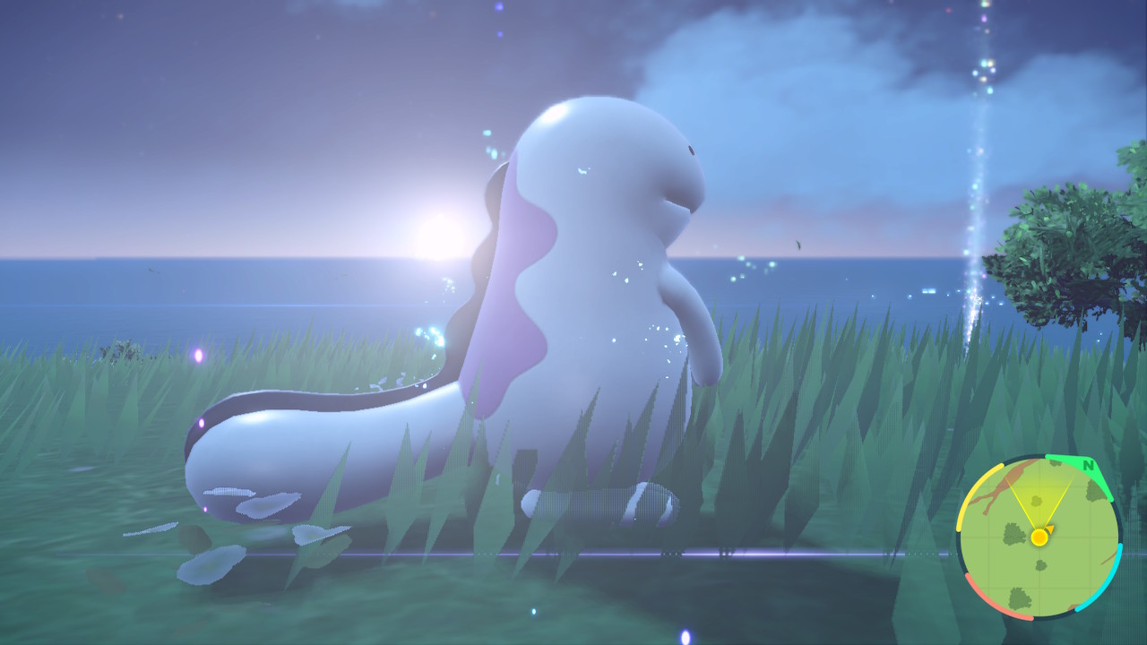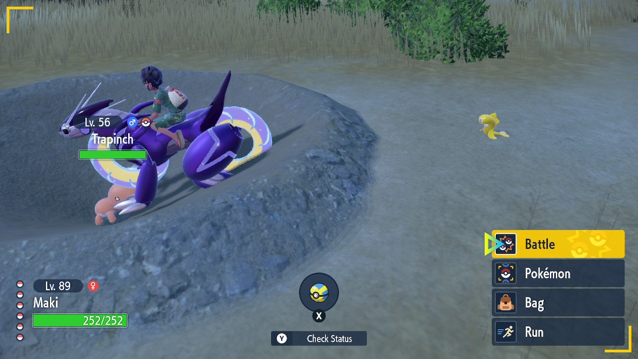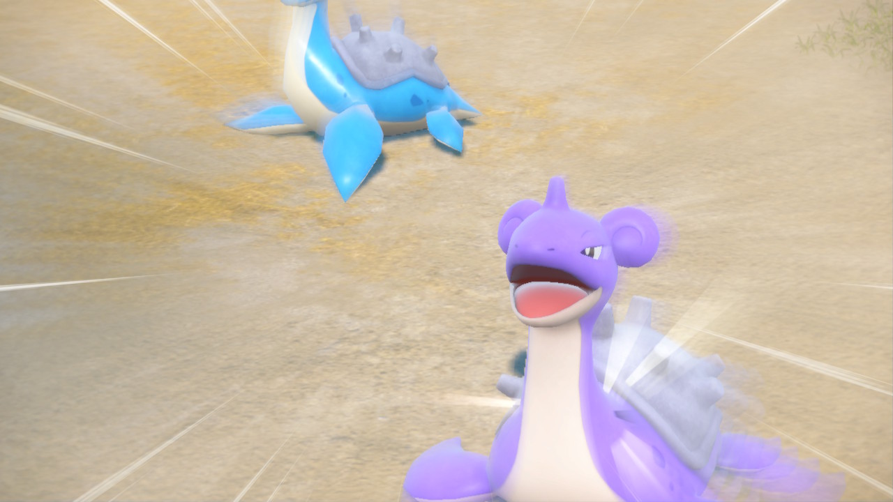 Besides that what else is there to mention… right, the wild encounters. So this time around Game Freak has done something a bit different, they removed random encounters altogether. All the wild Pokemon you want to catch are now roaming around aimlessly for you to walk into. You could argue it’s more immersive this way. And it probably would be if you saw the Pokemon behave more like actual creatures with lives more often. Occasionally you get a taste of that. Like how the cute little sandiles swim through the sand partially covered. But most of the time they’re just kinda hanging around. This also makes shiny hunting easier except when it comes to Pokemon that barely look any different as a shiny. With this new approach I encountered more wild shiny Pokemon than ever before. Also this happened.