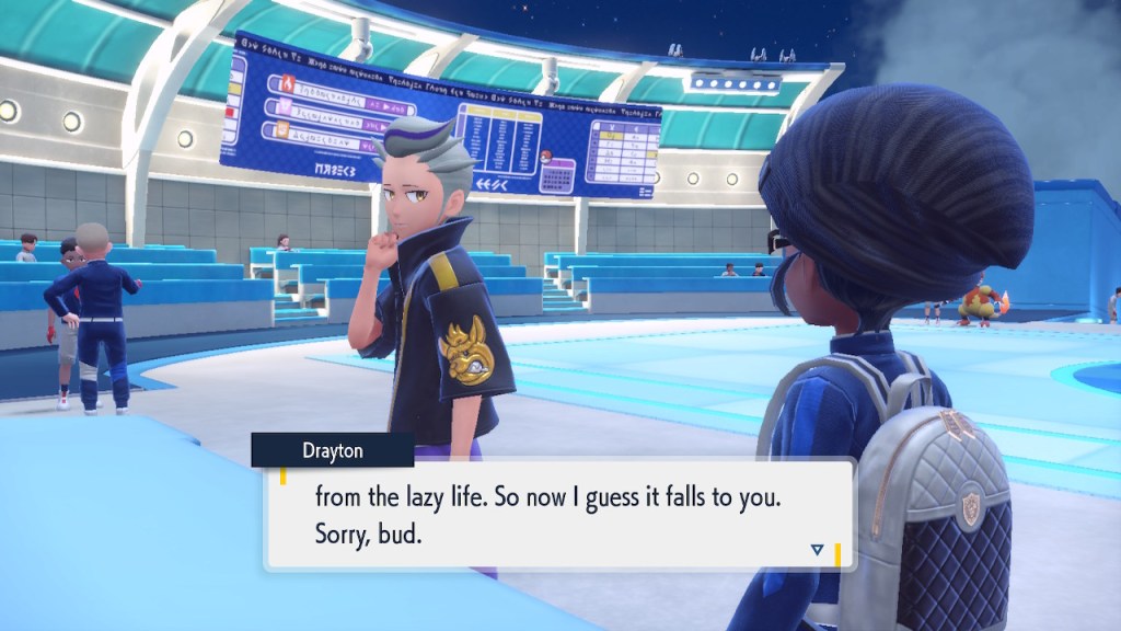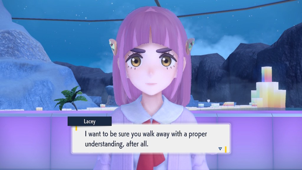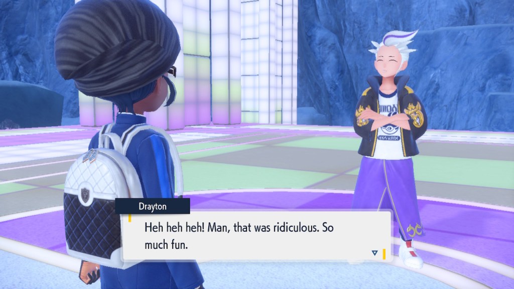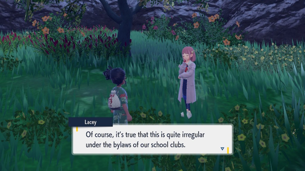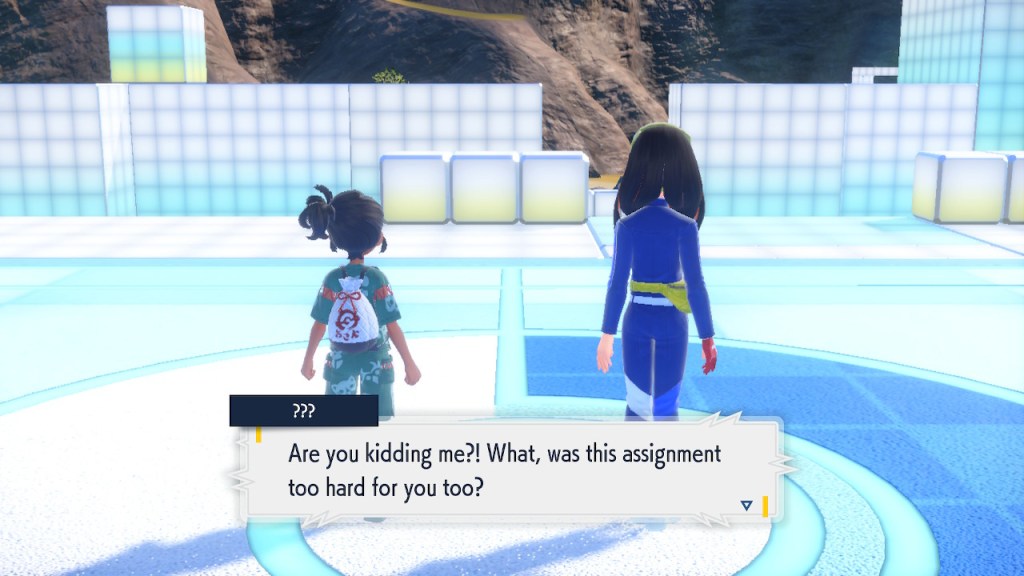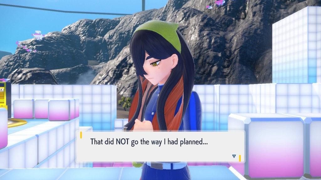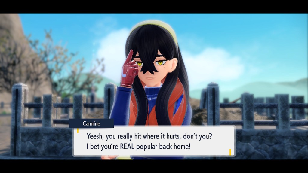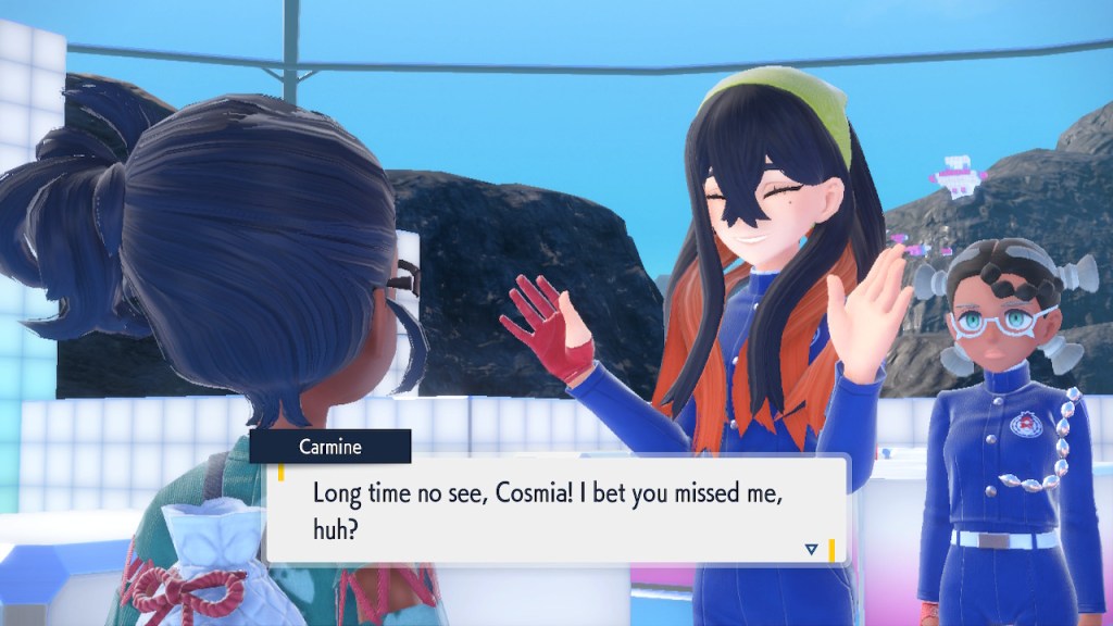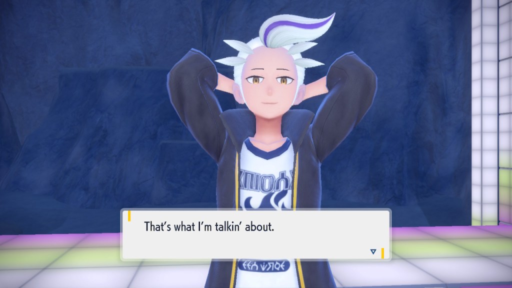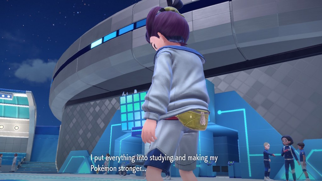 Do you remember the name of that Black and White Elite Four lady I showed the screenshot of earlier? Her name’s Shauntal. If you don’t remember I don’t blame you because I didn’t either. But now I do because I wrote this blog and shit she’s kinda cute. Thanks Pokemon Violet, I now remember that Shauntal exists and I probably will do very little with that information. Because she’s one of those many neat looking but not much else characters that Pokemon has created and moved on from. Most of this game’s cast will have the same fate. Nemona and Penny might last. Rika could last. Certain DLC characters might last. Otherwise… maybe the anime will do some other characters a favor? Maybe.