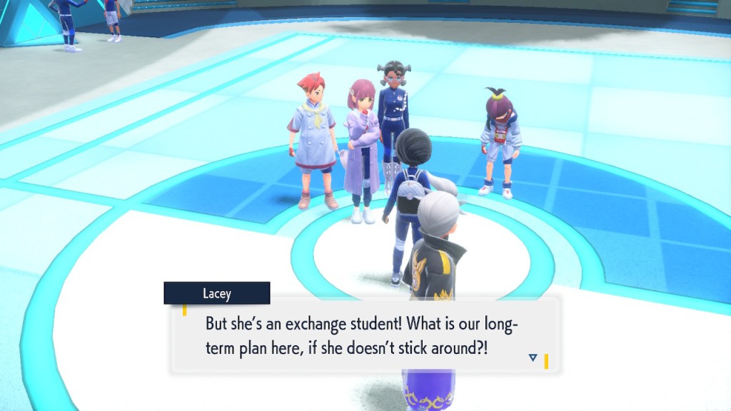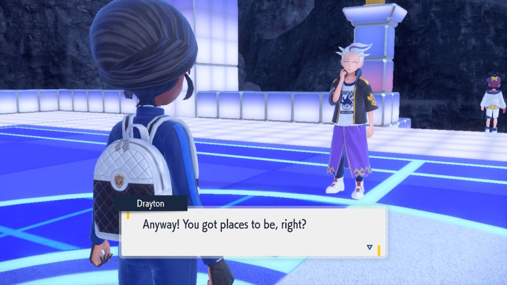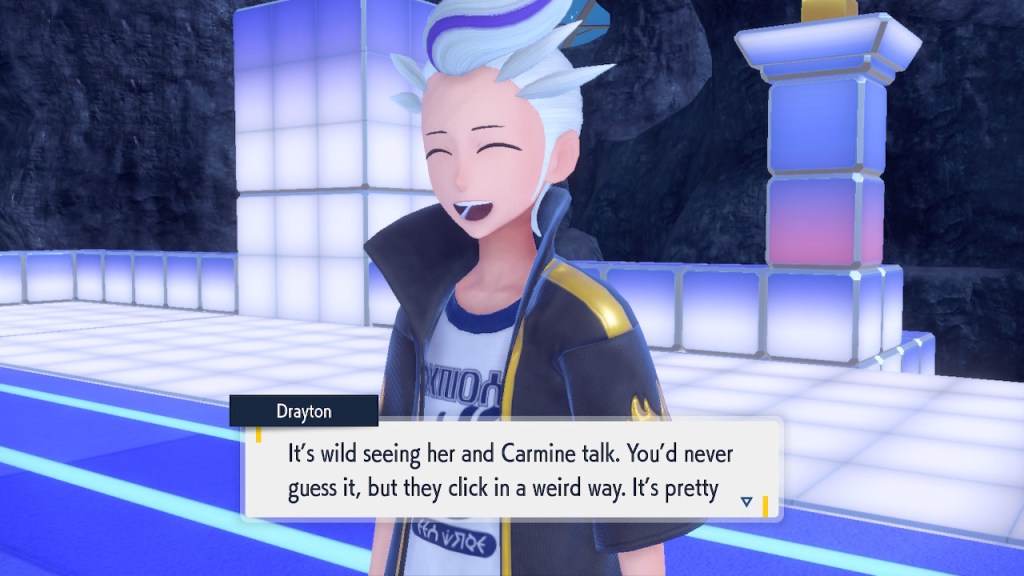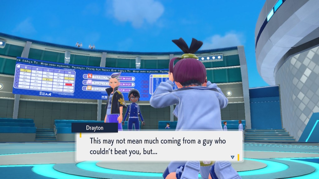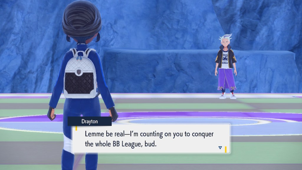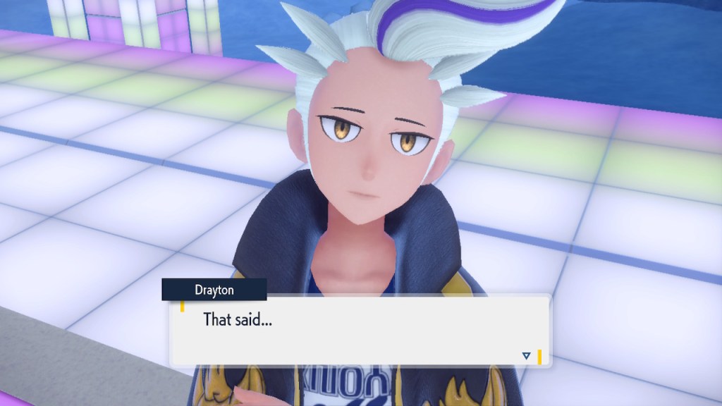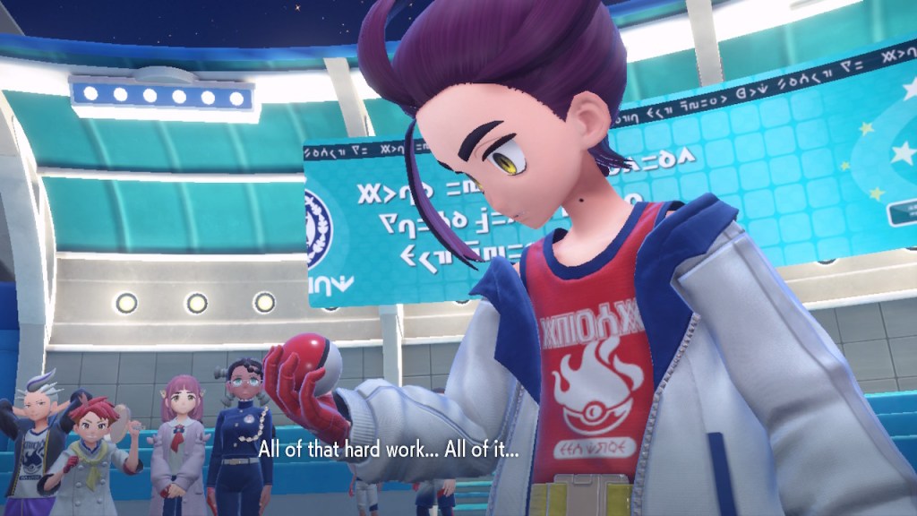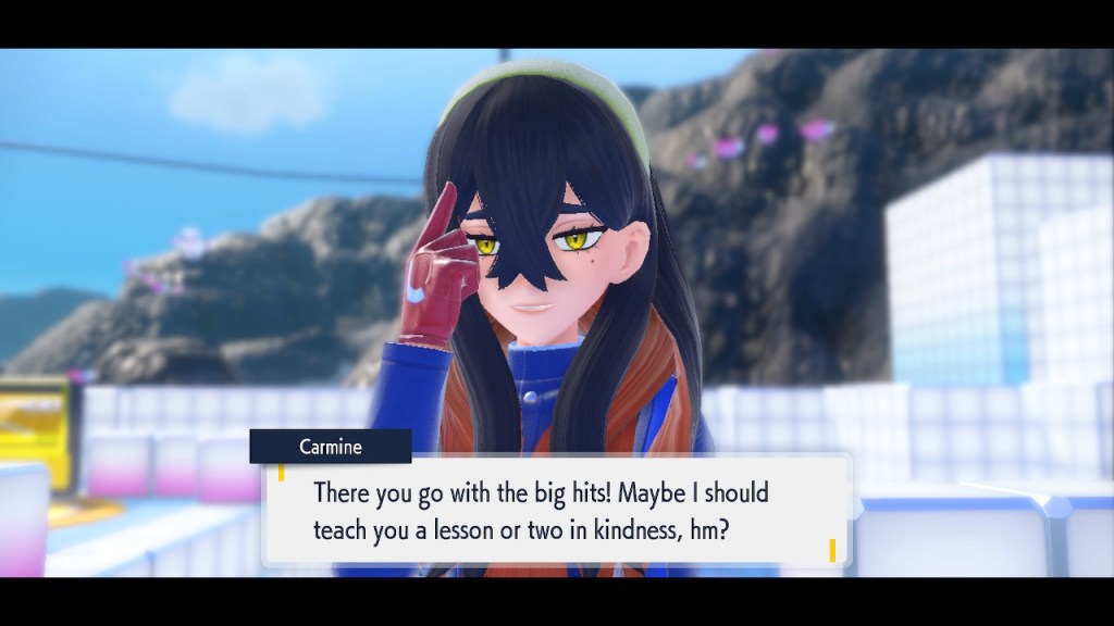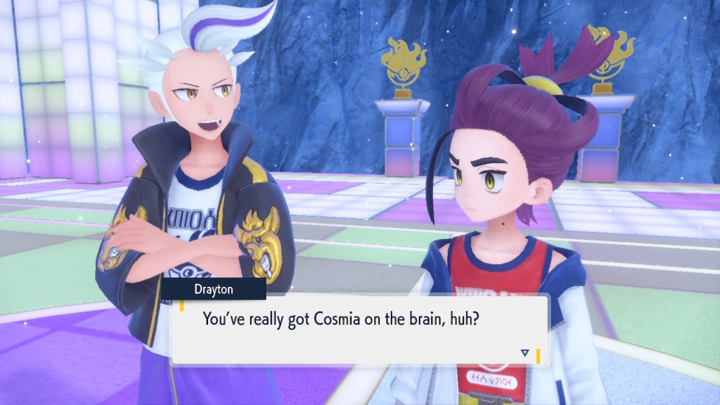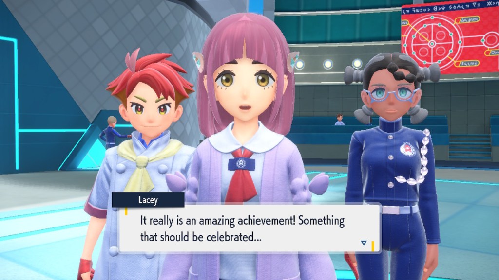 Do you remember the name of that Black and White Elite Four lady I showed the screenshot of earlier? Her name’s Shauntal. If you don’t remember I don’t blame you because I didn’t either. But now I do because I wrote this blog and shit she’s kinda cute. Thanks Pokemon Violet, I now remember that Shauntal exists and I probably will do very little with that information. Because she’s one of those many neat looking but not much else characters that Pokemon has created and moved on from. Most of this game’s cast will have the same fate. Nemona and Penny might last. Rika could last. Certain DLC characters might last. Otherwise… maybe the anime will do some other characters a favor? Maybe.