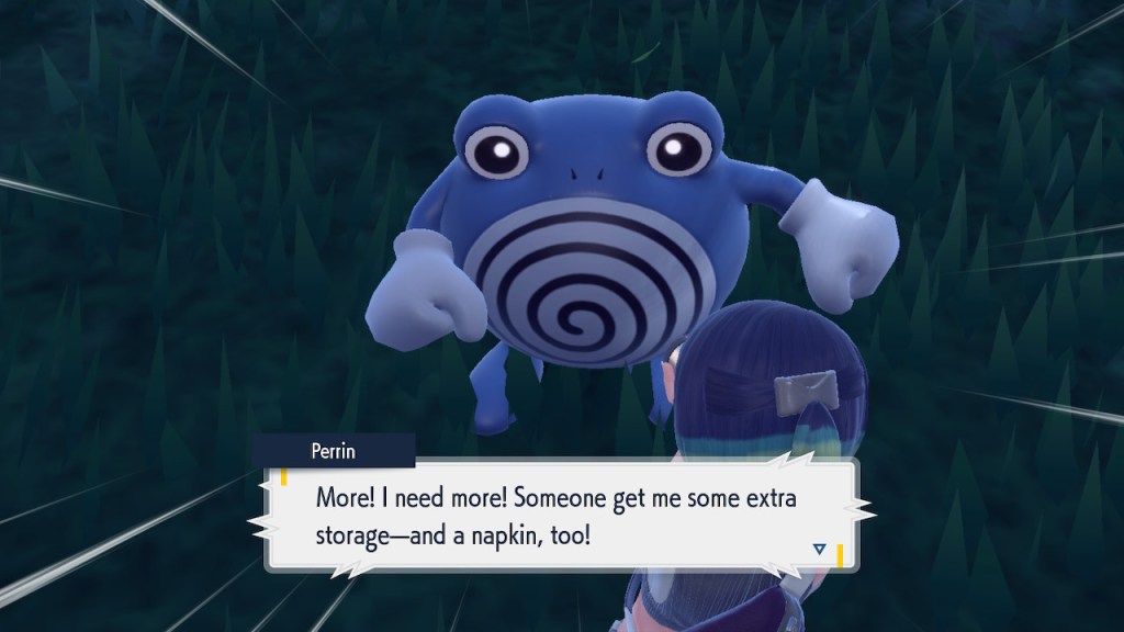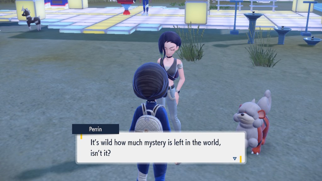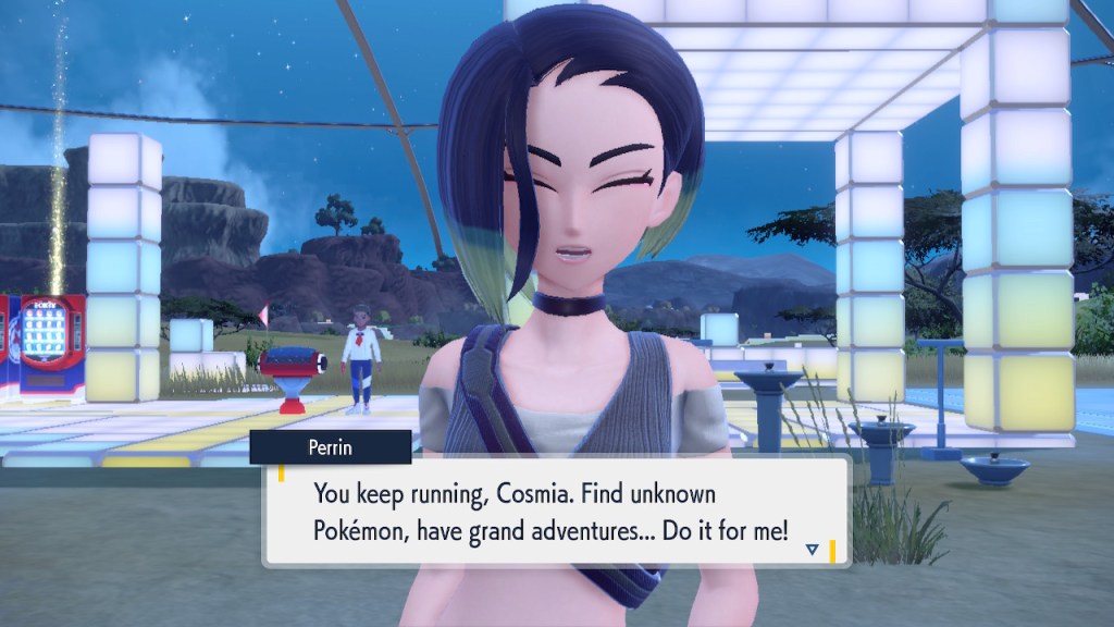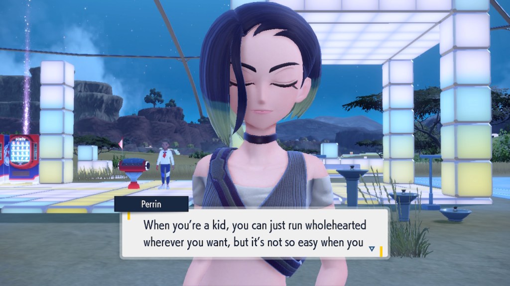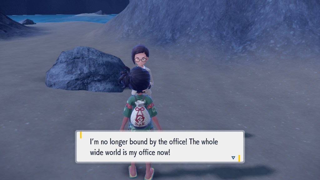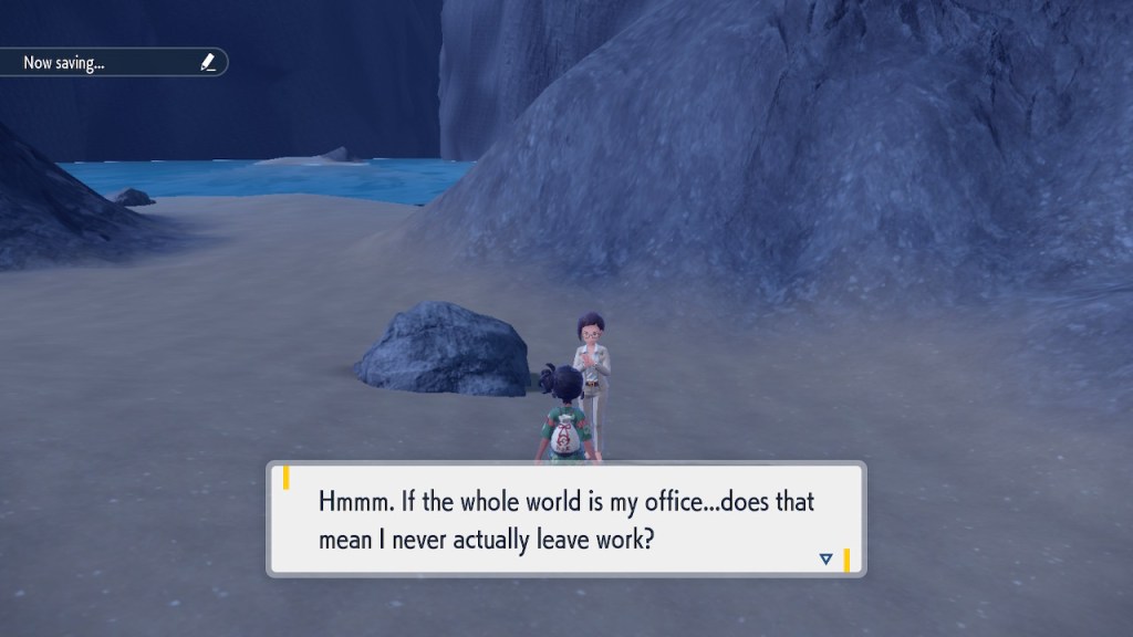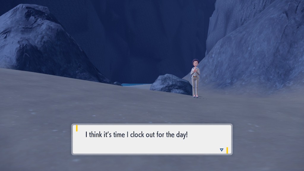 Any ways, soon after you step inside the Terrarium you get to see Perrin again. It’s always good to see her. The less good part is that she wants you to catch 200 Pokemon this time. Needless to say that was a slog. To get to 200 you pretty much need to catch starters. To catch starters you need to get a shit load of points from doing random bullshit to pay for the biome upgrades. Each biome gets a separate upgrade and I needed 3 to get over the finish line. And what do we get? Scoops on the locations of a couple Area Zero Pokemon I won’t use. I don’t even get to hang out with Perrin while doing so this time. She talks a bit at the end once you caught them both but it’s nothing like the previous camping trip. I feel like I got ripped off. The Teal Mask Perrin quest was worth my time-ish but this one definitely wasn’t. Fucking hell. At least it ends with some good lines.