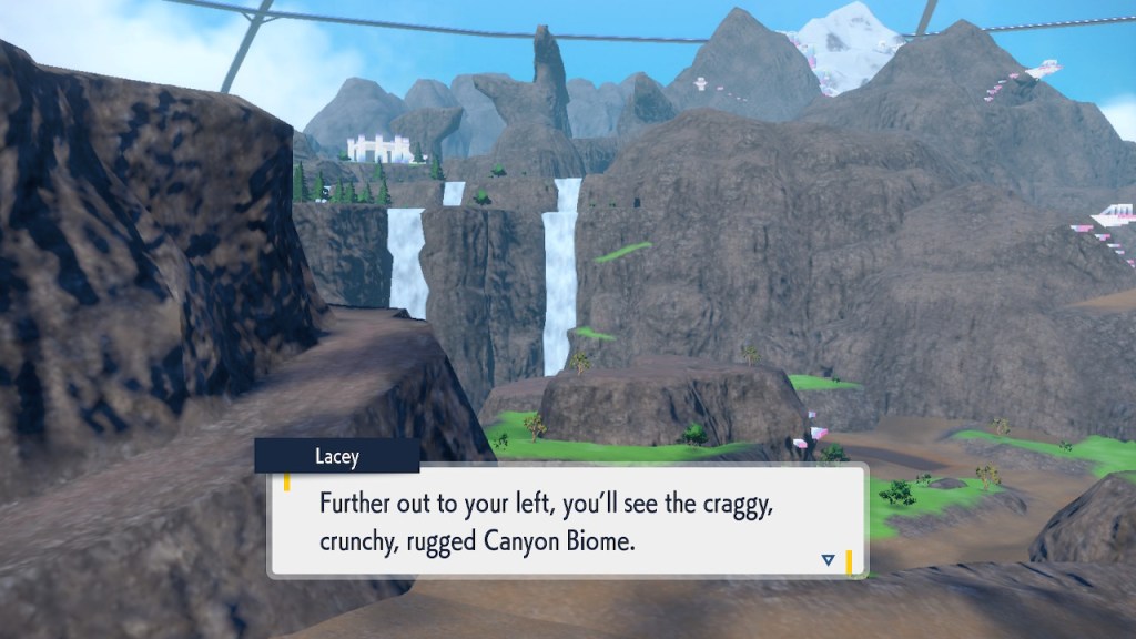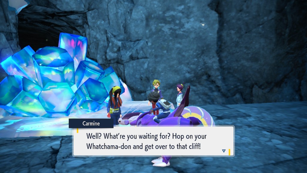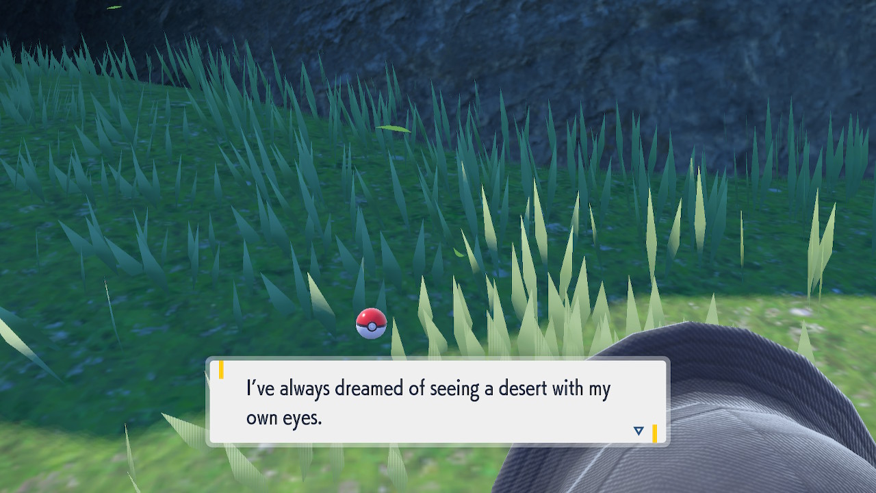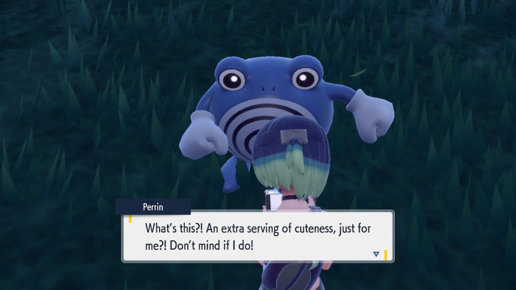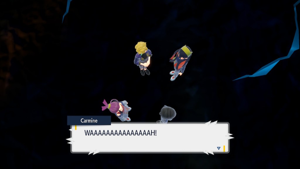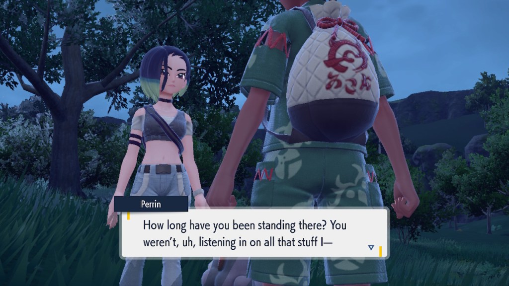 Any ways, soon after you step inside the Terrarium you get to see Perrin again. It’s always good to see her. The less good part is that she wants you to catch 200 Pokemon this time. Needless to say that was a slog. To get to 200 you pretty much need to catch starters. To catch starters you need to get a shit load of points from doing random bullshit to pay for the biome upgrades. Each biome gets a separate upgrade and I needed 3 to get over the finish line. And what do we get? Scoops on the locations of a couple Area Zero Pokemon I won’t use. I don’t even get to hang out with Perrin while doing so this time. She talks a bit at the end once you caught them both but it’s nothing like the previous camping trip. I feel like I got ripped off. The Teal Mask Perrin quest was worth my time-ish but this one definitely wasn’t. Fucking hell. At least it ends with some good lines.