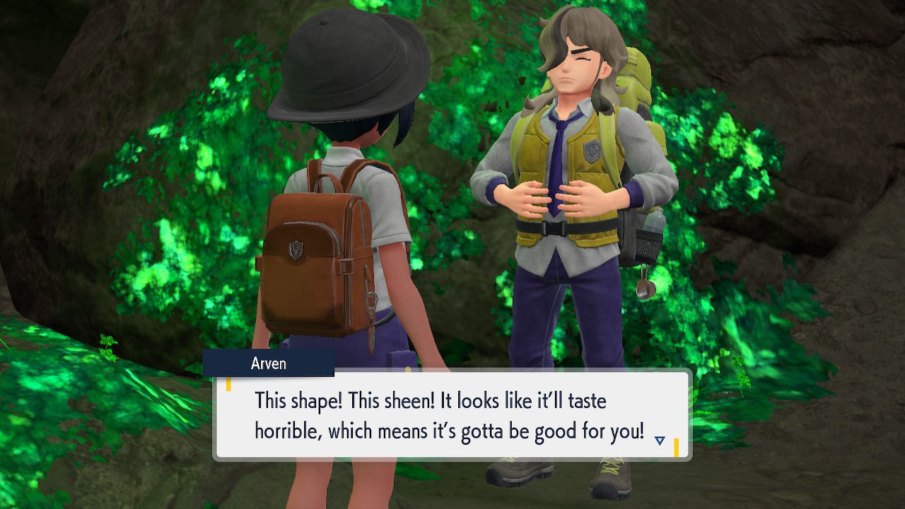 So in Violet you get a future Cyclizar, and presumably in Scarlet you get a Cyclizar from the past. So it went from dinosaur to lizard guy to mecha dinosaur. Interesting evolution path. Also great dad. He’s like “Oh yeah I’m leaving my son all alone. Welp. Any ways.” Even so Arven still finds something to admire in him. Arven’s a good guy, unusually good for his circumstances.