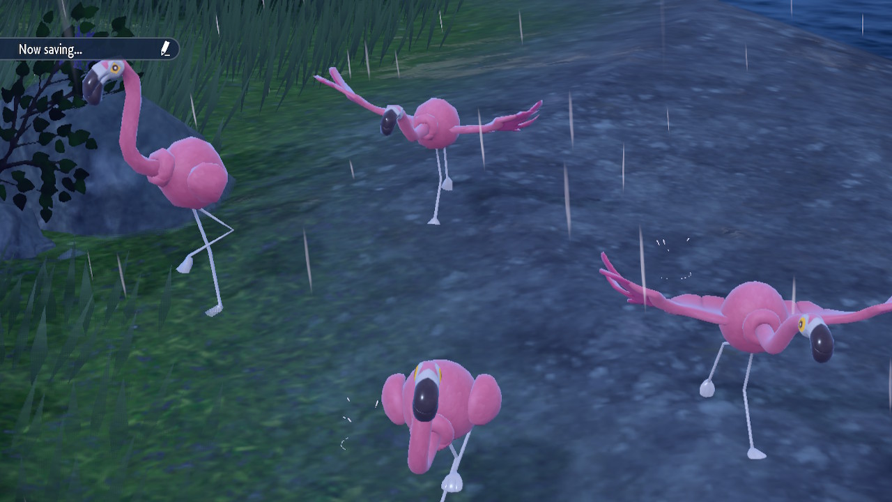I think this is a fair representation of how this game looks. I didn’t just go out of my way to pick the blandest screenshots possible, some of them actually look pretty good. But it’s also safe to say that a lot of them don’t. This is the latest entry in the franchise, on the most powerful hardware this series has ever lived on. And yet… well, honestly I’m hard pressed to think of a Pokemon game that looks worse than this. Now credit where it’s due, some of the lighting effects are pretty good. The character models look mostly fine, though I find the protagonist model a bit unsettling. Some of the interior designs look pretty good too, just look at Larry’s restaurant/gym spot. But what are we dealing with the majority of the time? Landscapes with few if any points of interest and mediocre textures. A whole lot of empty space with a bunch of Pokemon aimlessly wandering around. It would be one thing if it felt like a lived in environment, but no. Who knows where the hell these Pokemon get their food. Who knows what so many are hanging around the same space for. They’re just kinda walking around most of the time.