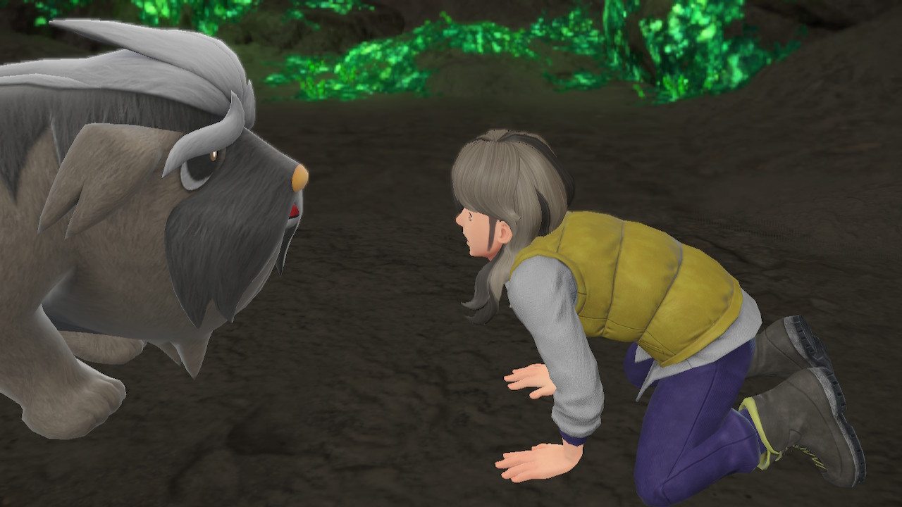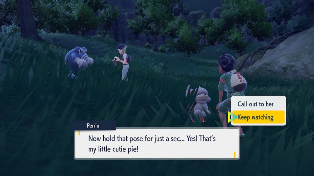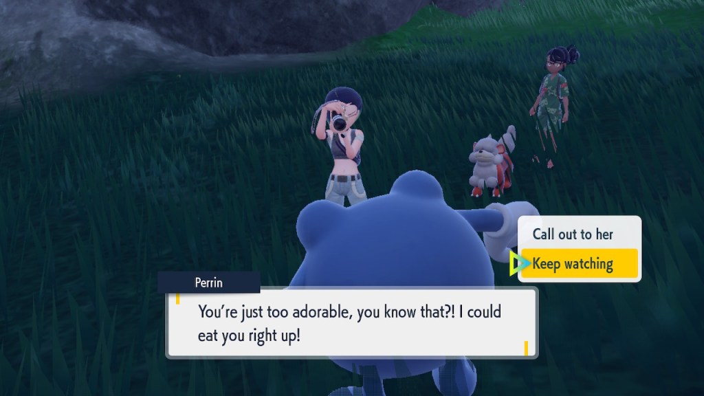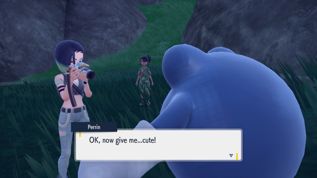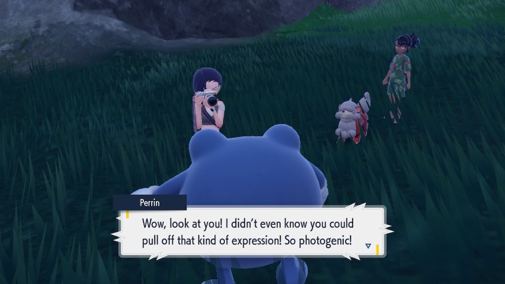 Any ways, when you actually catch 150 Pokemon Perrin is pretty surprised. I guess she just threw a big number out there to get you to buzz off, but that won’t stop this neurodivergent adult simp cosplaying as a brown girl for some inexplicable reason! Turns out Perrin’s on the hunt to snap some photos of a rare creature, a particularly strong Ursuluna called the Bloodmoon Beast. She’s been feeling a bit of a creative slump and was hoping finding the big guy would ignite something. So we join her on a night expedition and have a good time.