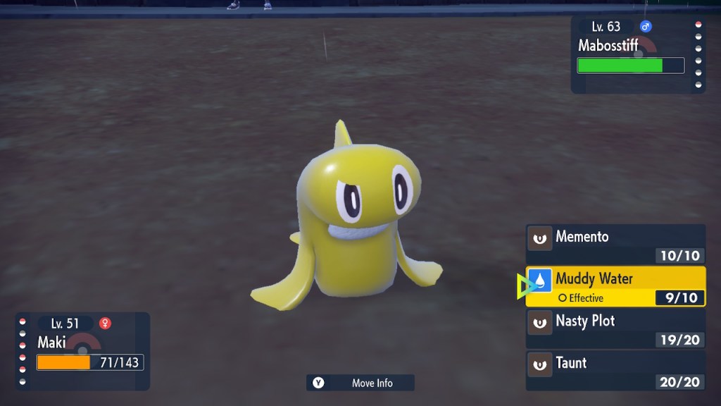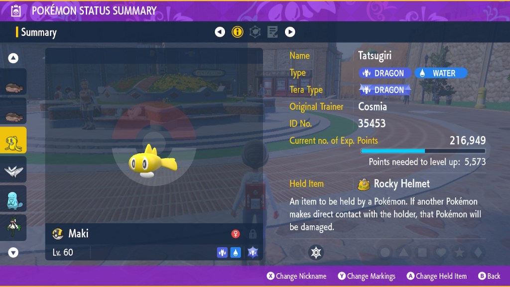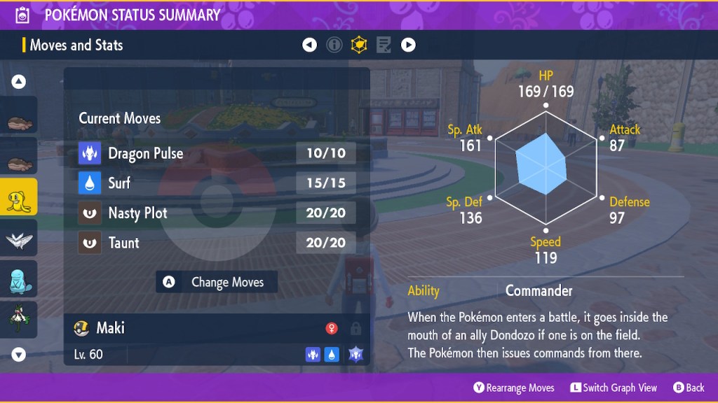 So now I must mention my favorite new pokemon that isn’t a remix of a pre-existing pokemon: Tatsugiri. Part sushi, part dragon, all deadly. I caught the first one I came across and named her Maki. Partly because that’s a sushi thing, but it’s also in honor of the Ultimate Assassin, Maki Harukawa. Just like that Maki, this Maki’s quite talented at killing stuff. Even if she’s supposed to be at her strongest piloting a Dondozo, the above average speed and special attack gets you plenty far on its own.