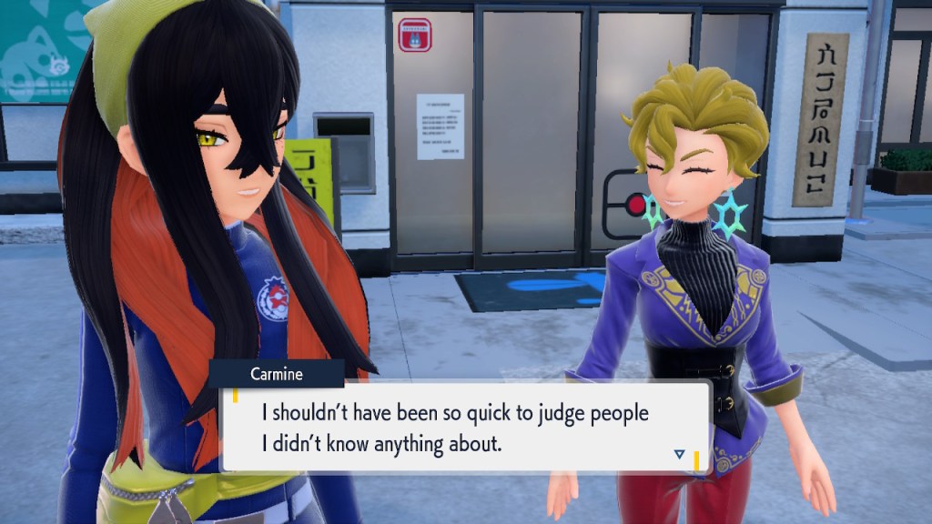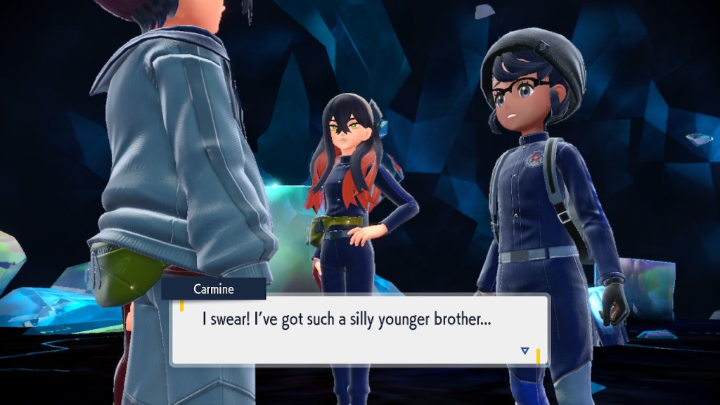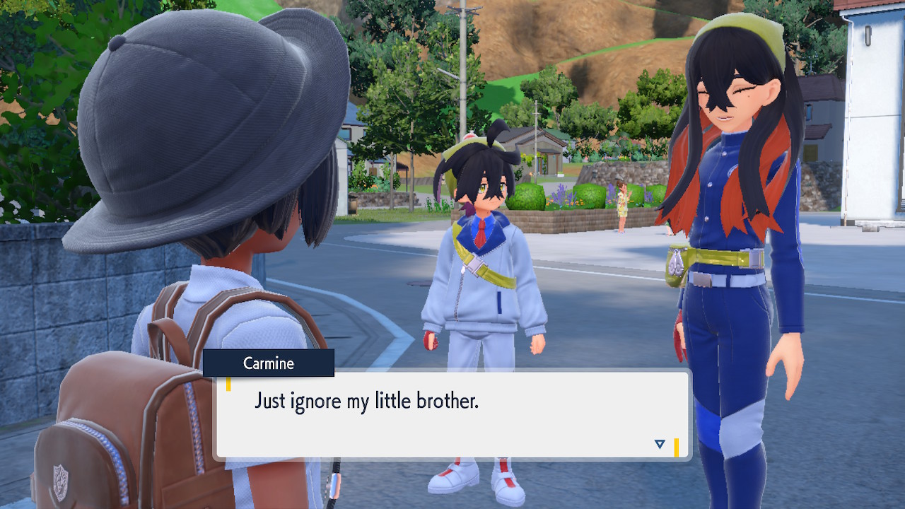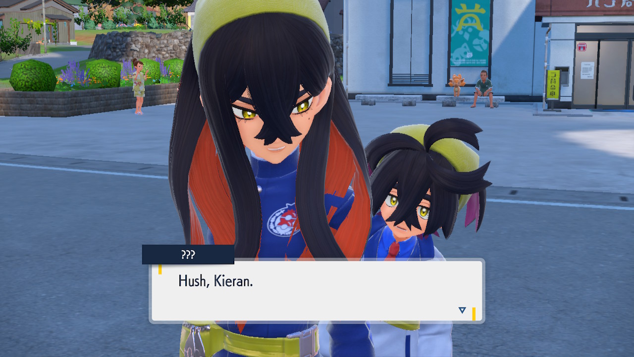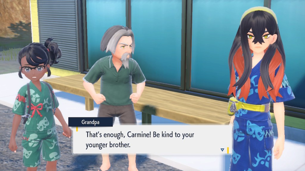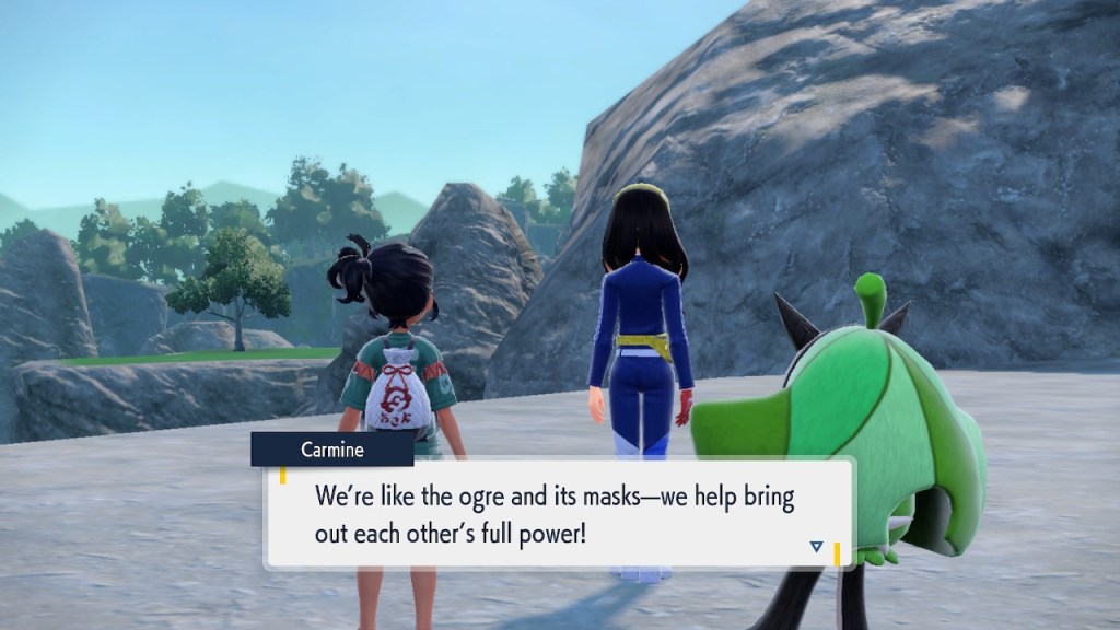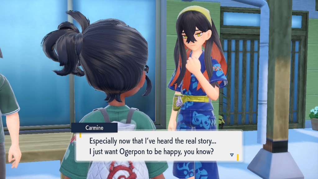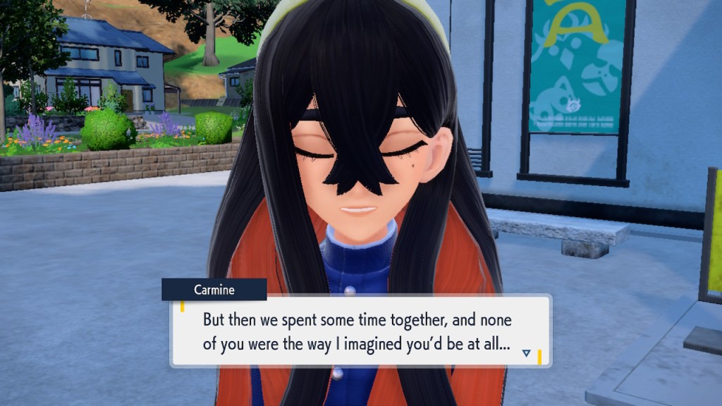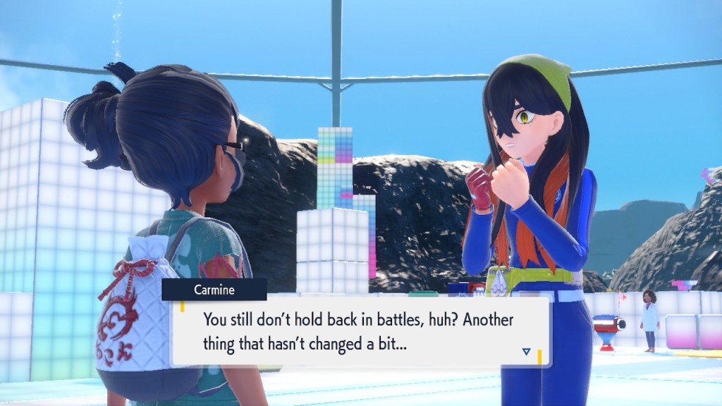 When we first meet Kieran he’s pretty heavily reliant on Carmine. He’s hiding behind her when we first meet him. While he doesn’t exactly agree with everything Carmine says or does he isn’t very assertive about it. For Carmine’s part she’s perfectly willing to help him out and take the lead. However when the player character and Ogerpon show up it throws a wrench in that dynamic. Kieran stops being her meek and subservient little brother and lets jealousy flourish. She doesn’t really know how to handle the change. To be fair to her, it would probably be difficult for anybody to handle. Yet Carmine’s abrasive personality certainly doesn’t do her any favors. It must be difficult to be a sibling at odds with one another. Especially if you still live together. You can’t exactly sever ties, you’re going to have a bond regardless. But if things can’t flow like they usually do and you don’t know how to fix it that must be a difficult feeling.