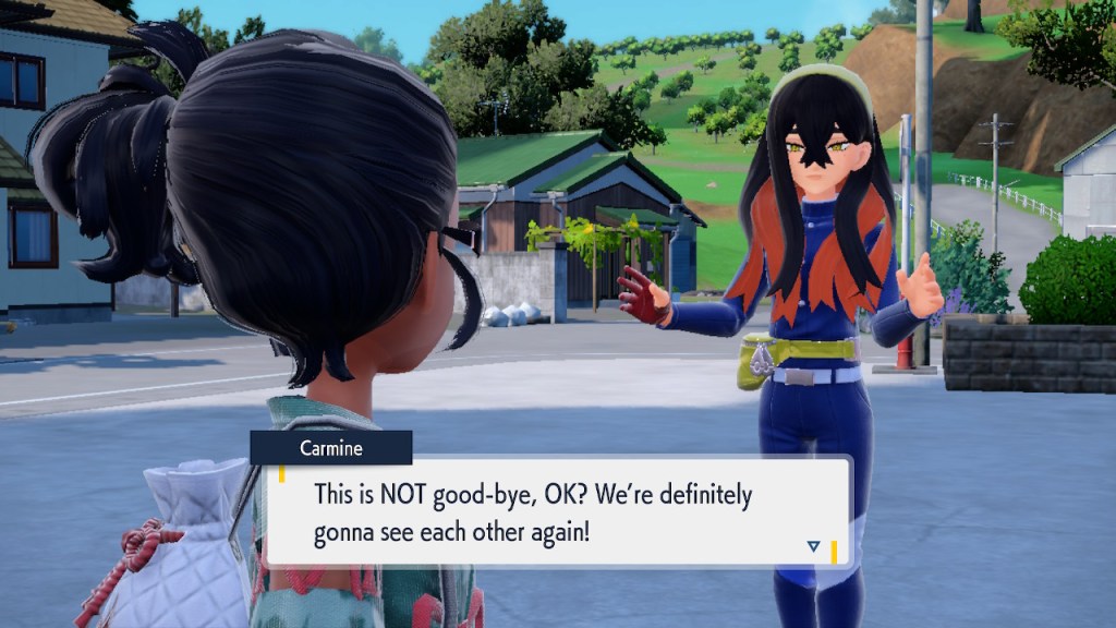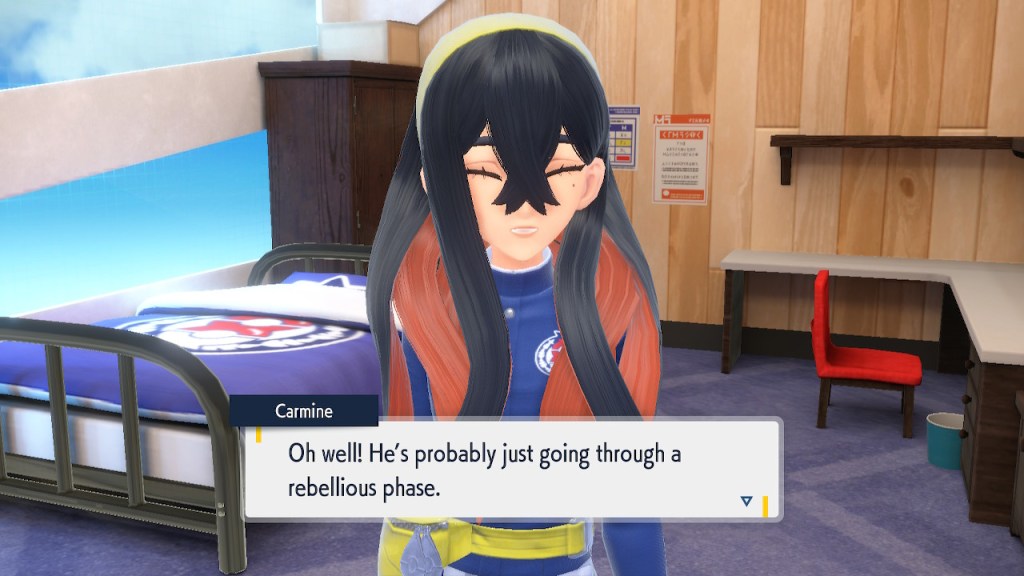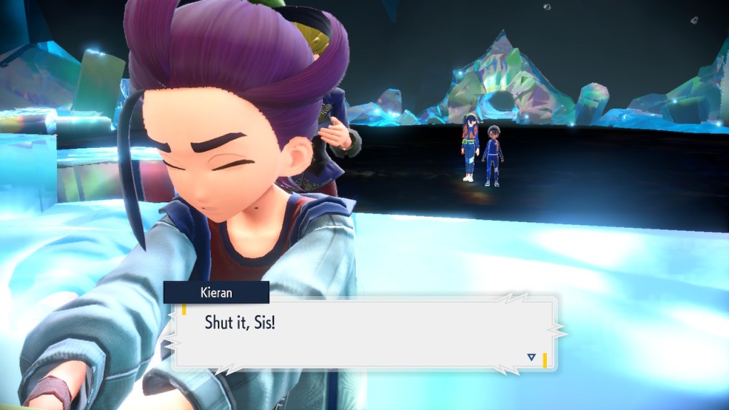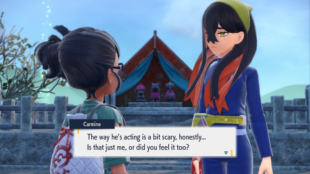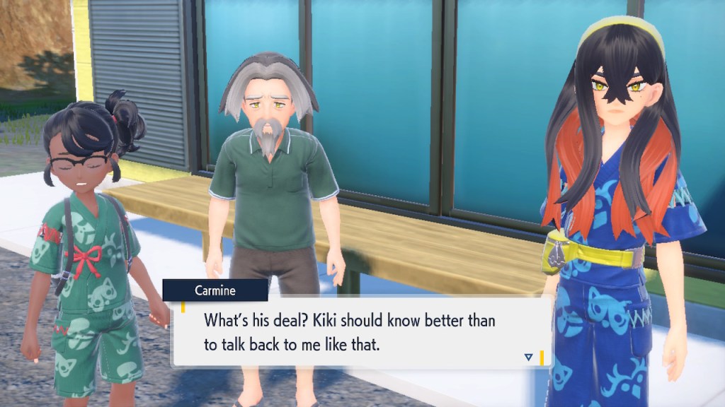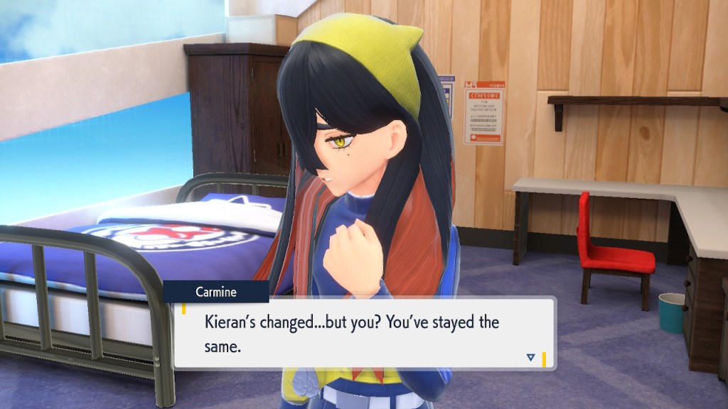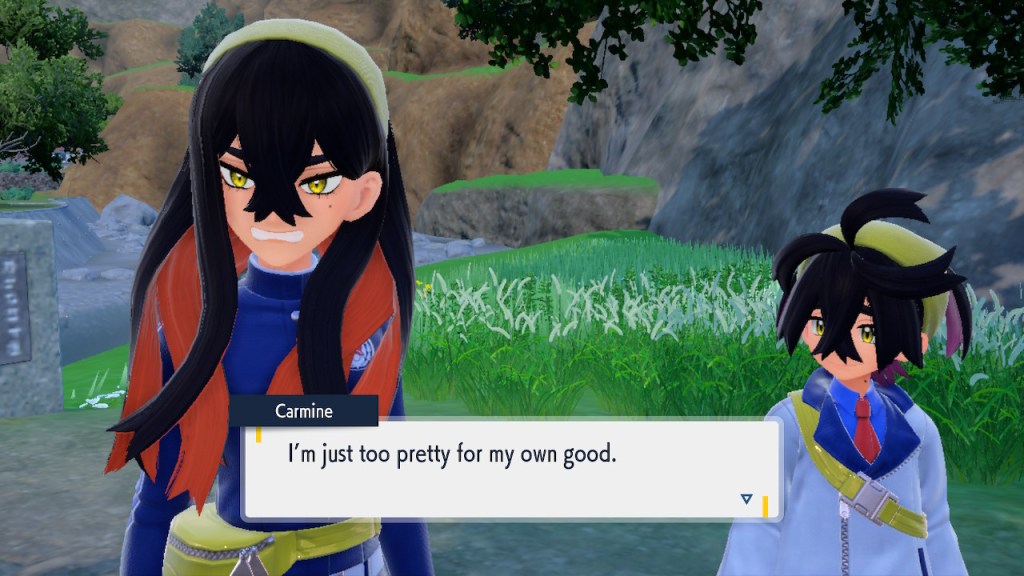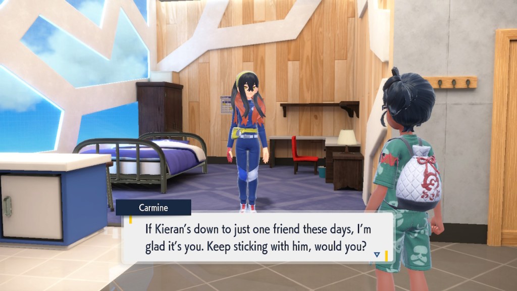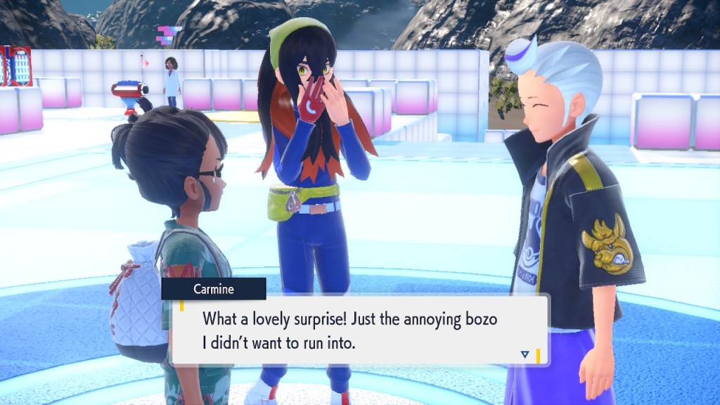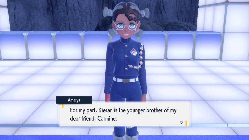 When we first meet Kieran he’s pretty heavily reliant on Carmine. He’s hiding behind her when we first meet him. While he doesn’t exactly agree with everything Carmine says or does he isn’t very assertive about it. For Carmine’s part she’s perfectly willing to help him out and take the lead. However when the player character and Ogerpon show up it throws a wrench in that dynamic. Kieran stops being her meek and subservient little brother and lets jealousy flourish. She doesn’t really know how to handle the change. To be fair to her, it would probably be difficult for anybody to handle. Yet Carmine’s abrasive personality certainly doesn’t do her any favors. It must be difficult to be a sibling at odds with one another. Especially if you still live together. You can’t exactly sever ties, you’re going to have a bond regardless. But if things can’t flow like they usually do and you don’t know how to fix it that must be a difficult feeling.