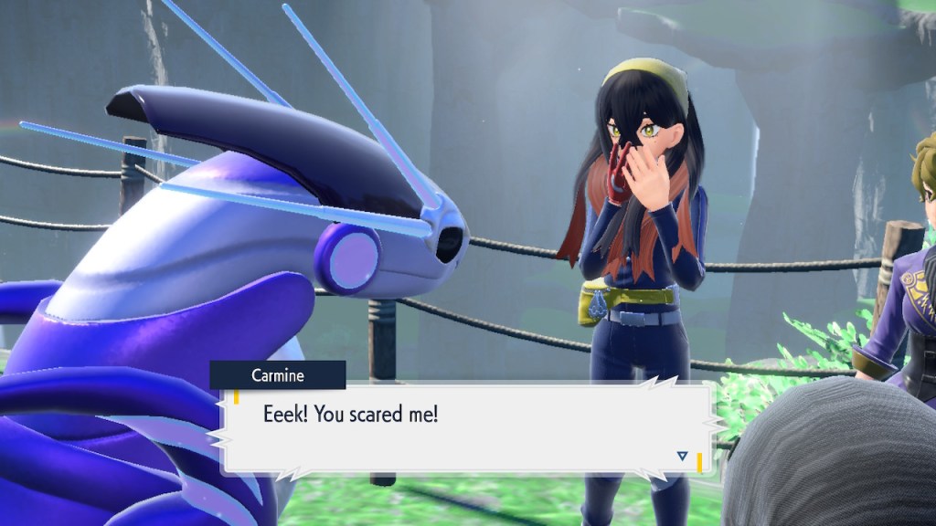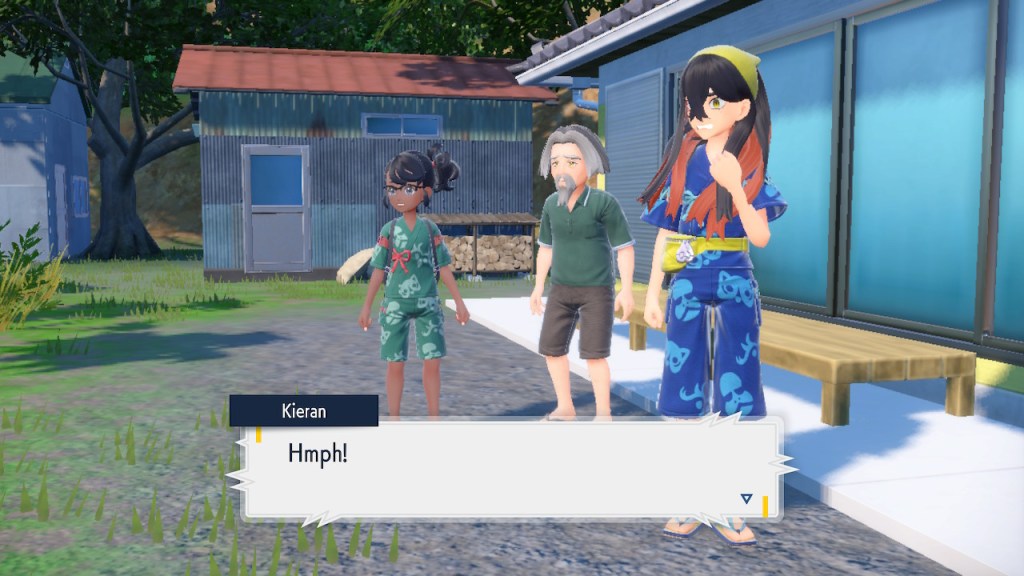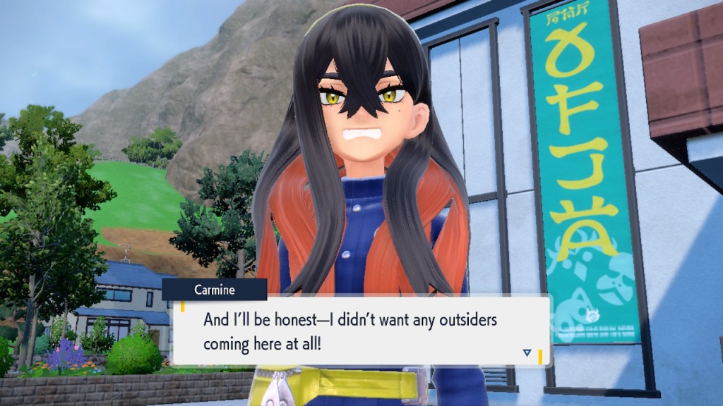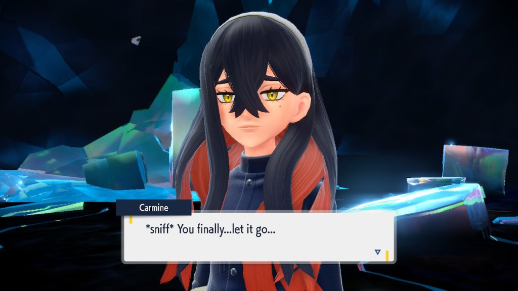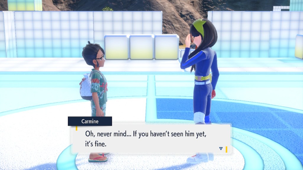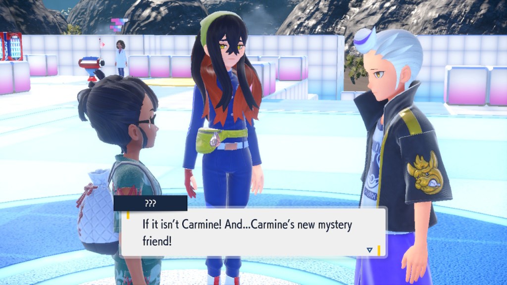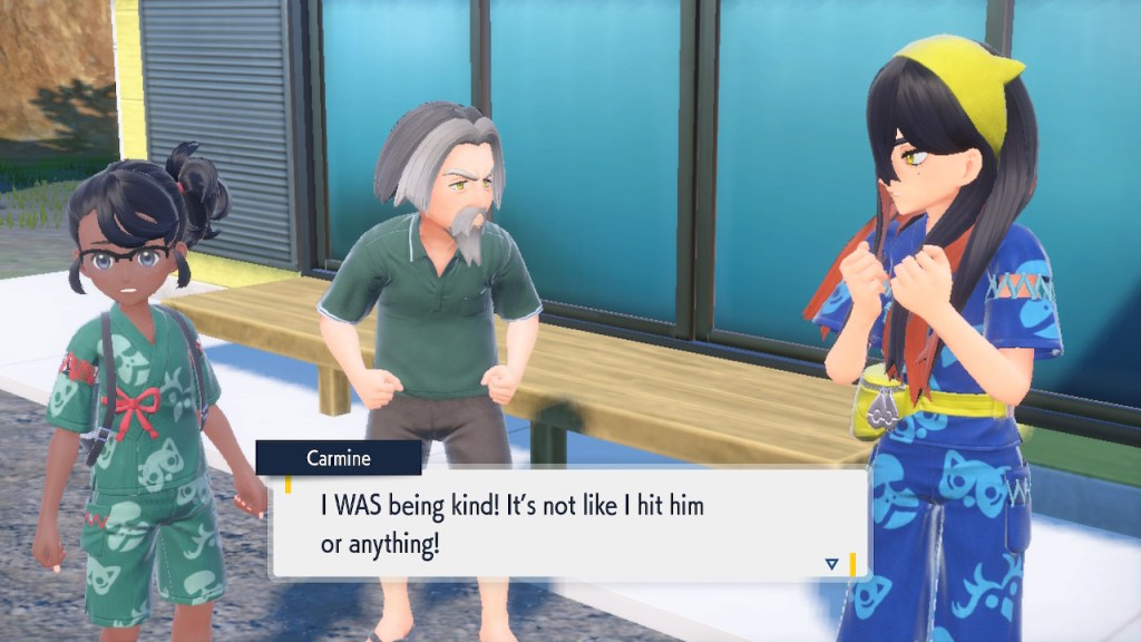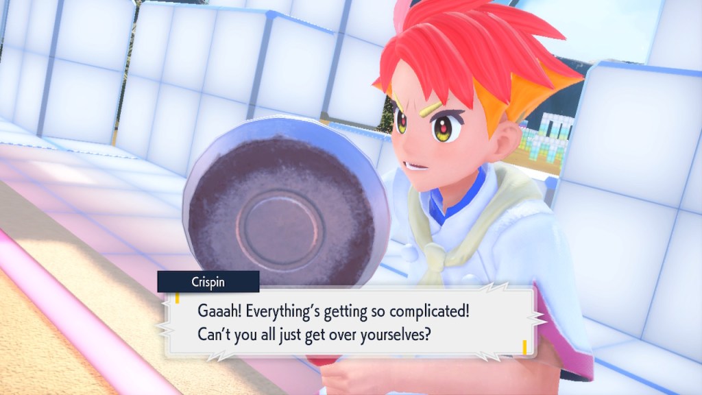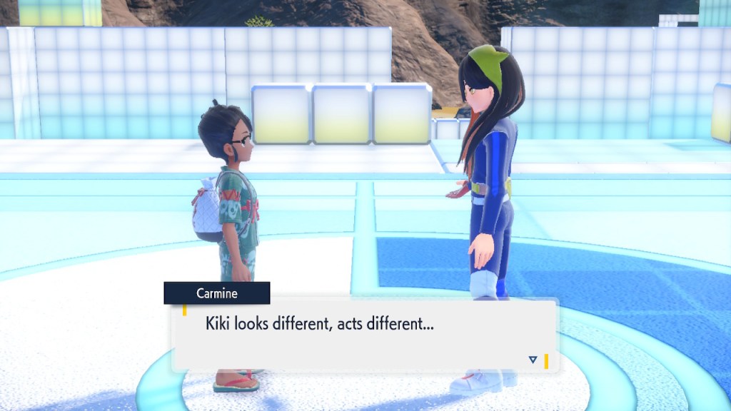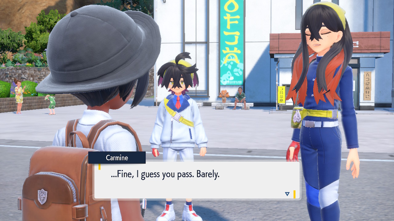 When we first meet Kieran he’s pretty heavily reliant on Carmine. He’s hiding behind her when we first meet him. While he doesn’t exactly agree with everything Carmine says or does he isn’t very assertive about it. For Carmine’s part she’s perfectly willing to help him out and take the lead. However when the player character and Ogerpon show up it throws a wrench in that dynamic. Kieran stops being her meek and subservient little brother and lets jealousy flourish. She doesn’t really know how to handle the change. To be fair to her, it would probably be difficult for anybody to handle. Yet Carmine’s abrasive personality certainly doesn’t do her any favors. It must be difficult to be a sibling at odds with one another. Especially if you still live together. You can’t exactly sever ties, you’re going to have a bond regardless. But if things can’t flow like they usually do and you don’t know how to fix it that must be a difficult feeling.
