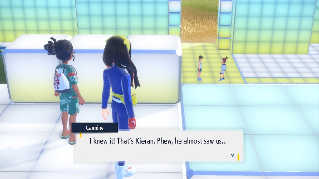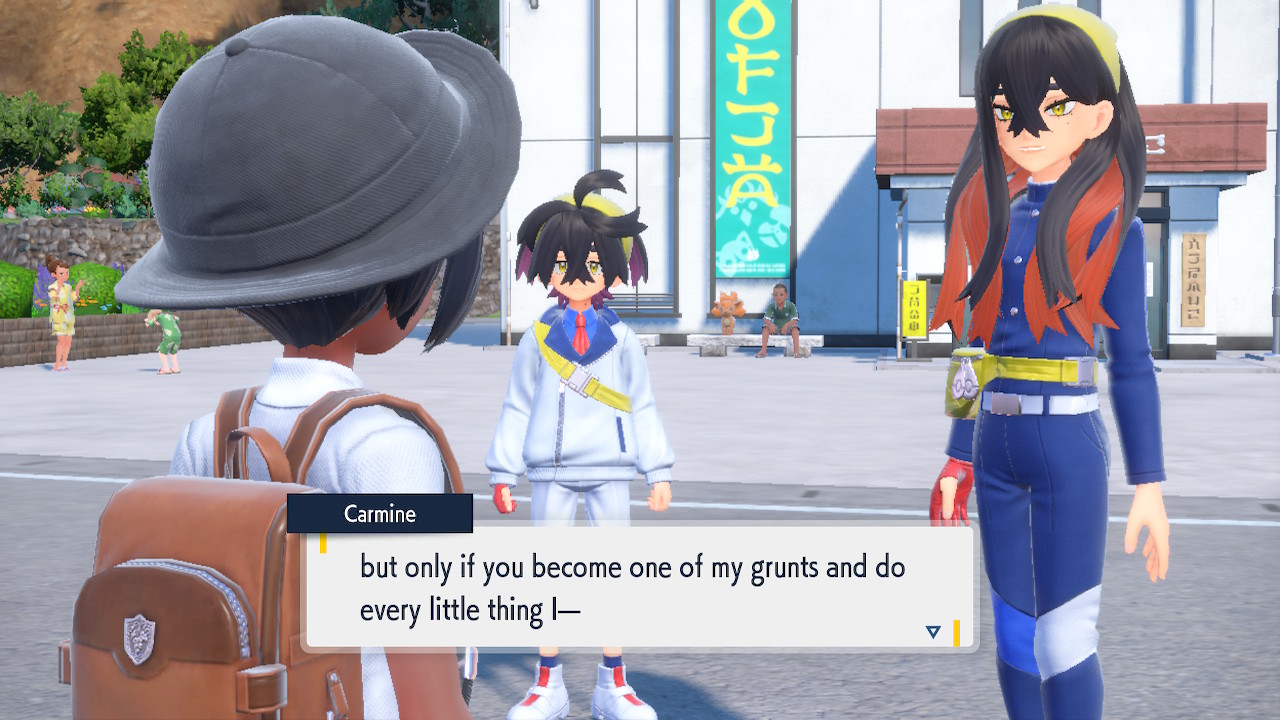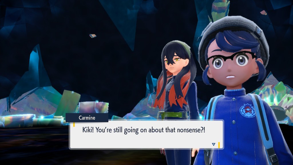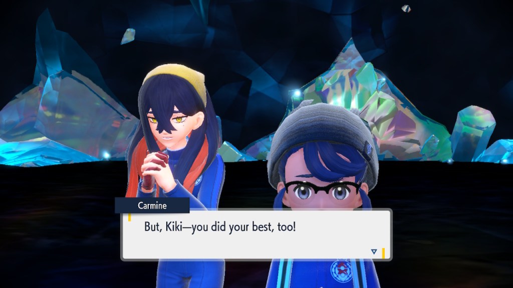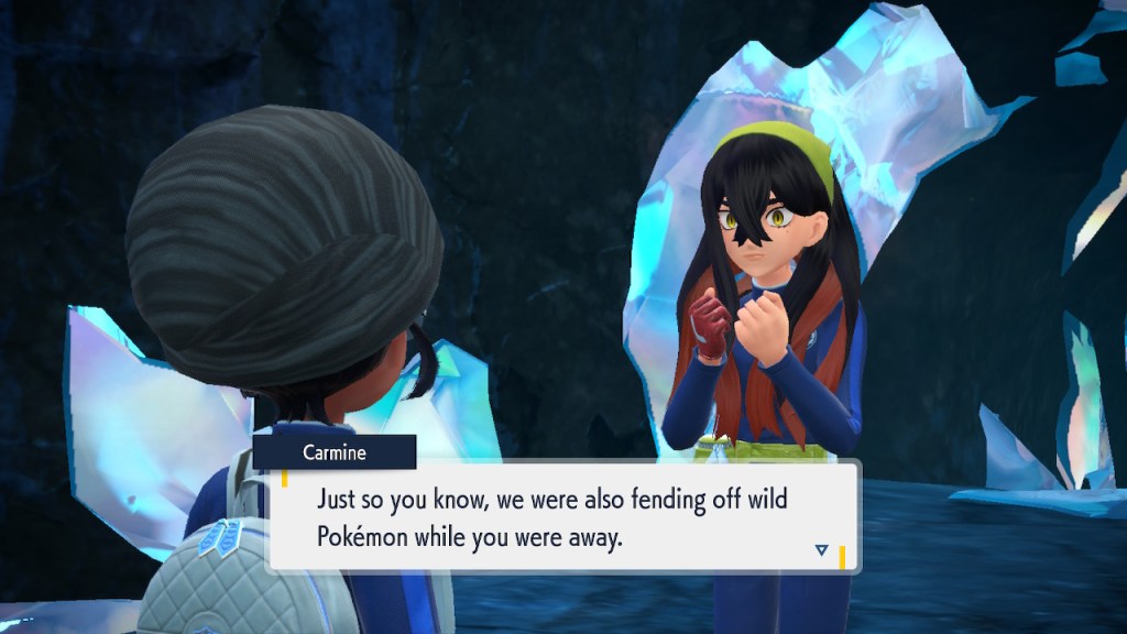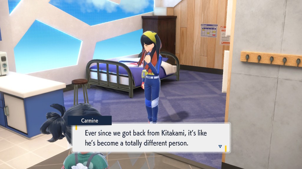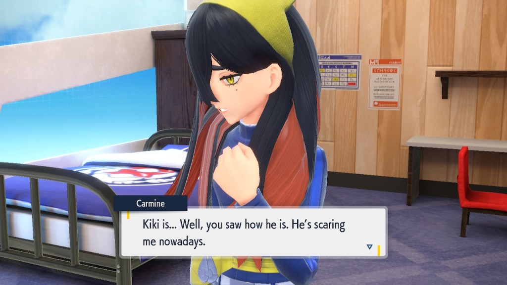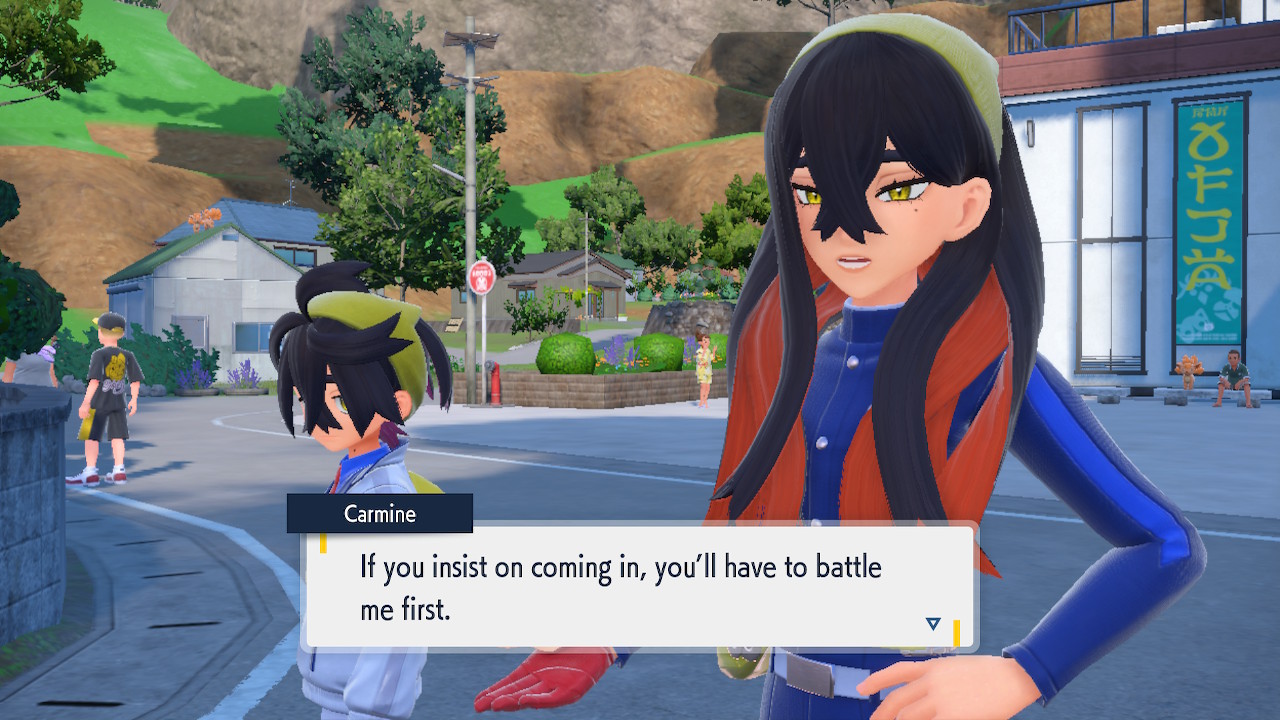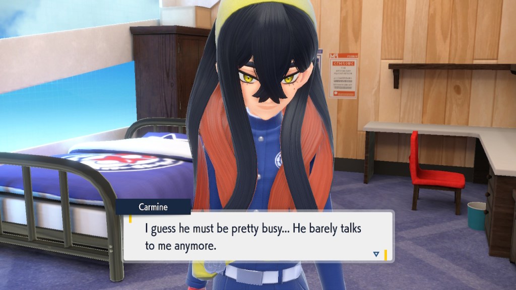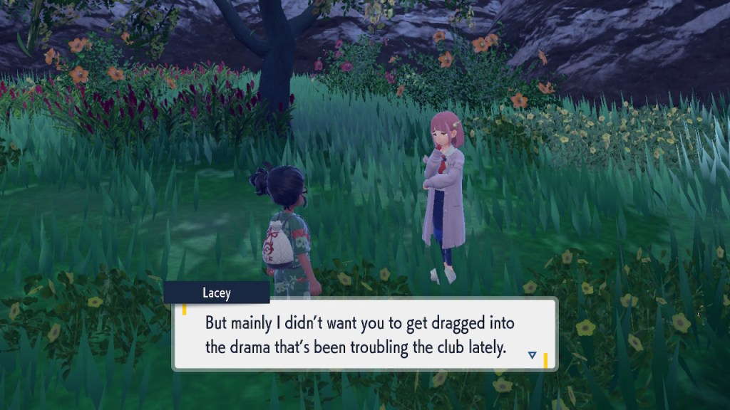 When we first meet Kieran he’s pretty heavily reliant on Carmine. He’s hiding behind her when we first meet him. While he doesn’t exactly agree with everything Carmine says or does he isn’t very assertive about it. For Carmine’s part she’s perfectly willing to help him out and take the lead. However when the player character and Ogerpon show up it throws a wrench in that dynamic. Kieran stops being her meek and subservient little brother and lets jealousy flourish. She doesn’t really know how to handle the change. To be fair to her, it would probably be difficult for anybody to handle. Yet Carmine’s abrasive personality certainly doesn’t do her any favors. It must be difficult to be a sibling at odds with one another. Especially if you still live together. You can’t exactly sever ties, you’re going to have a bond regardless. But if things can’t flow like they usually do and you don’t know how to fix it that must be a difficult feeling.
