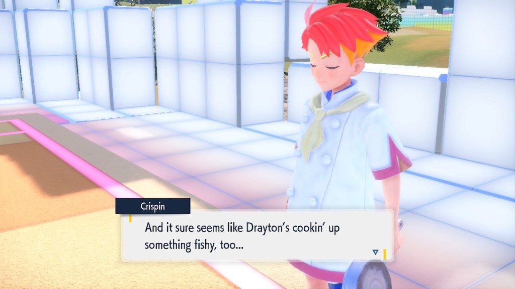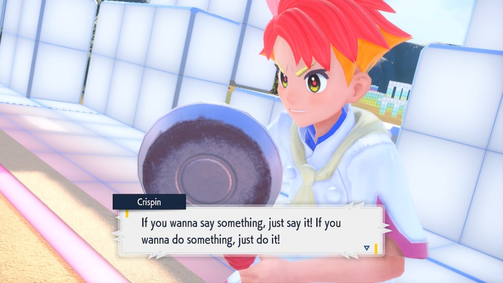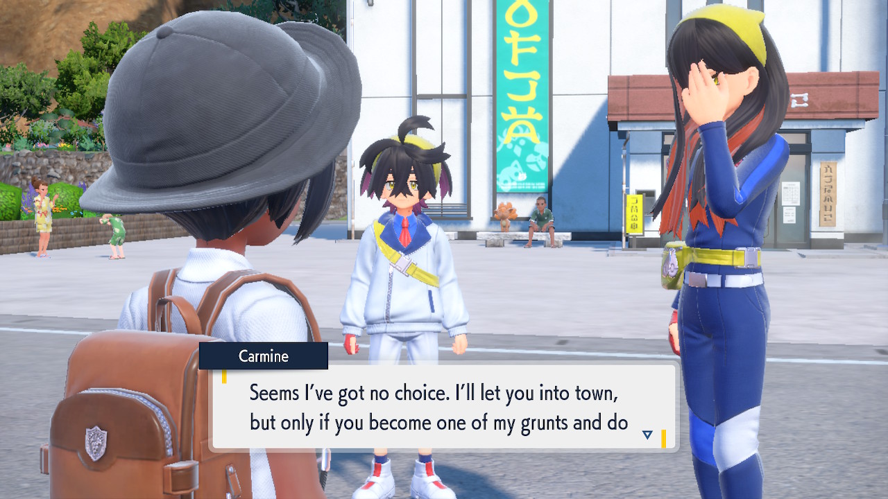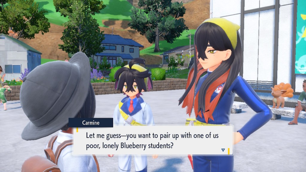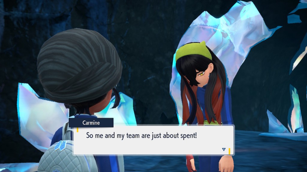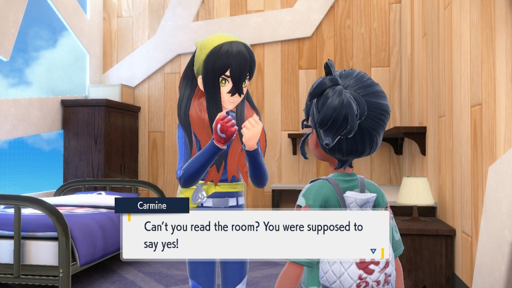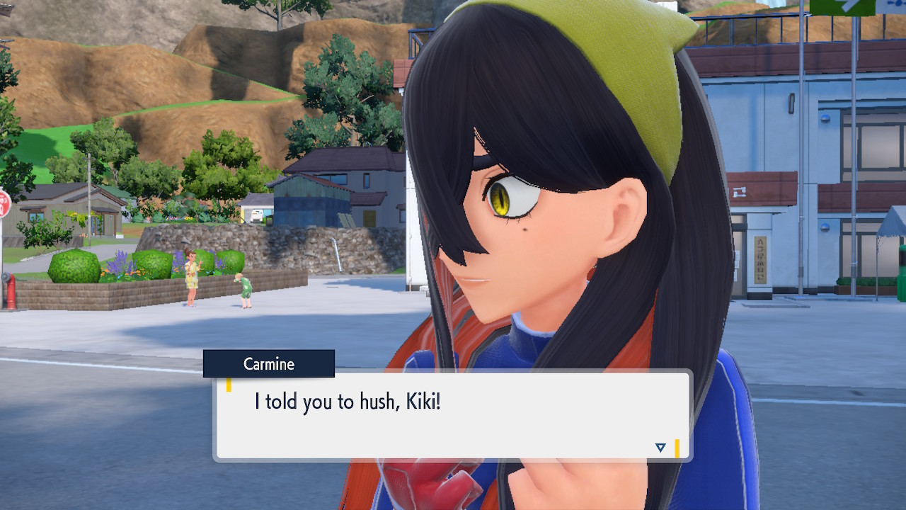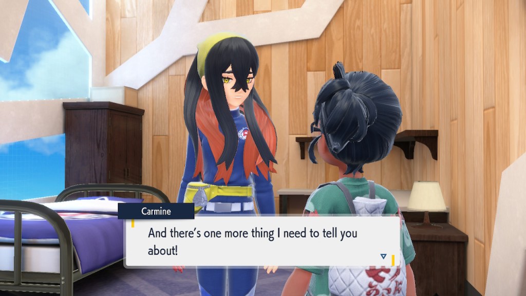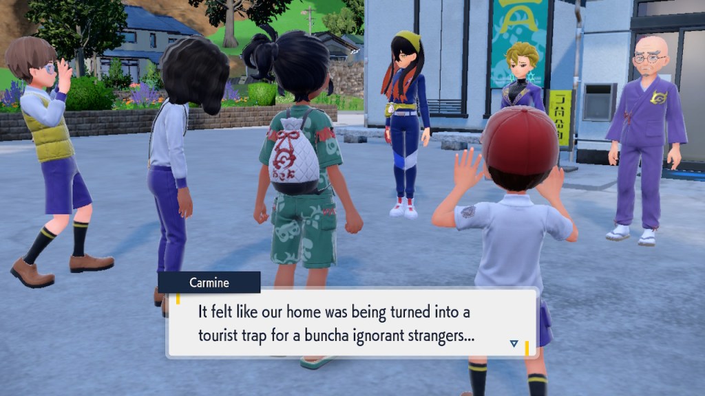 When we first meet Kieran he’s pretty heavily reliant on Carmine. He’s hiding behind her when we first meet him. While he doesn’t exactly agree with everything Carmine says or does he isn’t very assertive about it. For Carmine’s part she’s perfectly willing to help him out and take the lead. However when the player character and Ogerpon show up it throws a wrench in that dynamic. Kieran stops being her meek and subservient little brother and lets jealousy flourish. She doesn’t really know how to handle the change. To be fair to her, it would probably be difficult for anybody to handle. Yet Carmine’s abrasive personality certainly doesn’t do her any favors. It must be difficult to be a sibling at odds with one another. Especially if you still live together. You can’t exactly sever ties, you’re going to have a bond regardless. But if things can’t flow like they usually do and you don’t know how to fix it that must be a difficult feeling.