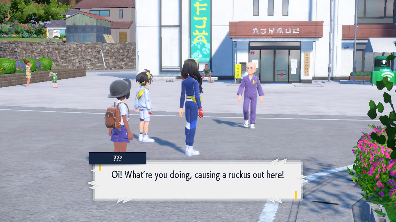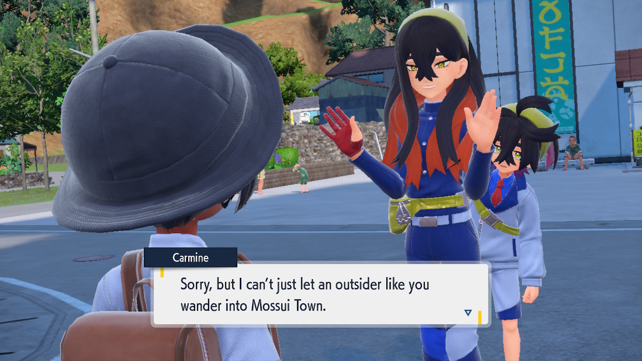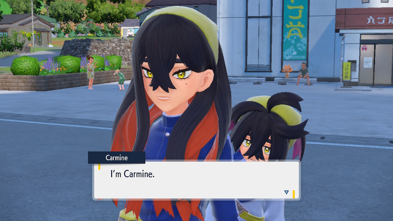 Oh hey, the DLC actually does have some nice landscapes to traverse. Well, they’re not amazing or anything, but they certainly look better on average. This applies to both Teal Mask and Indigo Disk, but let’s focus on one part at a time. Teal Mask takes us to Kitakami, a homely island that’s more traditionally minded than Paldea. Soon after we arrive we’re introduced to this DLC’s power sibling duo: Kieran and Carmine.