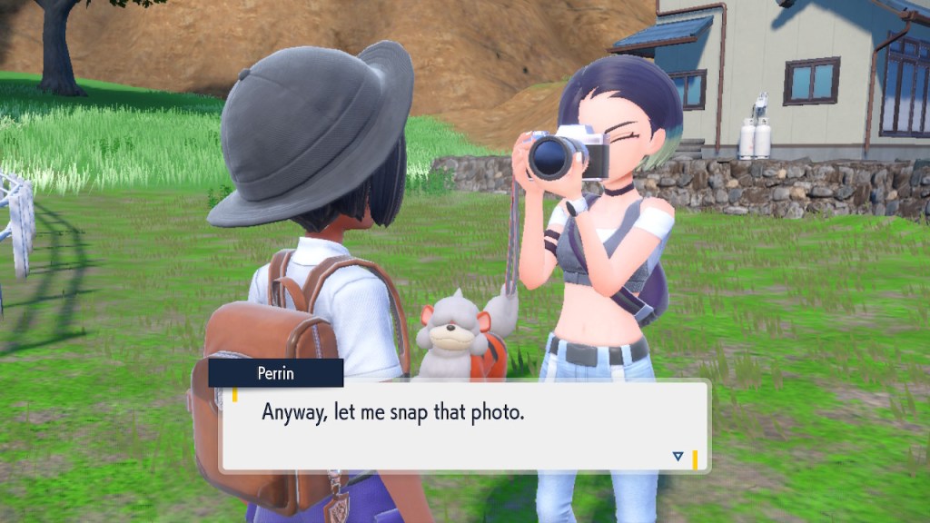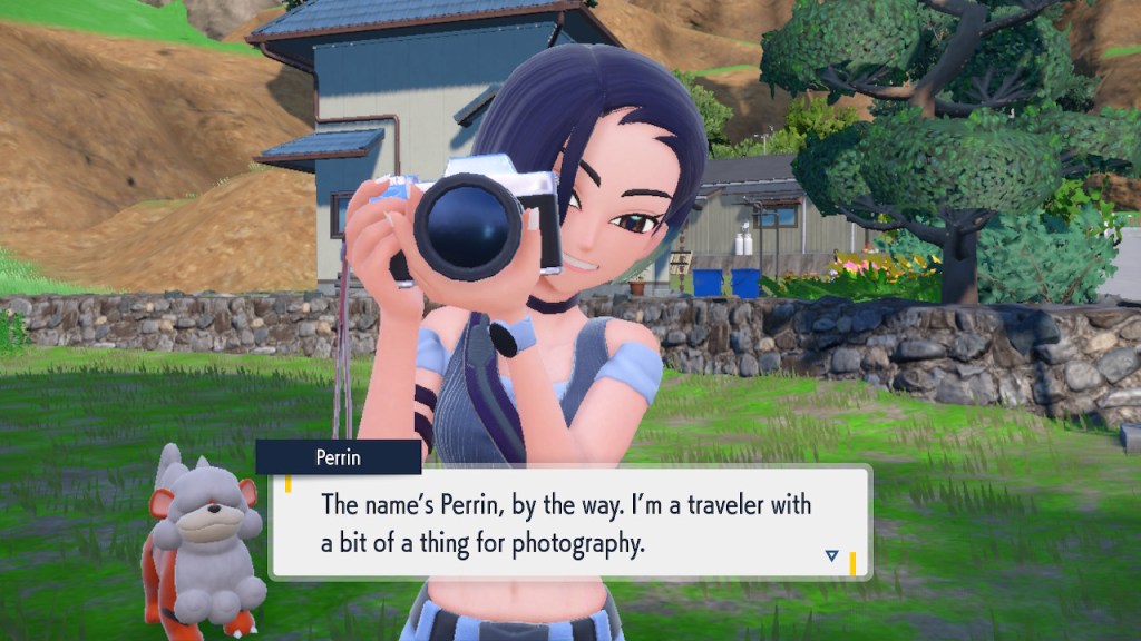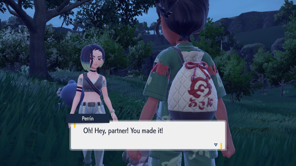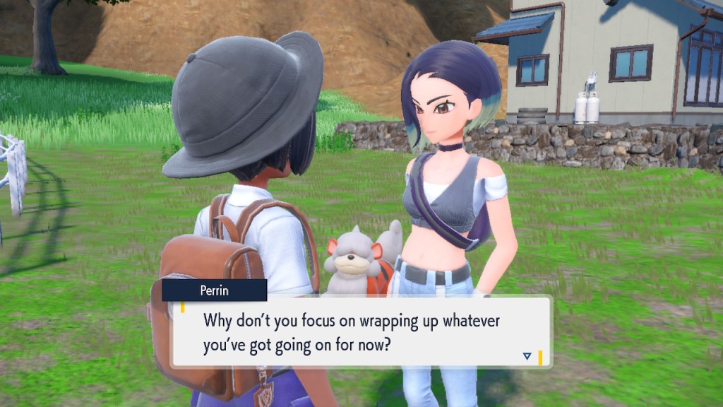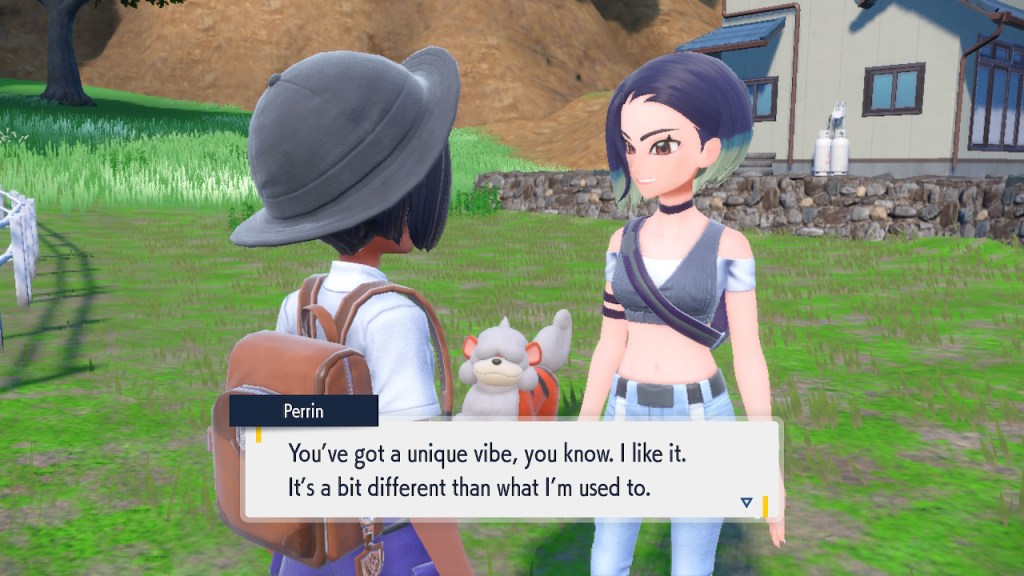 Before I get too deep into that, let’s talk about someone who makes a far stronger first impression, Perrin. I’ve been aware of Perrin well before I met her in-game. After all, she’s designed by Take, who I hold in high esteem. Before he got involved with Pokemon he did the illustrations for Katanagatari and Zaregoto, which I’m rather fond of. Then when he got into Pokemon he went ahead and produced some all time greats. Like Nessa’s probably the most gorgeous Pokemon character to date as far as I’m concerned. Then he went ahead and brought us Scarlet and Violet’s hottest character in the form of Perrin. Am I just saying that because I have a thing for midriffs? I mean, that’s certainly part of it, but the whole design’s a W. So I was plenty interested in getting the chance to see what she’s about.