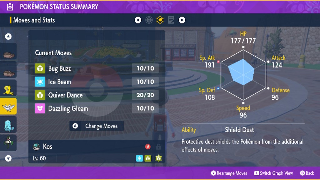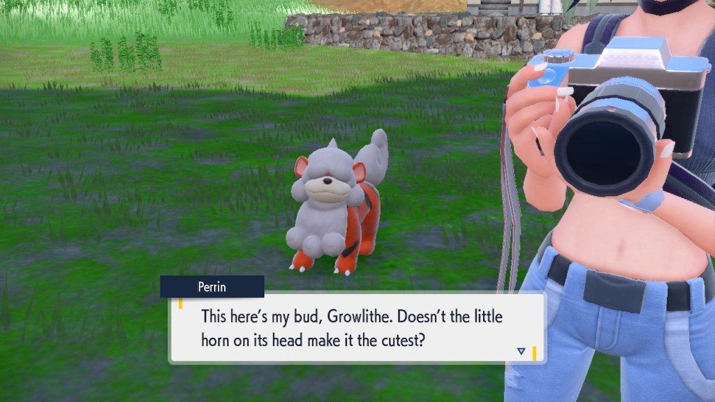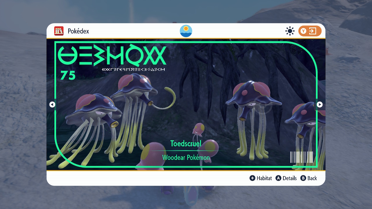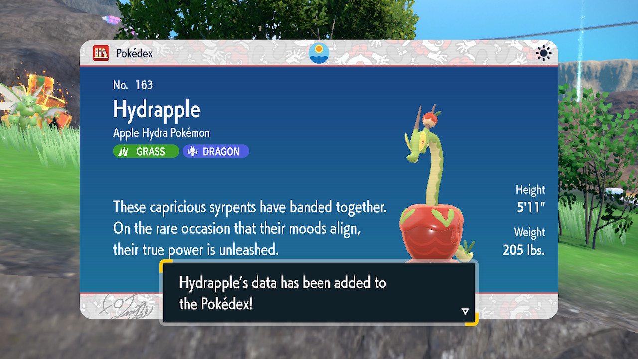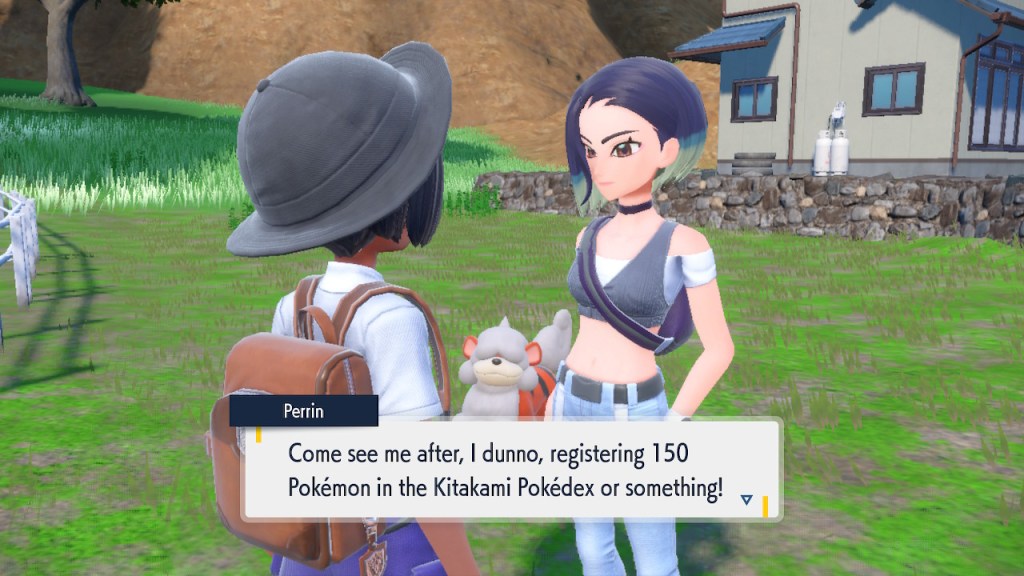 So that’s what I did, but before that, I had some unfinished business to take care of. As much as I like the sibling duo I can’t forget about Perrin. I put some work in catching Pokemon along the Teal Mask journey, but I was still below 150. So I had to grind. Honestly, as tedious as catching so many Pokemon can be, there is one part I appreciated about it. In this game the Pokedex doesn’t just give you information about the Pokemon, it shows you a picture of how they live in the wild. These details bring the world to life in a substantial way. Now if only we could actually see the kind of stuff we see in the Dex photos in-game…