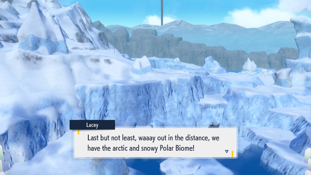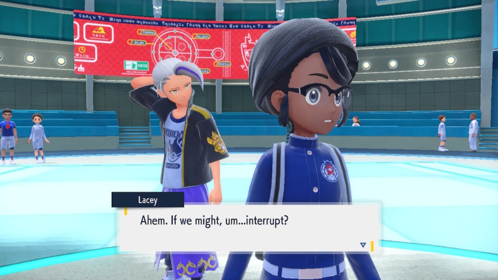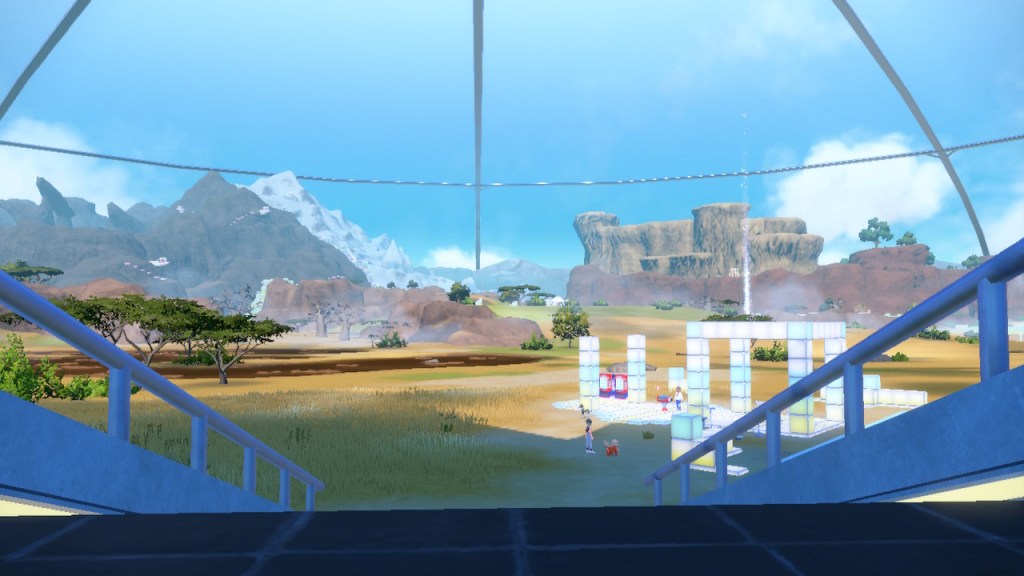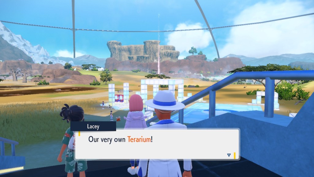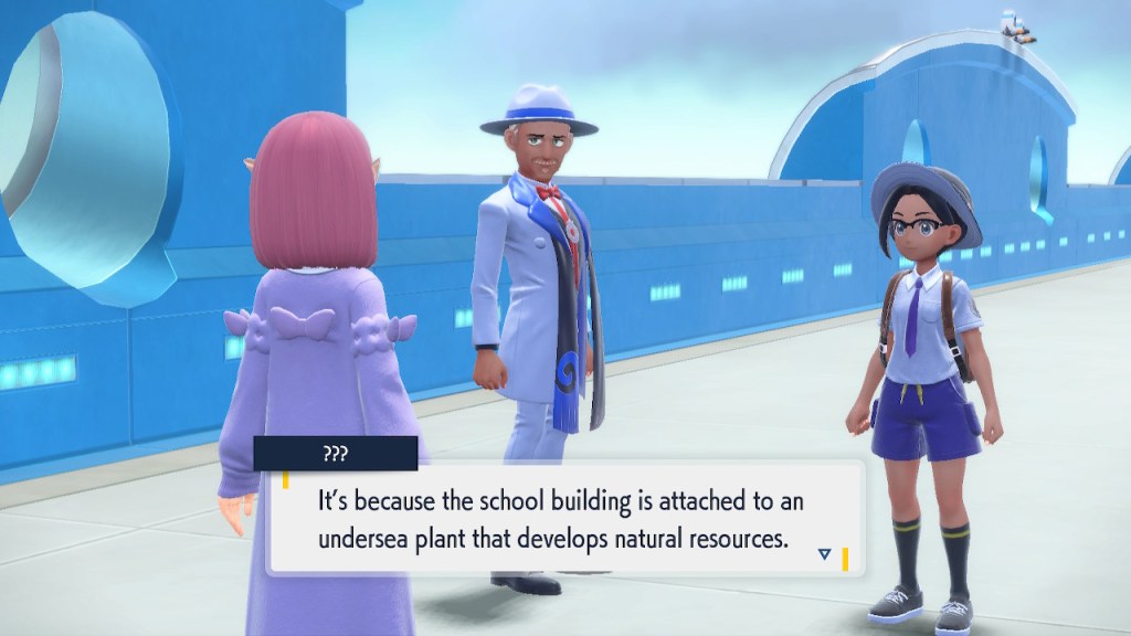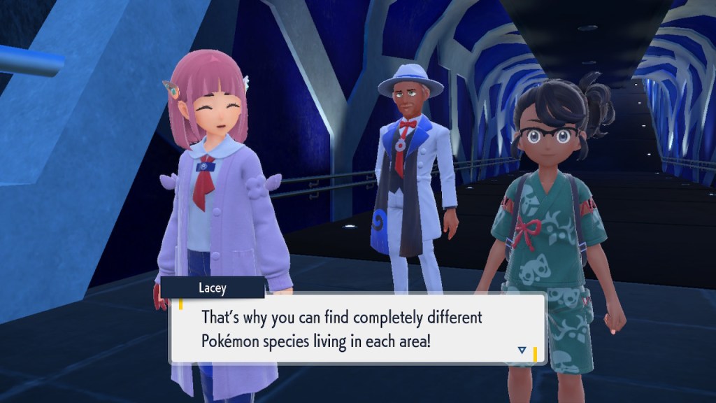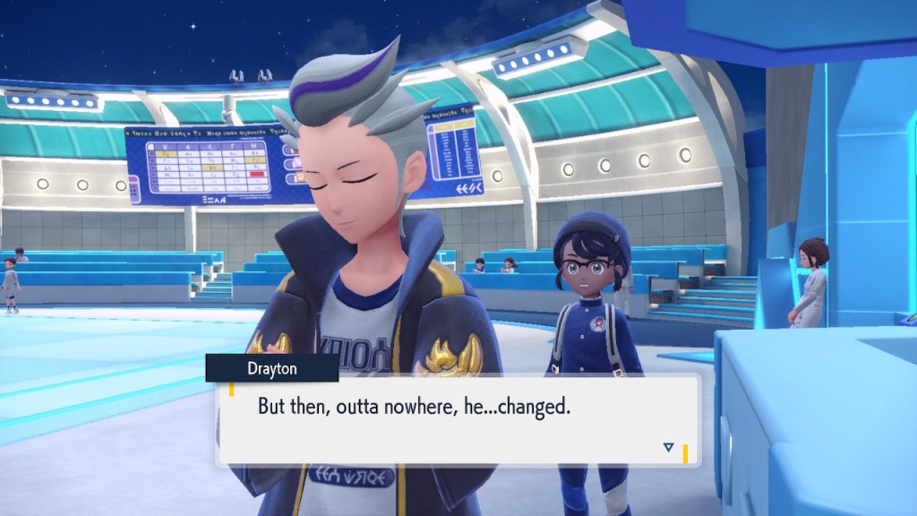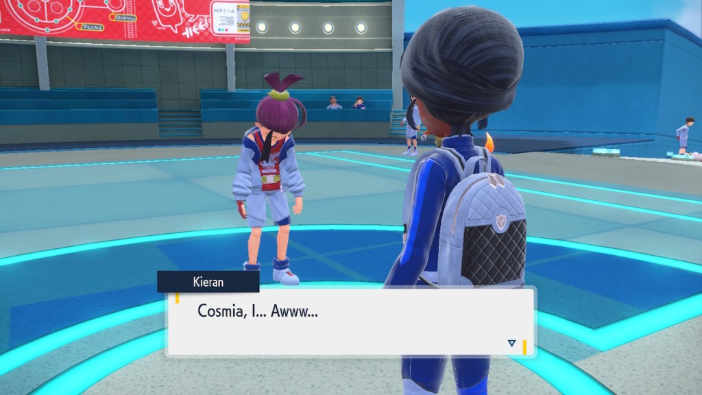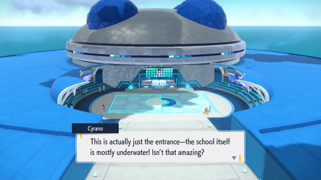 Well, this is a cool idea. It hardly makes any sense that these biomes could be right next to each other in open air. Even if the humidity and temperature were well regulated within each biome that sharp transition is pretty much impossible. Air doesn’t just stay in a straight line. Setting the scientific absurdity aside, it’s a cool concept. It still has that janky looking quality to it that tends to plague the rest of the game’s landscapes. It looks better than Kitikami outside and worse inside. Still better than Paldea on average, so that’s nice. The concept is there, a more capable 3D modeler could’ve done something incredible with it. Instead we get this looks good if you squint but even then not that good thing. But seriously, how high is that tuition cost? And who the hell are Carmine and Kieran’s parents? They must have some sort of prestige to get them into this place.