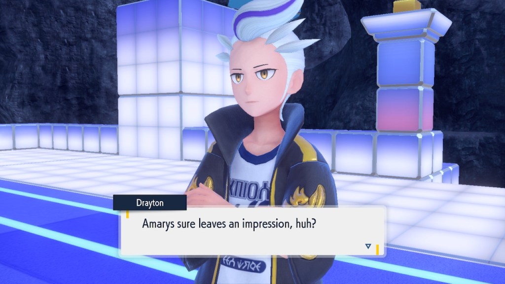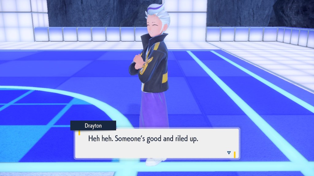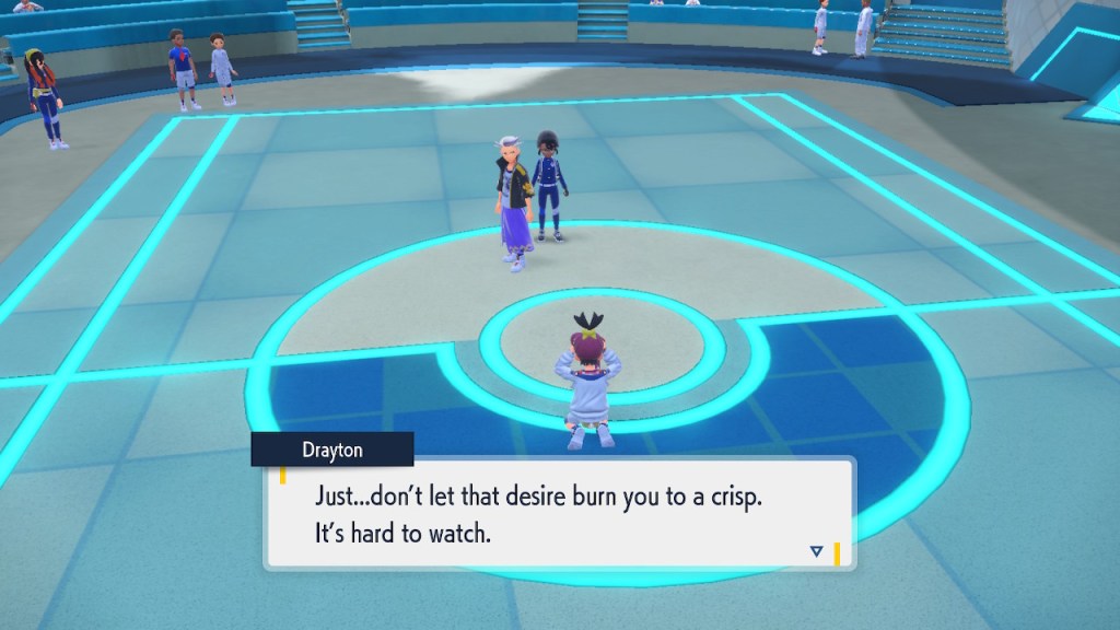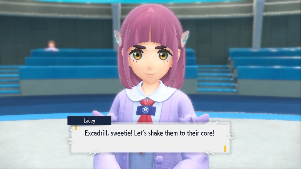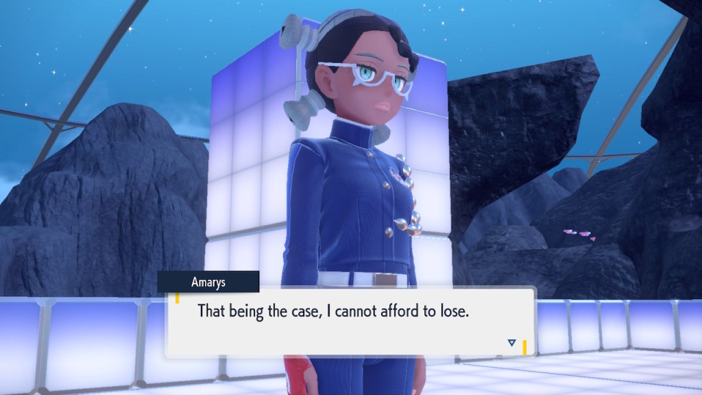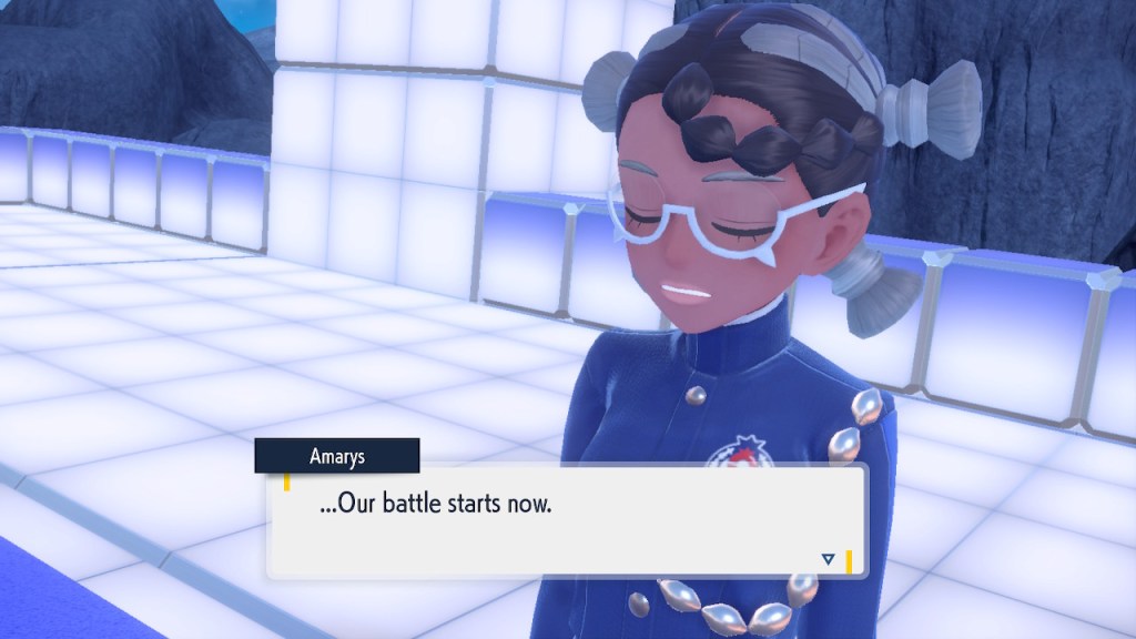 I’m probably showing too much dialogue in the slideshows. I’m barely even talking about most of it. Honestly I just like the writing quite a bit, I got the screenshots saved, and I’d like to show them off. So yeah, Amarys isn’t just some hard ass. She’s not exactly the biggest player here but she’s got her fair share of nuance and personality any way. More than I can say about a lotttttttttttt of Elite Four members. Also, I complained about the Paldean Elite Four arena but I’m not complaining about these ones. These ones look nice, and they all got different colors to suit the respective members.
