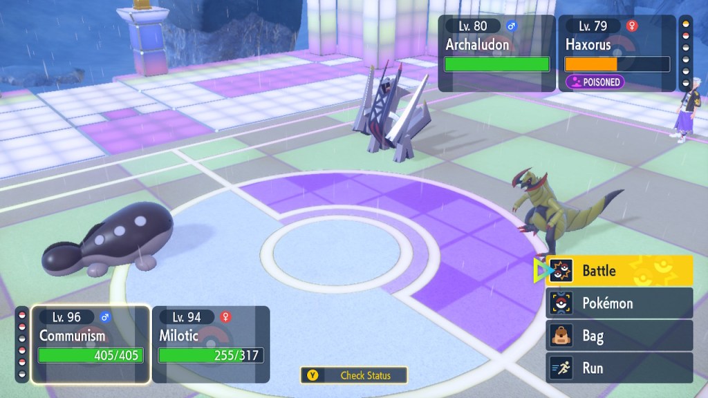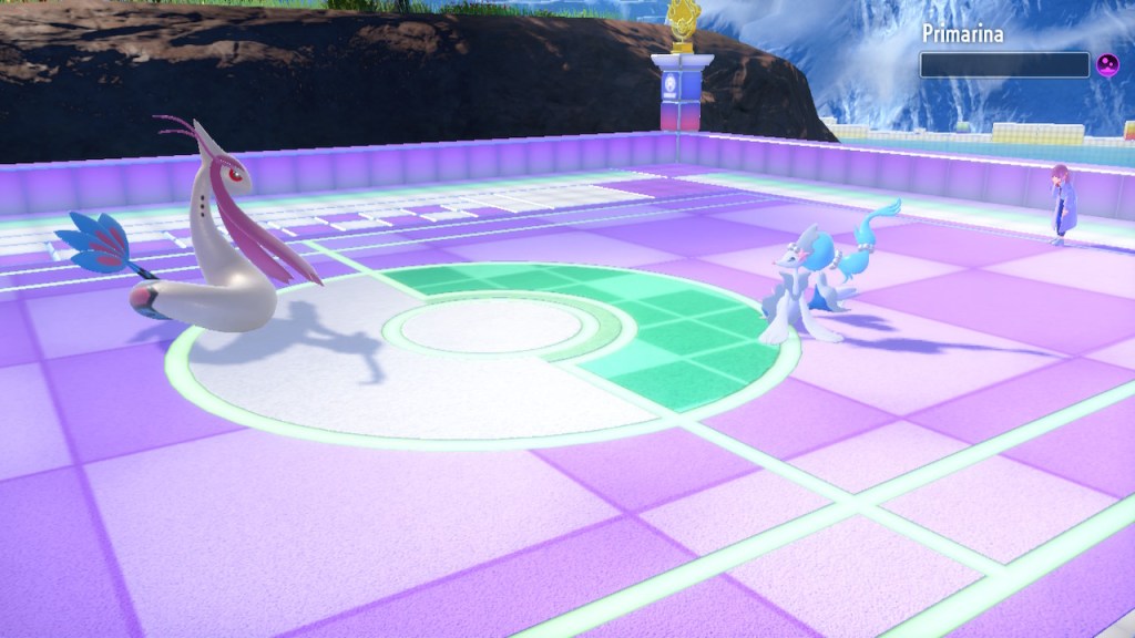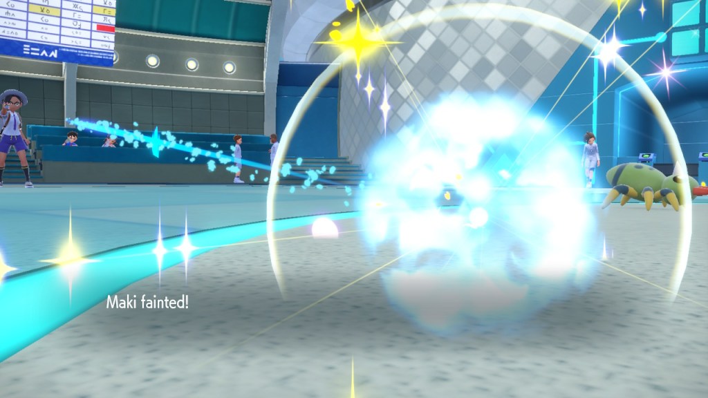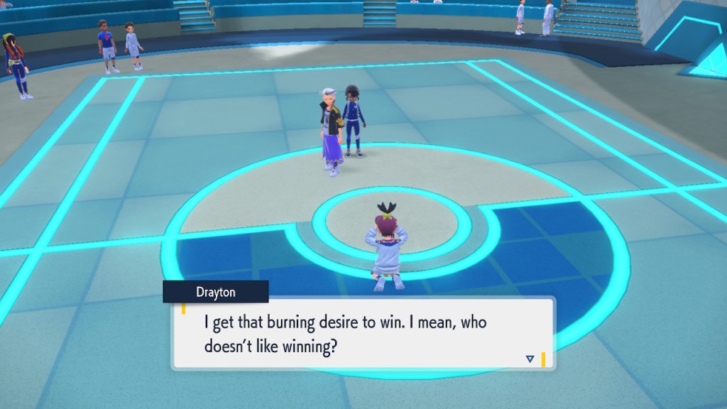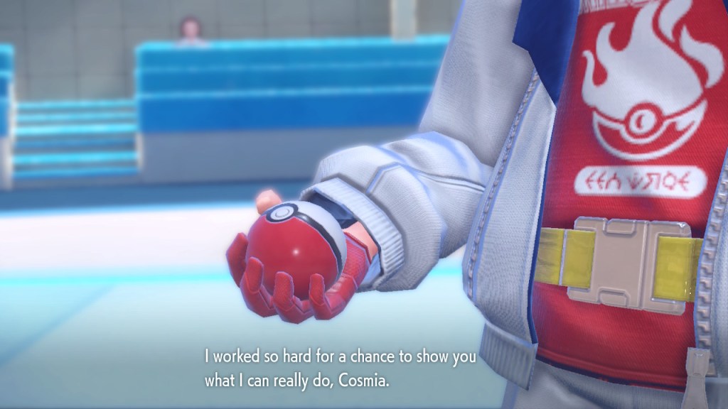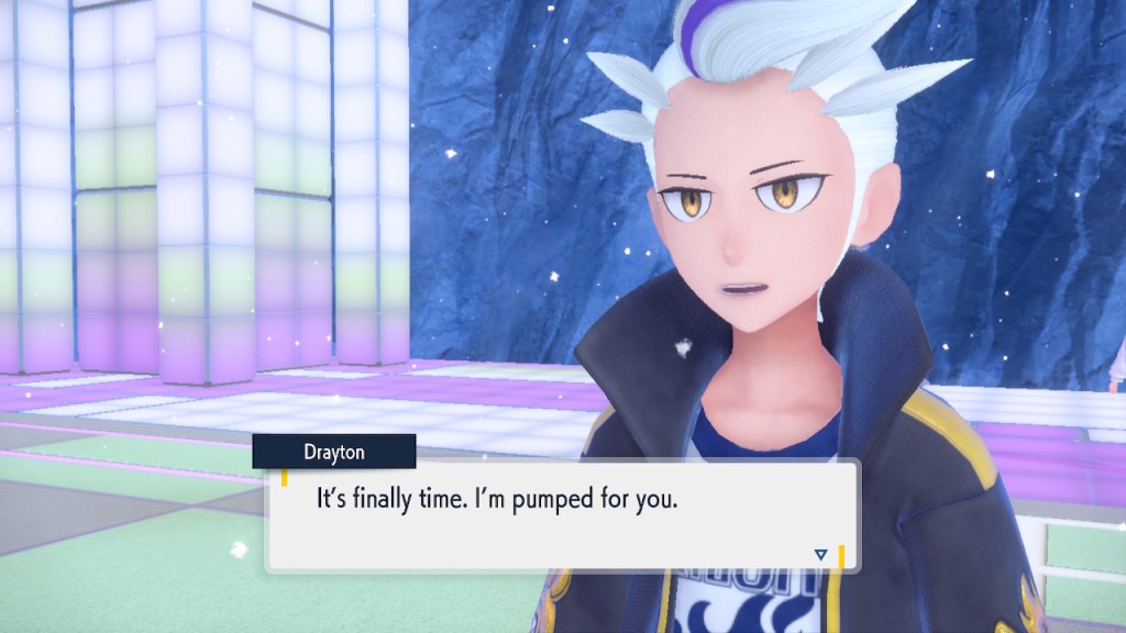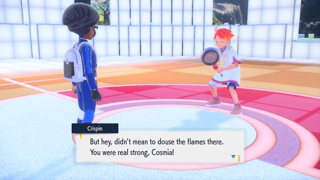 I’m probably showing too much dialogue in the slideshows. I’m barely even talking about most of it. Honestly I just like the writing quite a bit, I got the screenshots saved, and I’d like to show them off. So yeah, Amarys isn’t just some hard ass. She’s not exactly the biggest player here but she’s got her fair share of nuance and personality any way. More than I can say about a lotttttttttttt of Elite Four members. Also, I complained about the Paldean Elite Four arena but I’m not complaining about these ones. These ones look nice, and they all got different colors to suit the respective members.