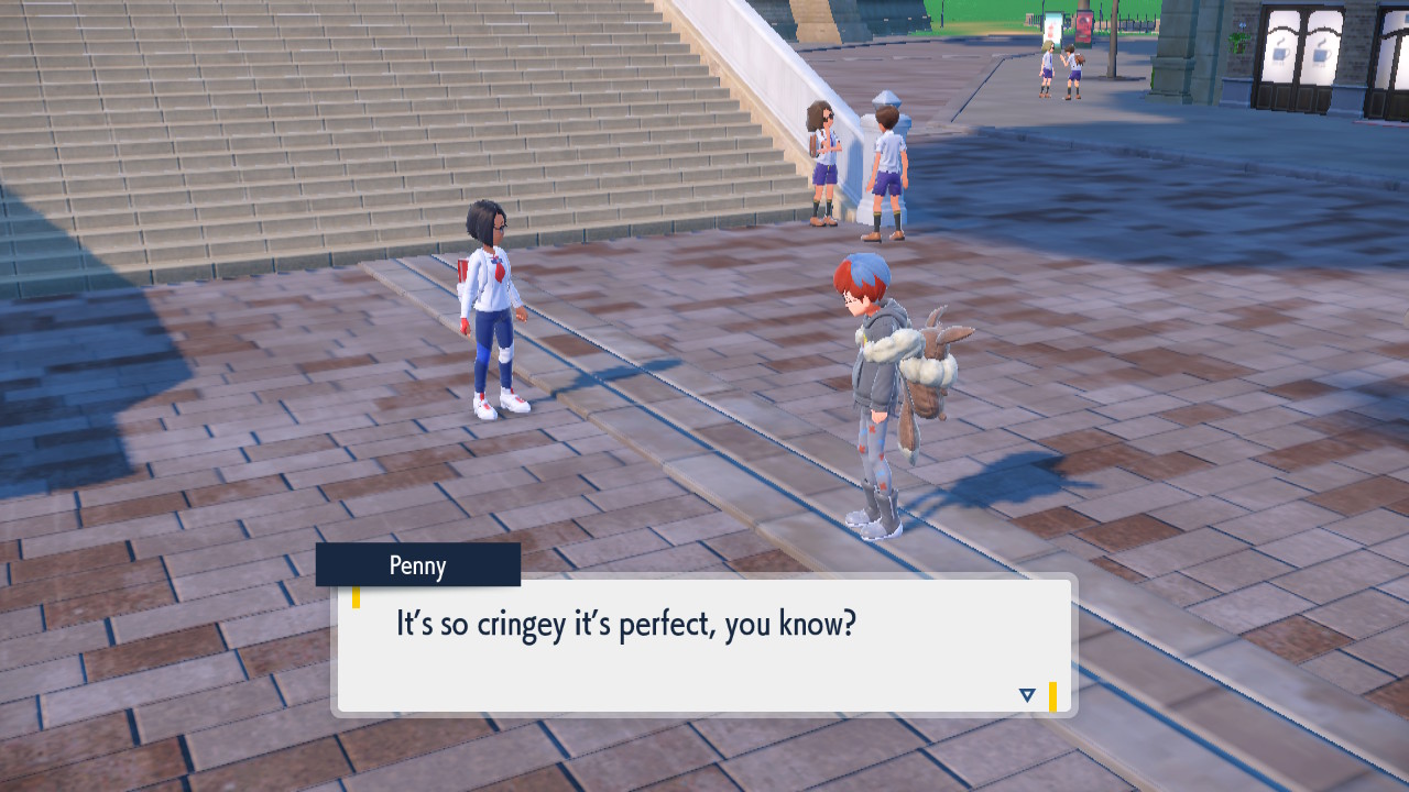 So with the Pokemon out of the way let’s talk about the human cast and… honestly, I have more to say about the DLC characters than the base game ones. Like, Nemona’s cool. Her chipper enthusiasm and hyperobsession with battling makes her a plenty likable rival. Like she’s a bit of a goofy weirdo about it. Presented as a genuine challenger (kinda) but not taking themselves too seriously. I’m pretty sure I’ll remember her for a while. I can’t say that about whoever the fuck the last 3 rivals were. There was some chubby kid and uhhh… no wait the blonde guy’s the Sinnoh one. Marnie’s cool too. You get the point, gotta like Nemona. I like Penny and Arven too well enough. Penny’s got her snarky lines sometimes. Arven’s got his daddy issues. They’ve got their decent character arcs. And the fact that they have character arcs at all is a bit remarkable for a Pokemon game. I guess it kind of happened sometimes in the past. I think N had something, that Wally kid kind of did, but not like this. There isn’t *that* much here either, but it’s more than before. And I appreciate that change.