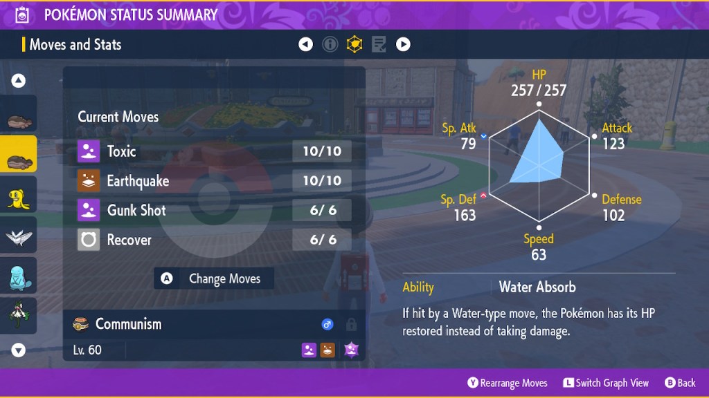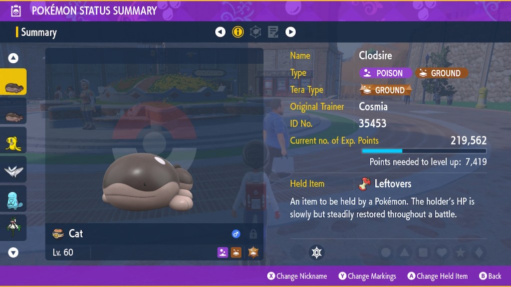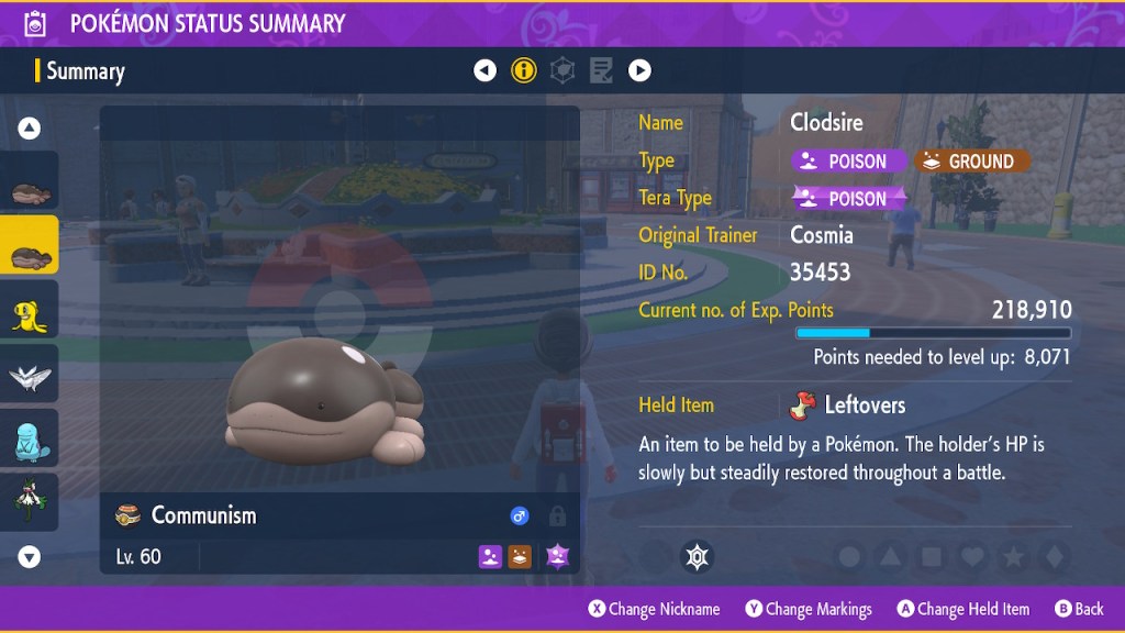 On another note I feel I should give a bit of explanation to a couple of my Pokemon’s nicknames. Namely Fish the Meowscarada and Communism the Clodsire. I named my cat starter that happens to be female after a female cat of my own, Fish. Why did I name my cat Fish? It seemed like a funny name to my preteen self so it stuck. Fish was an interesting creature. Rather shy at first but she warmed up to me. Still never liked getting picked up and rarely had much interest in my lap. She mostly liked to laze around and usually only got yappy in the quest for food. She was a pretty big cat but she had a sort of squeaky voice. She drove my mom insane sometimes. She was my best friend during the pandemic. I didn’t get to see her off when she died. I miss her dearly.